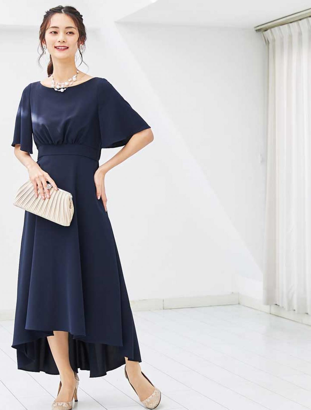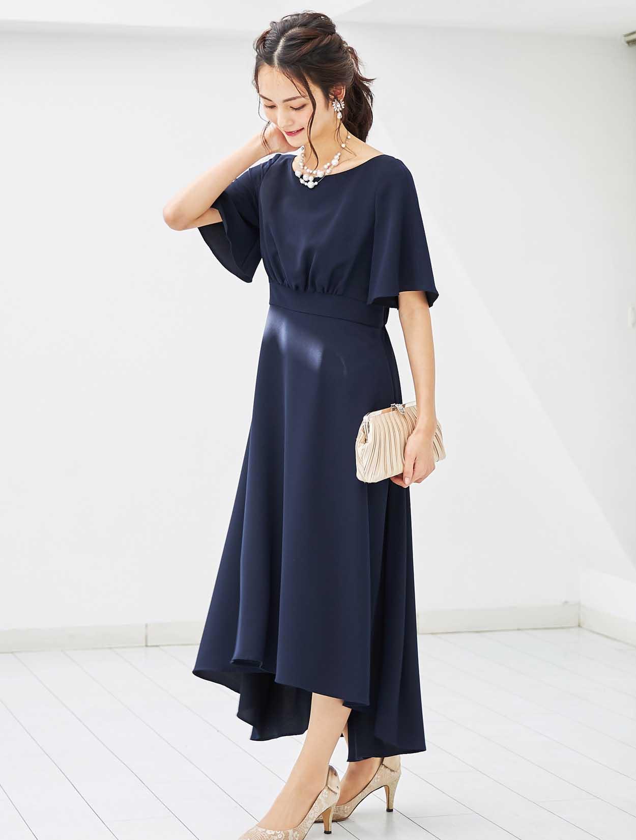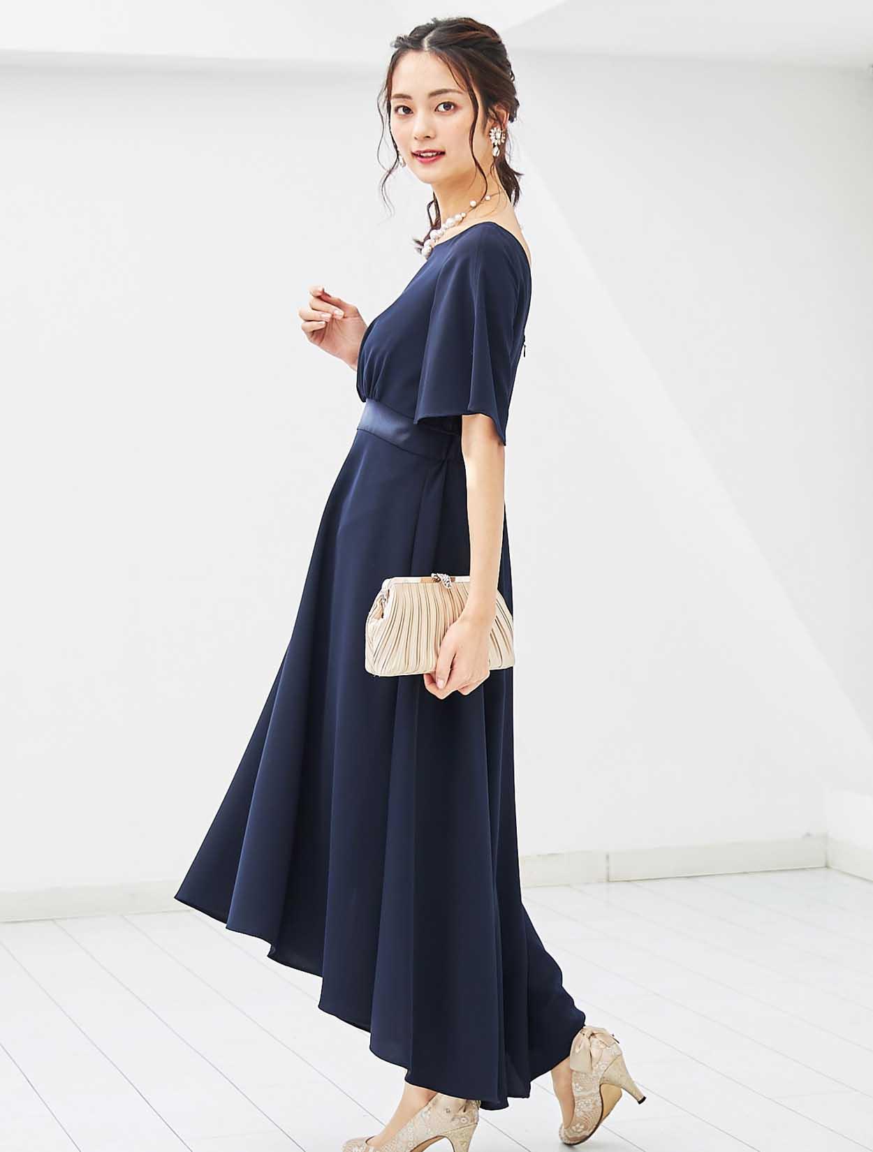 シックなネイビーのロングドレスは、大人の女性にぴったりのドレスです。