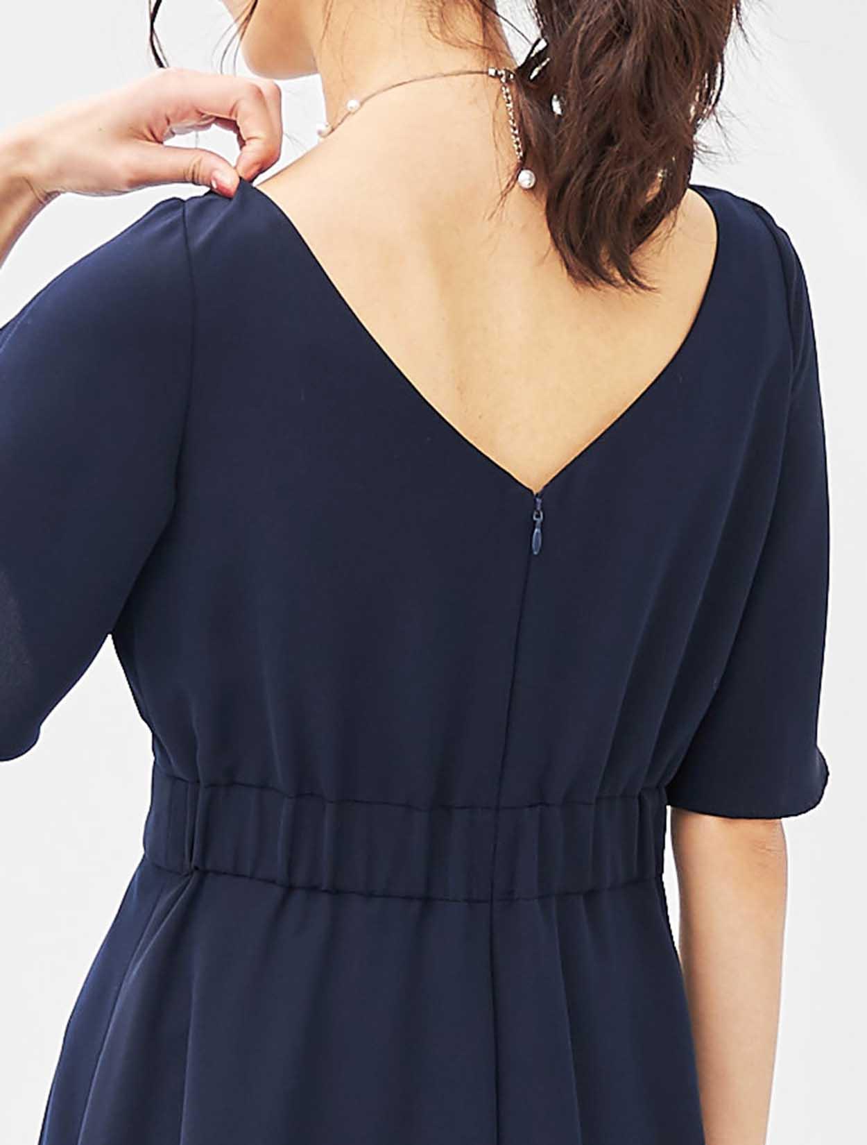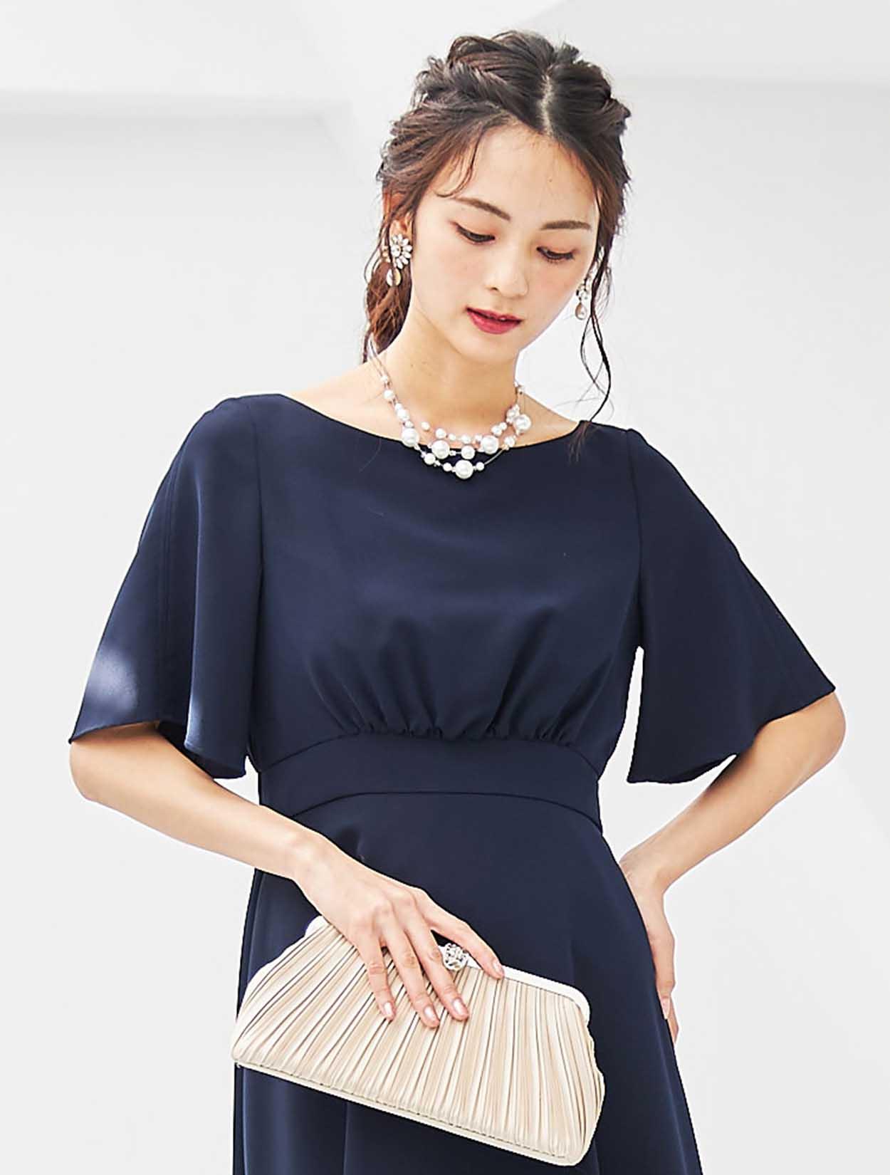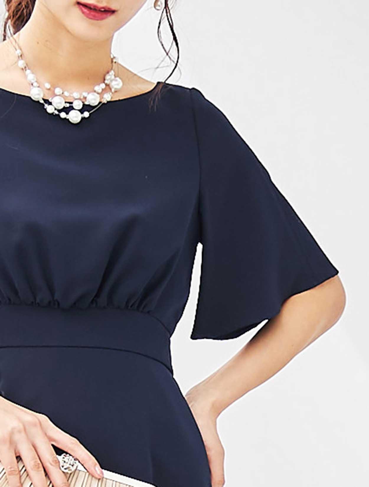 ランダムにちりばめられたパールネックレスが、清楚なネイビードレスに遊び心をプラス。
