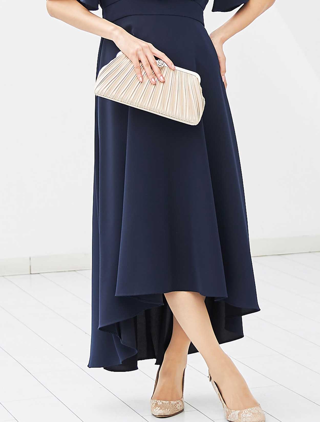 上品なベージュのプリーツバッグが、美しい落ち感のドレスデザインをより女性らしくエレガントに見せてくれます。