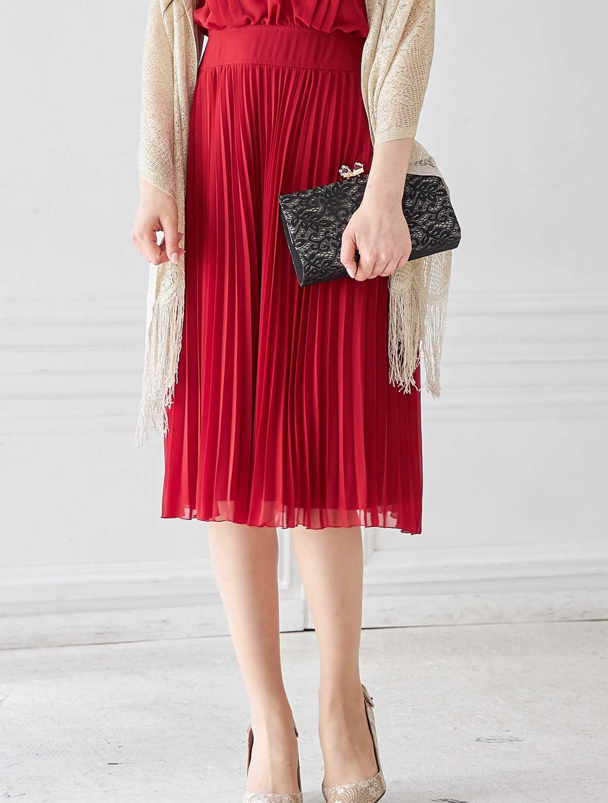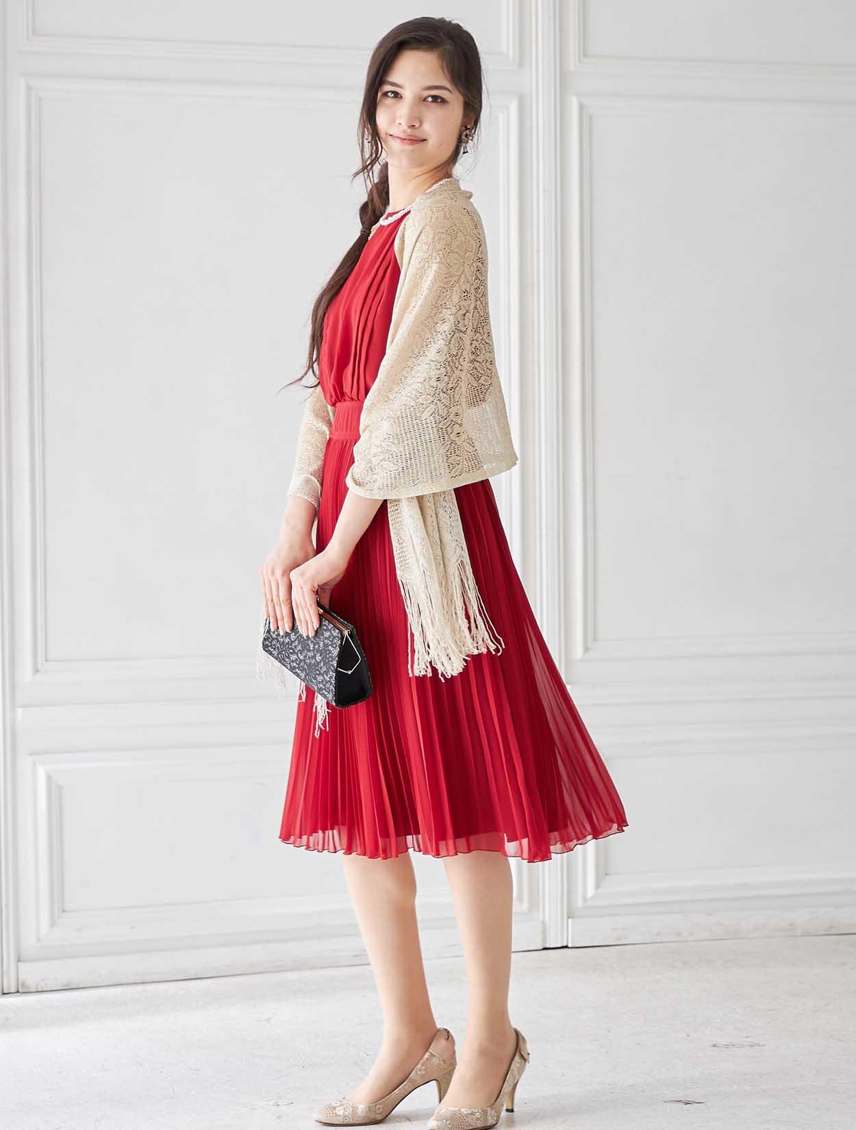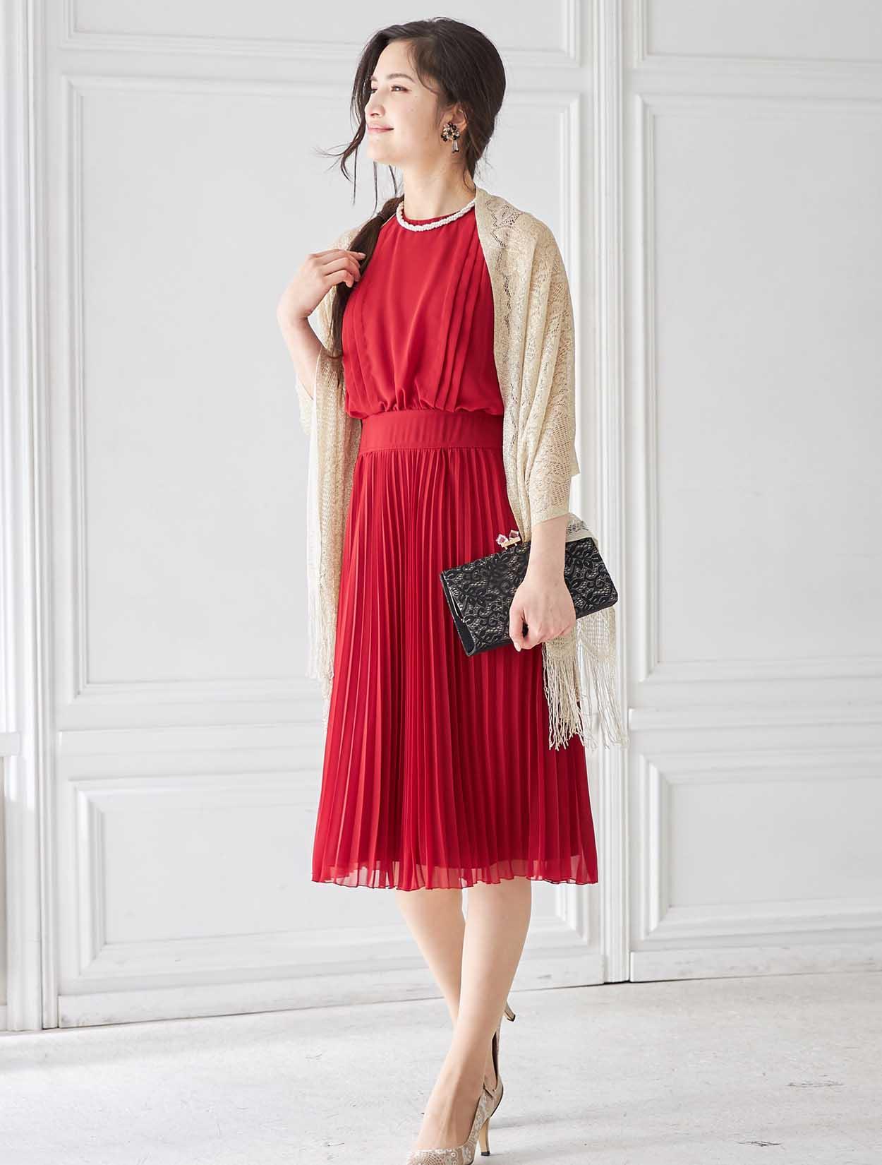 鮮やかレッドのトレンドプリーツドレス
