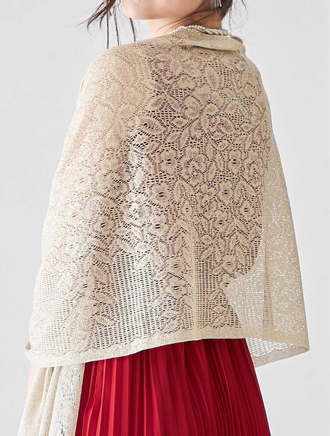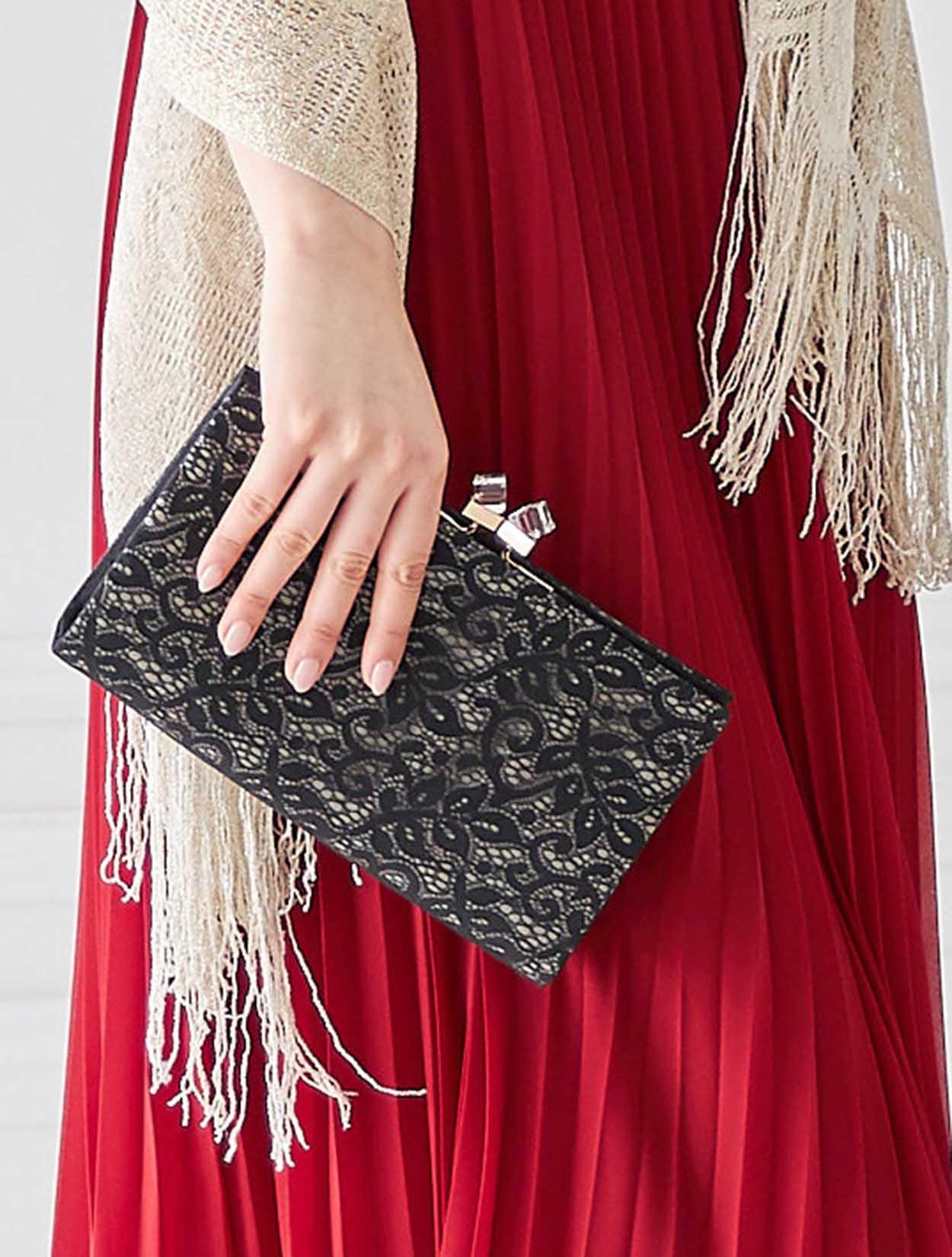 キラキラと華やぐレースショールに、ブラックレースを重ねたバッグが色目を抑えた大人スタイル。
