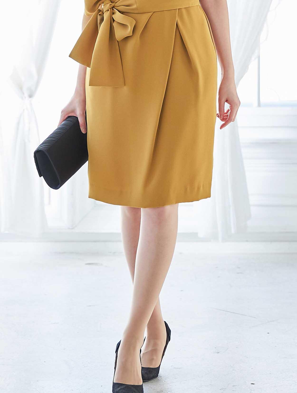 サイドに流れるビスチェ風デザインが立体感のある表情に。美しいカーブラインのコクーンシルエットはさり気なくヒップ周りをカバー。