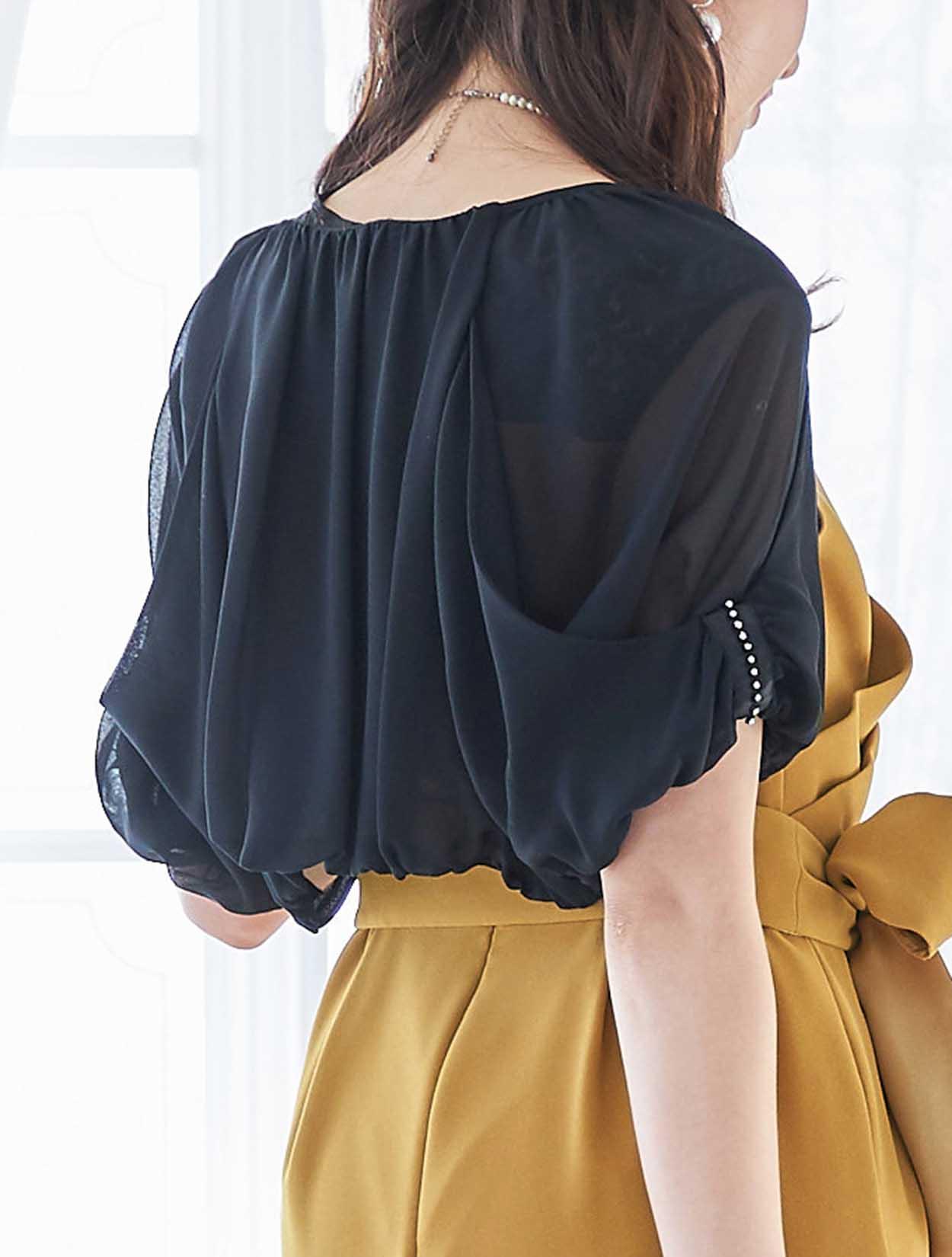 はっきりした色合いながらも、バルーンスリーブのボレロが柔らかな女性らしい表情をプラスしてくれます。