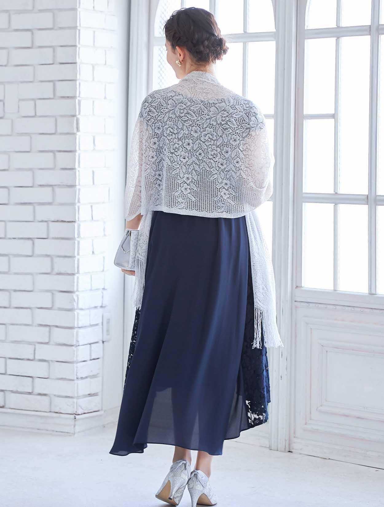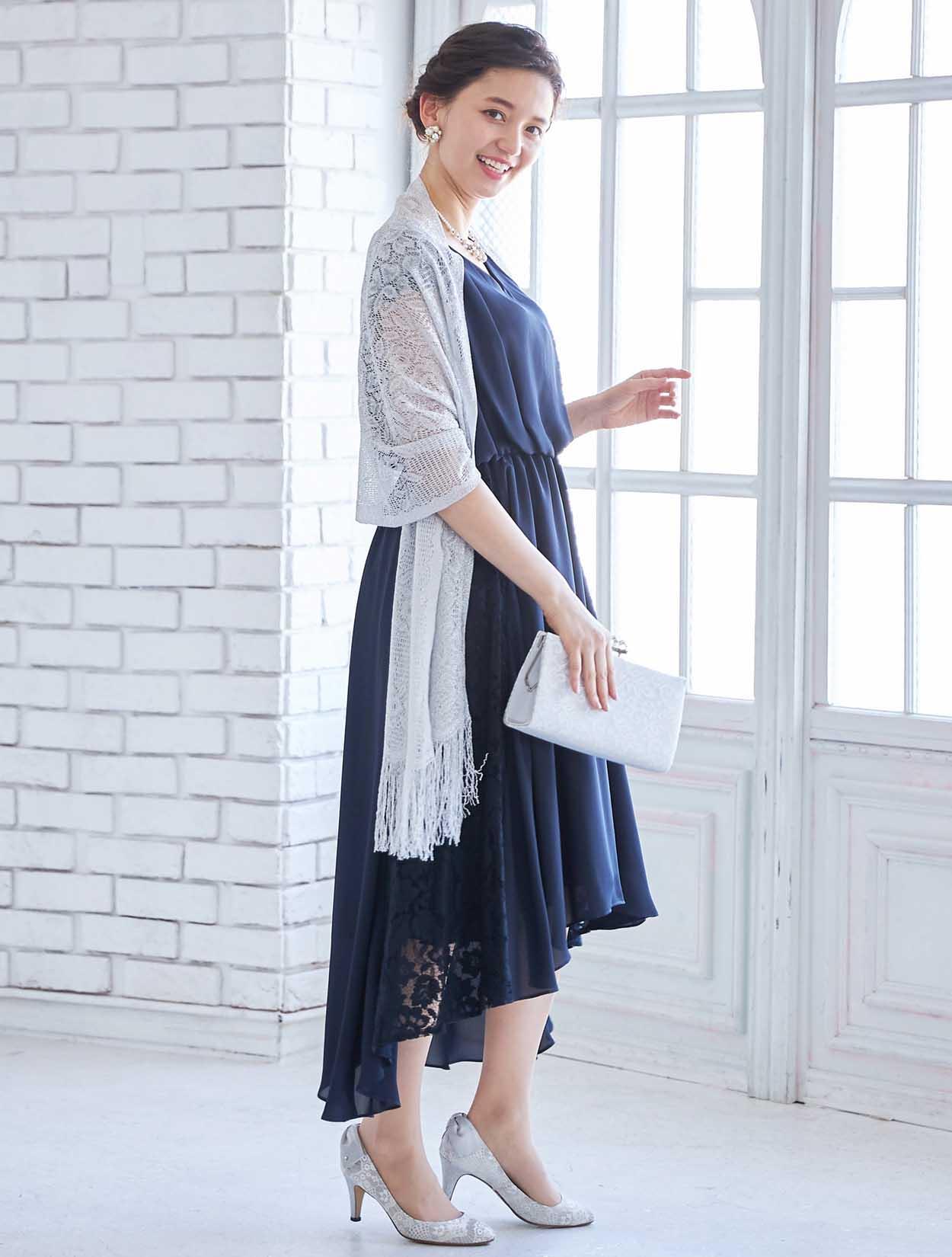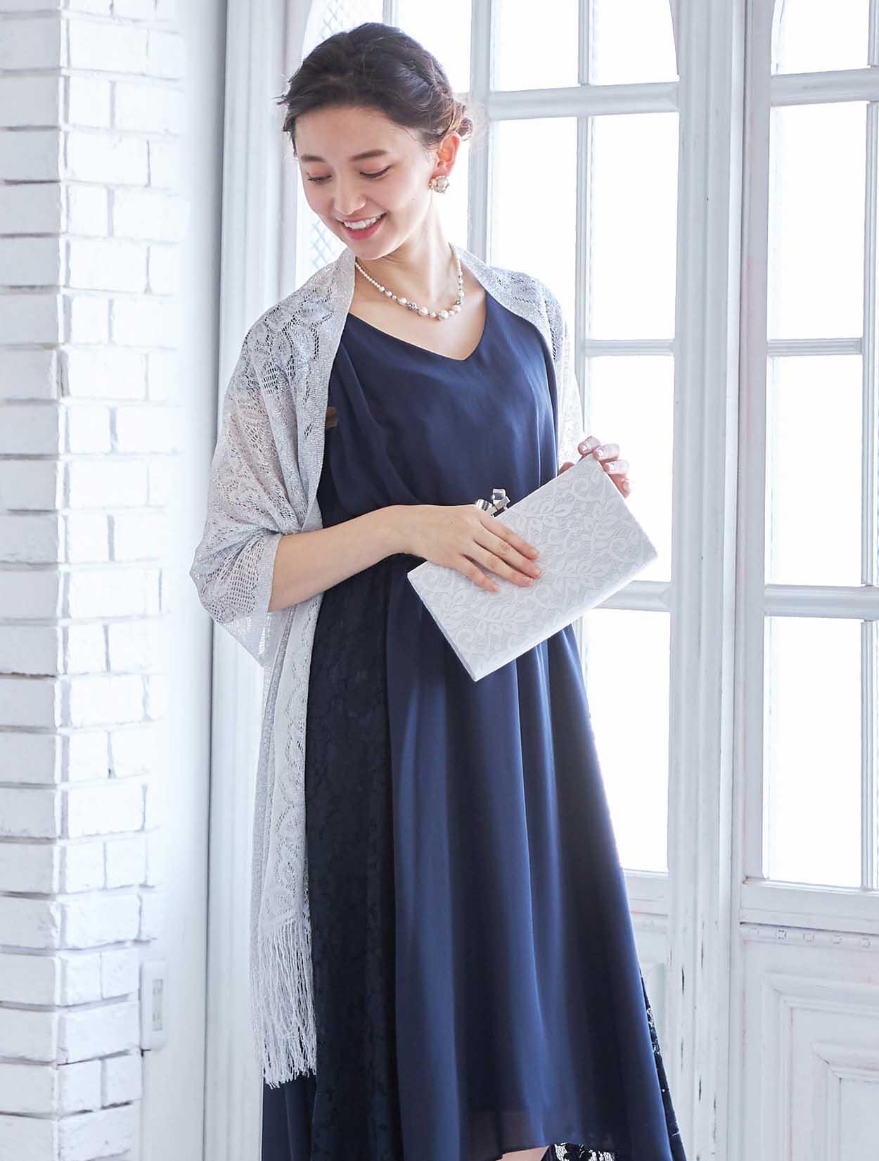 人気のネイビーにシルバーのショールとバックを合わせた大人っぽいコーディネート。