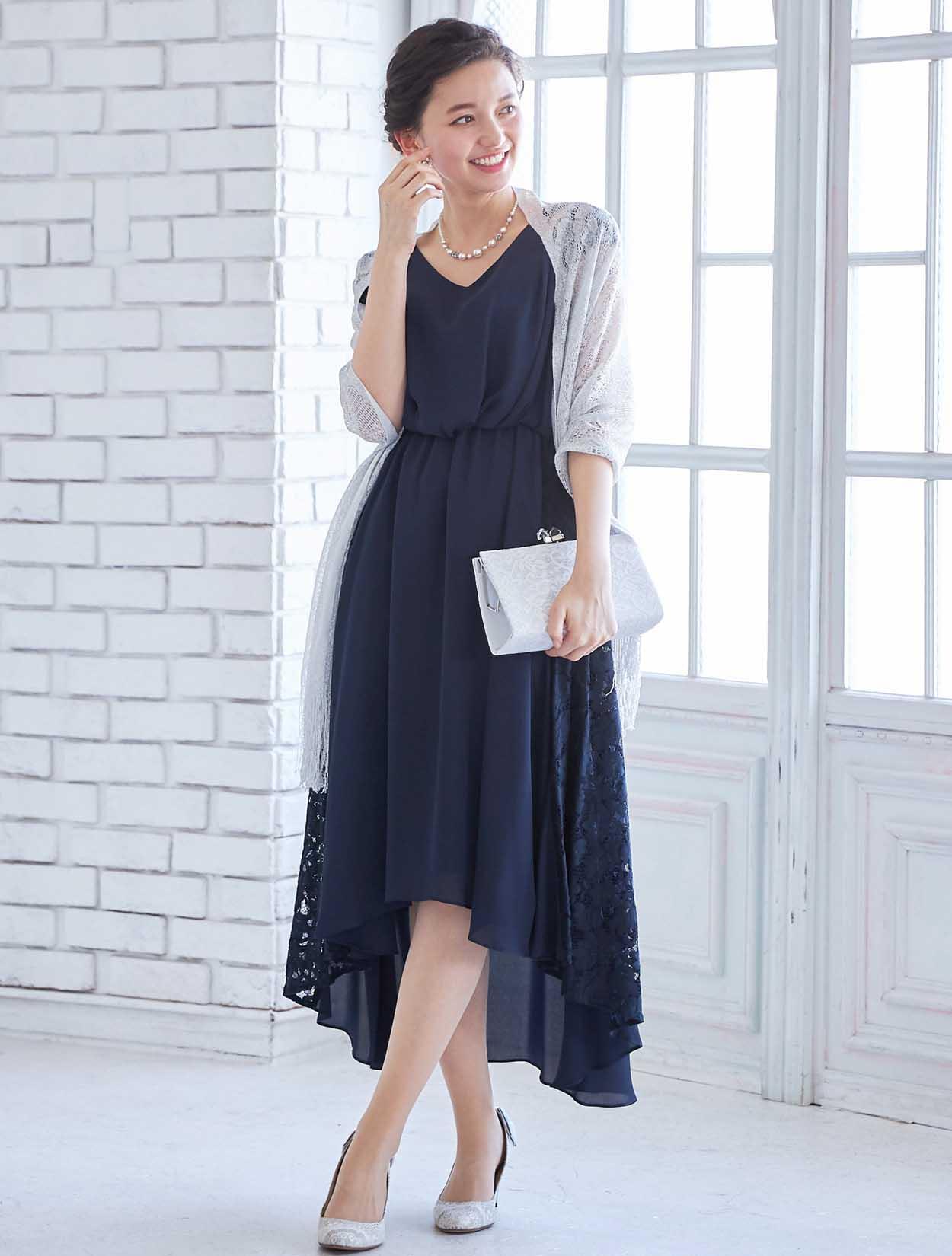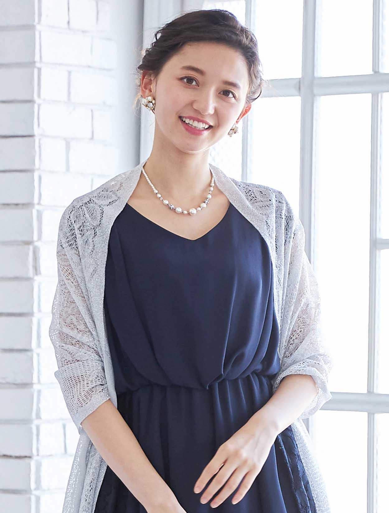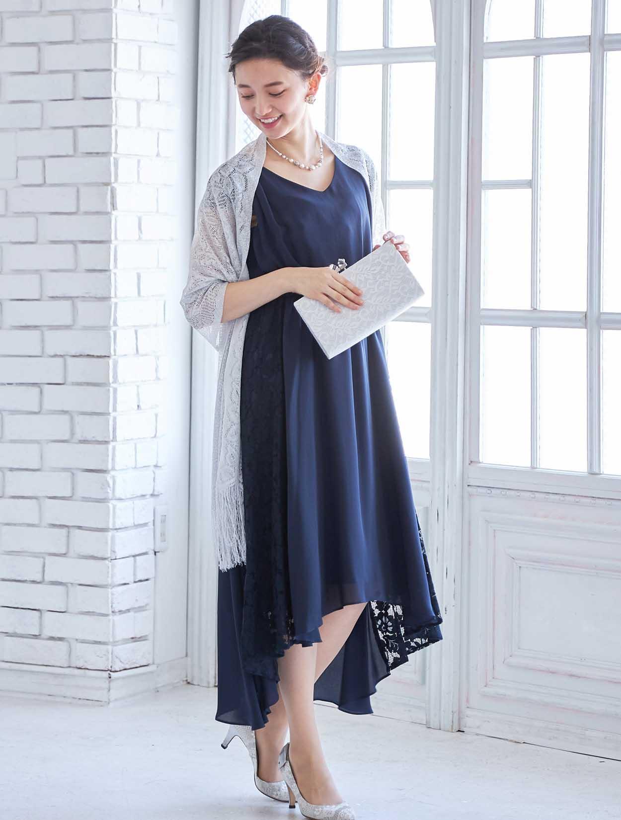 人気のネイビーにシルバーのショールとバックを合わせた大人っぽいコーディネート。