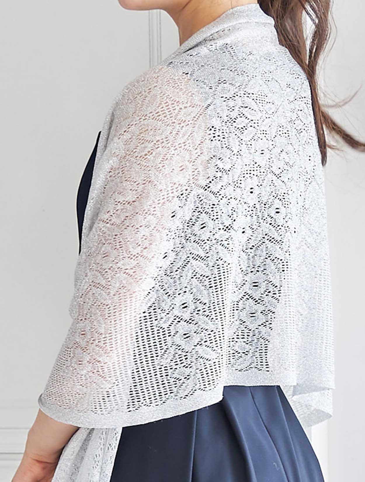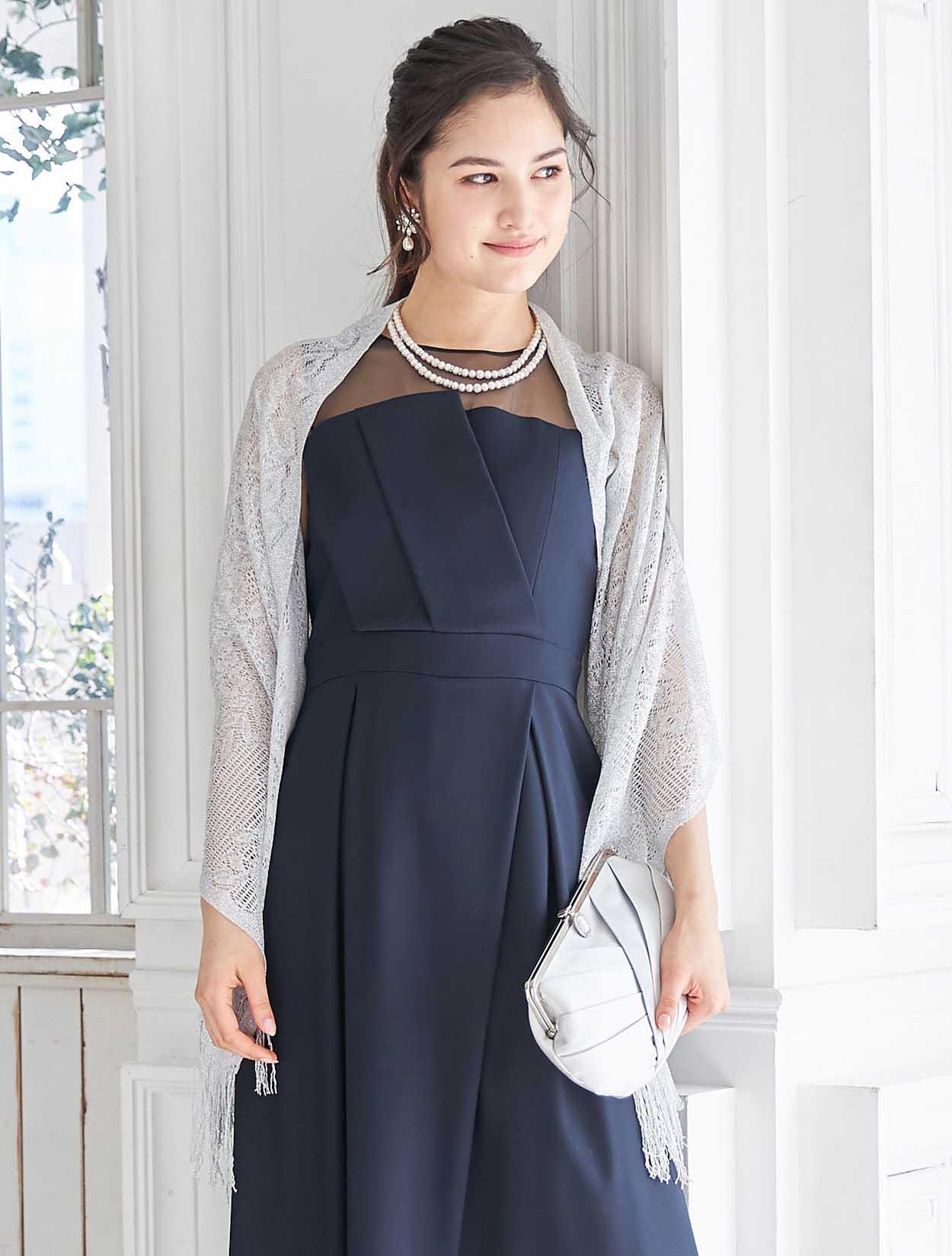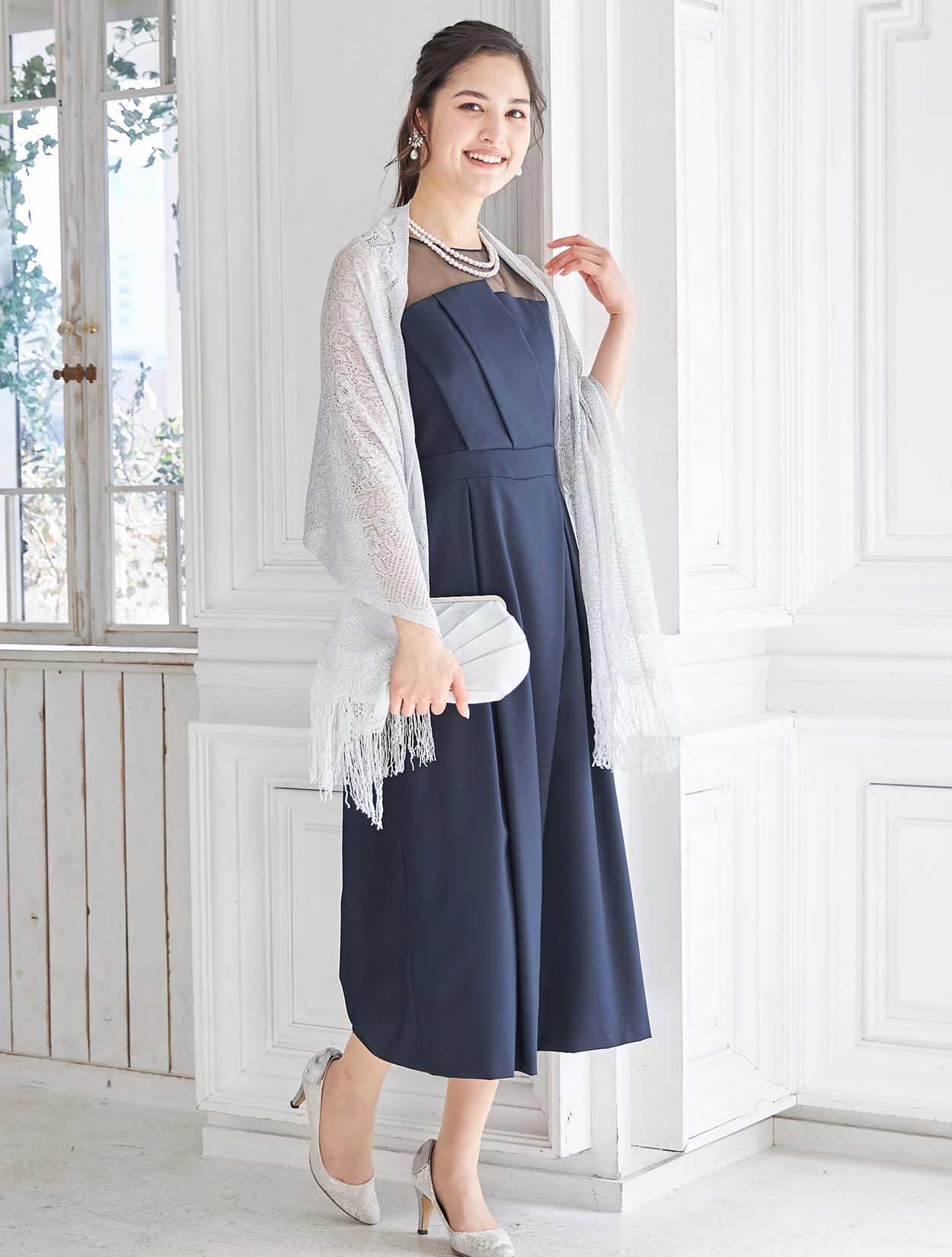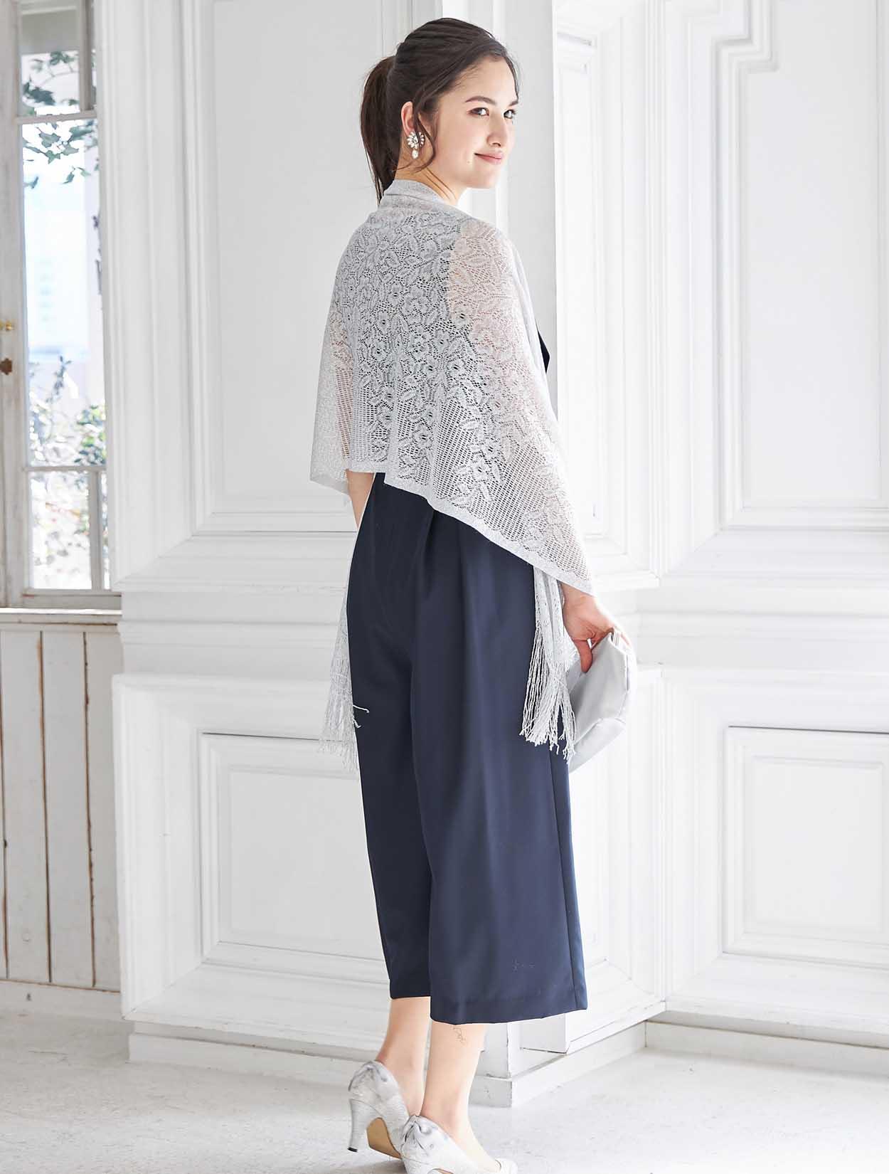 シルバーのラメショールがクールな印象でパンツドレスにマッチしたおすすめコーディネート。