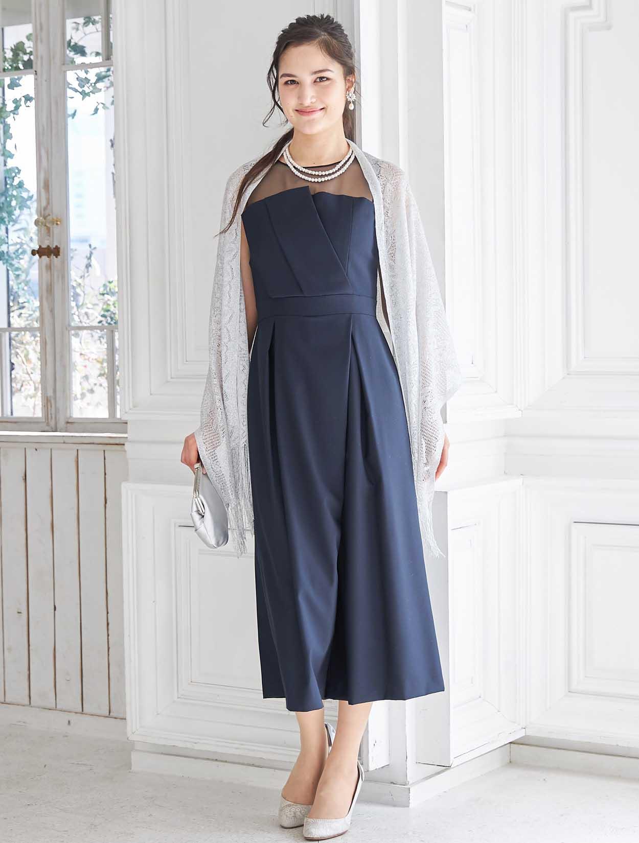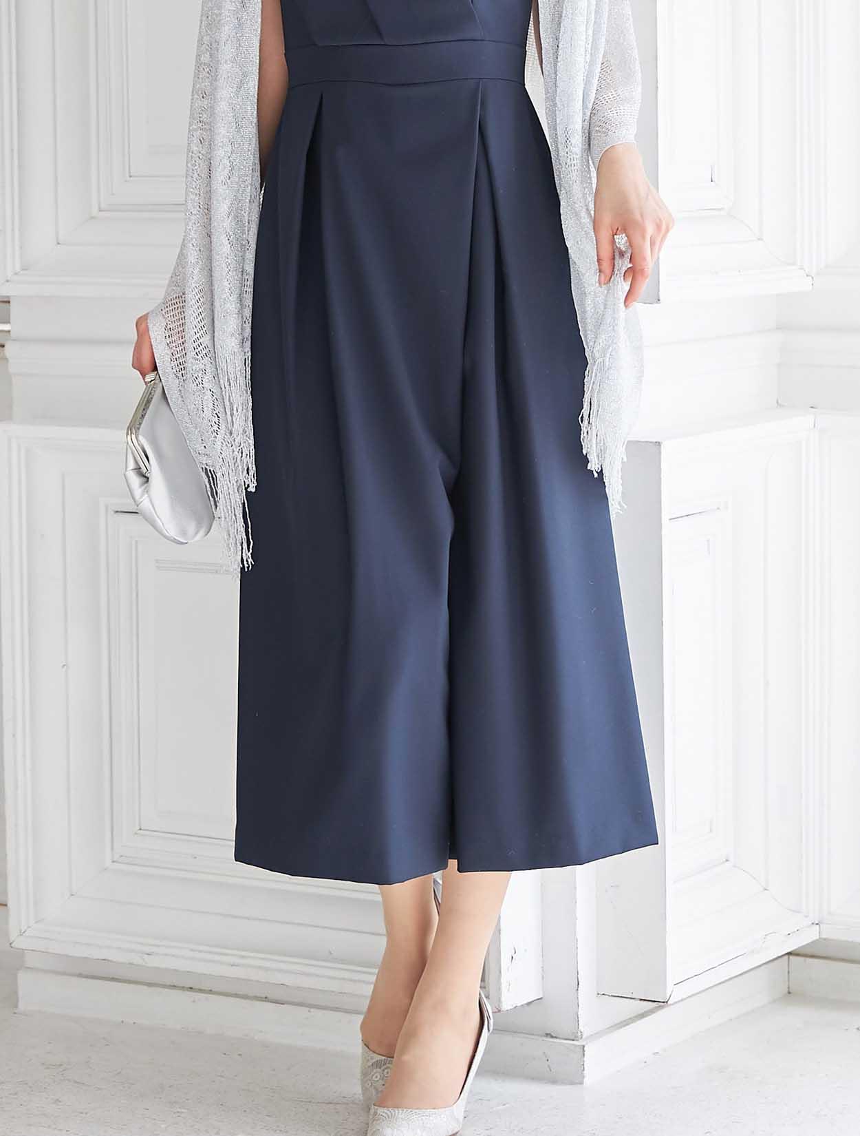 立体感のあるビスチェ風デザインがトレンドのドレス。斜めに入ったパンツのタックがシャープな印象ですか、一見スカートの様にも見えるので初めてのパンツドレスでも着やすいデザインです。