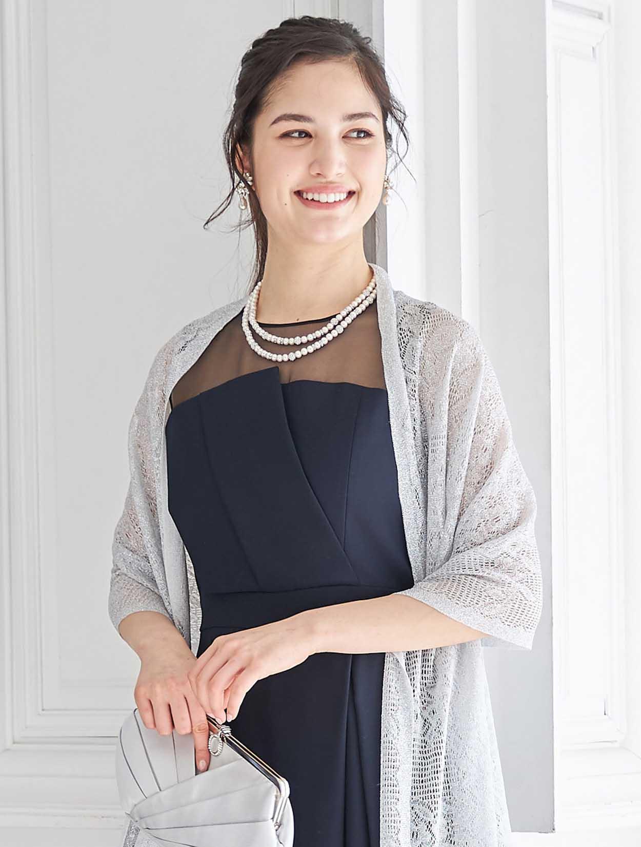 若干長めの2連のパールネックレスが、フェイスラインを華やかにスタイリングします。