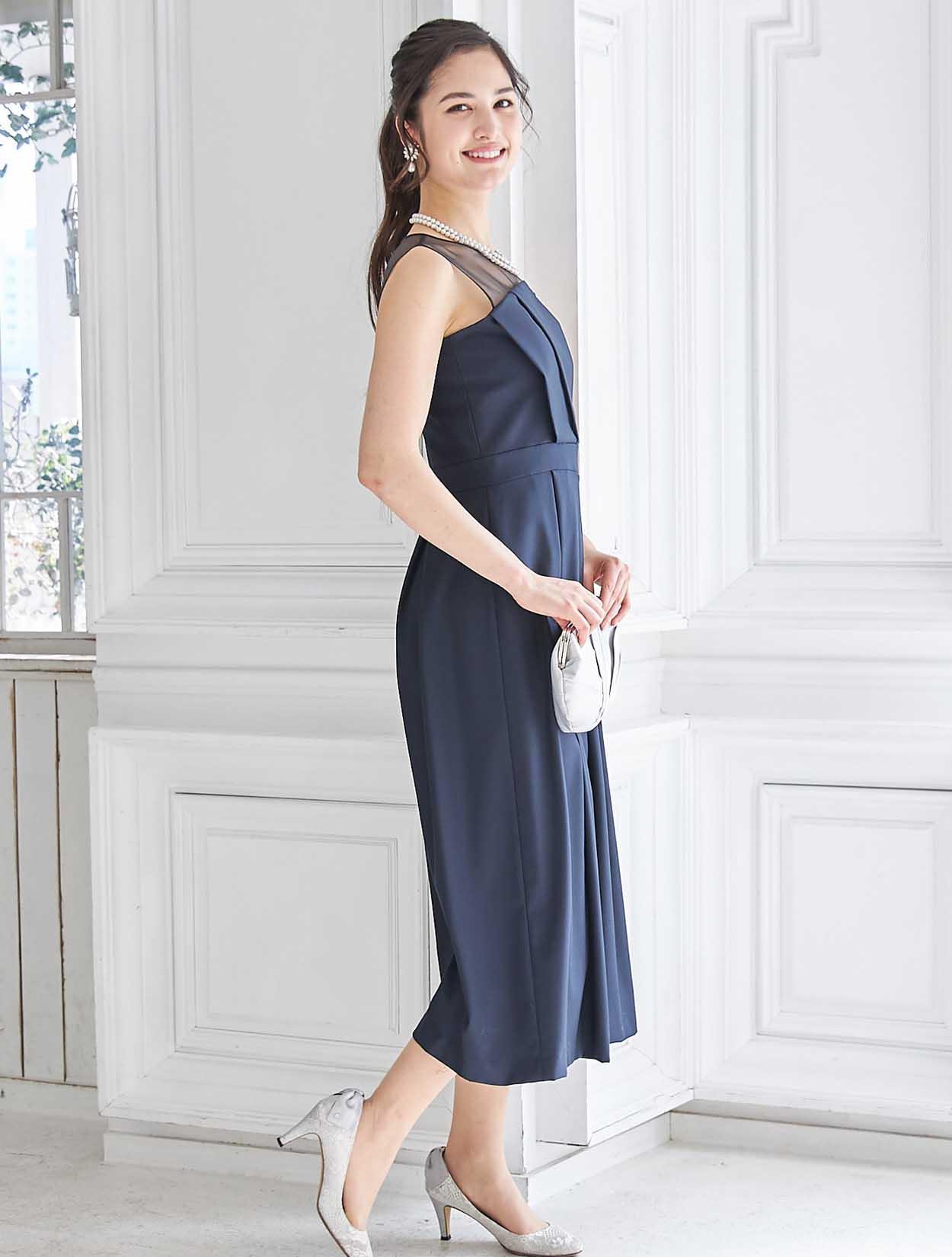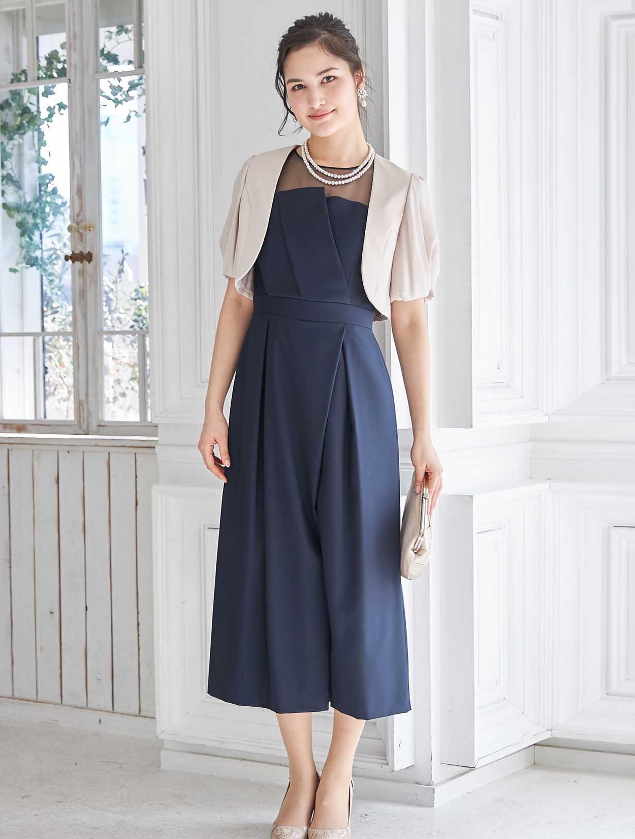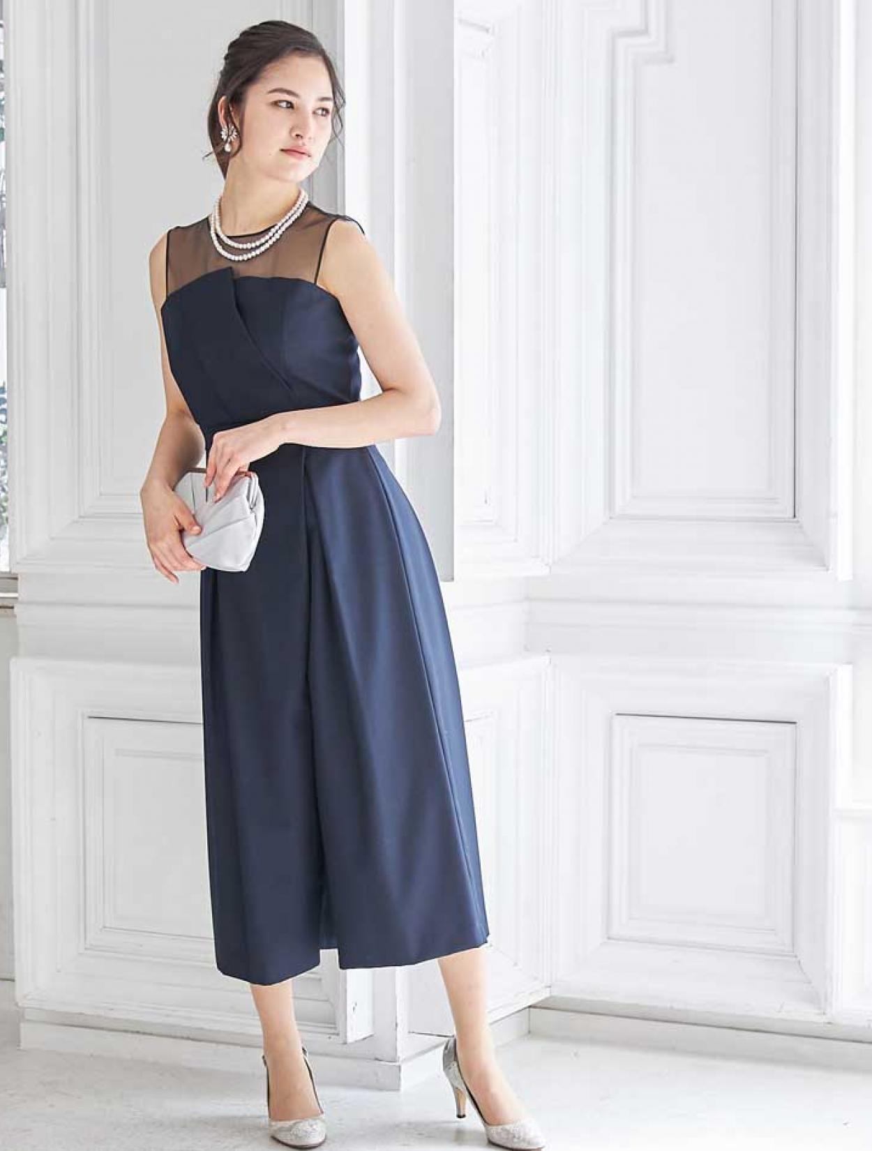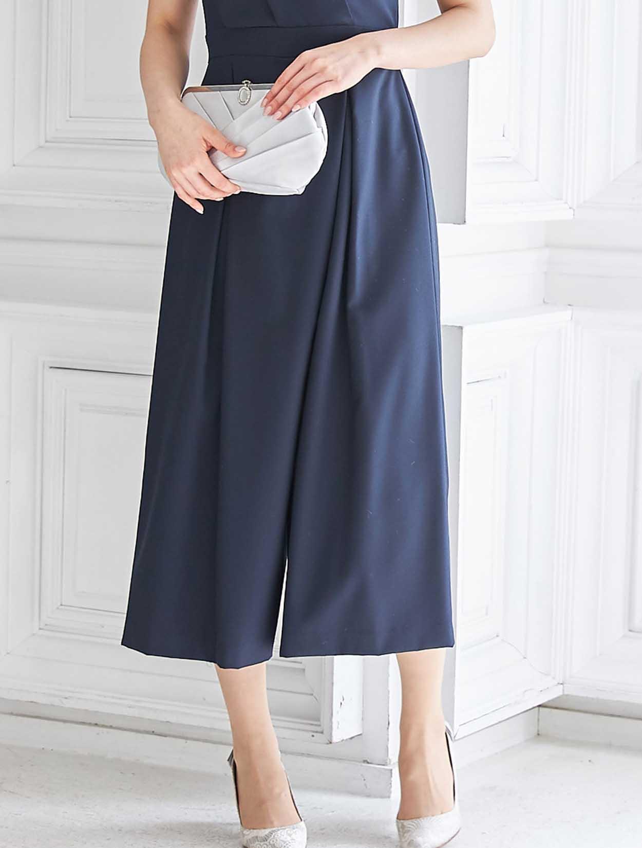 立体感のあるビスチェ風デザインがトレンドのドレス。斜めに入ったパンツのタックがシャープな印象ですか、一見スカートの様にも見えるので初めてのパンツドレスでも着やすいデザインです。