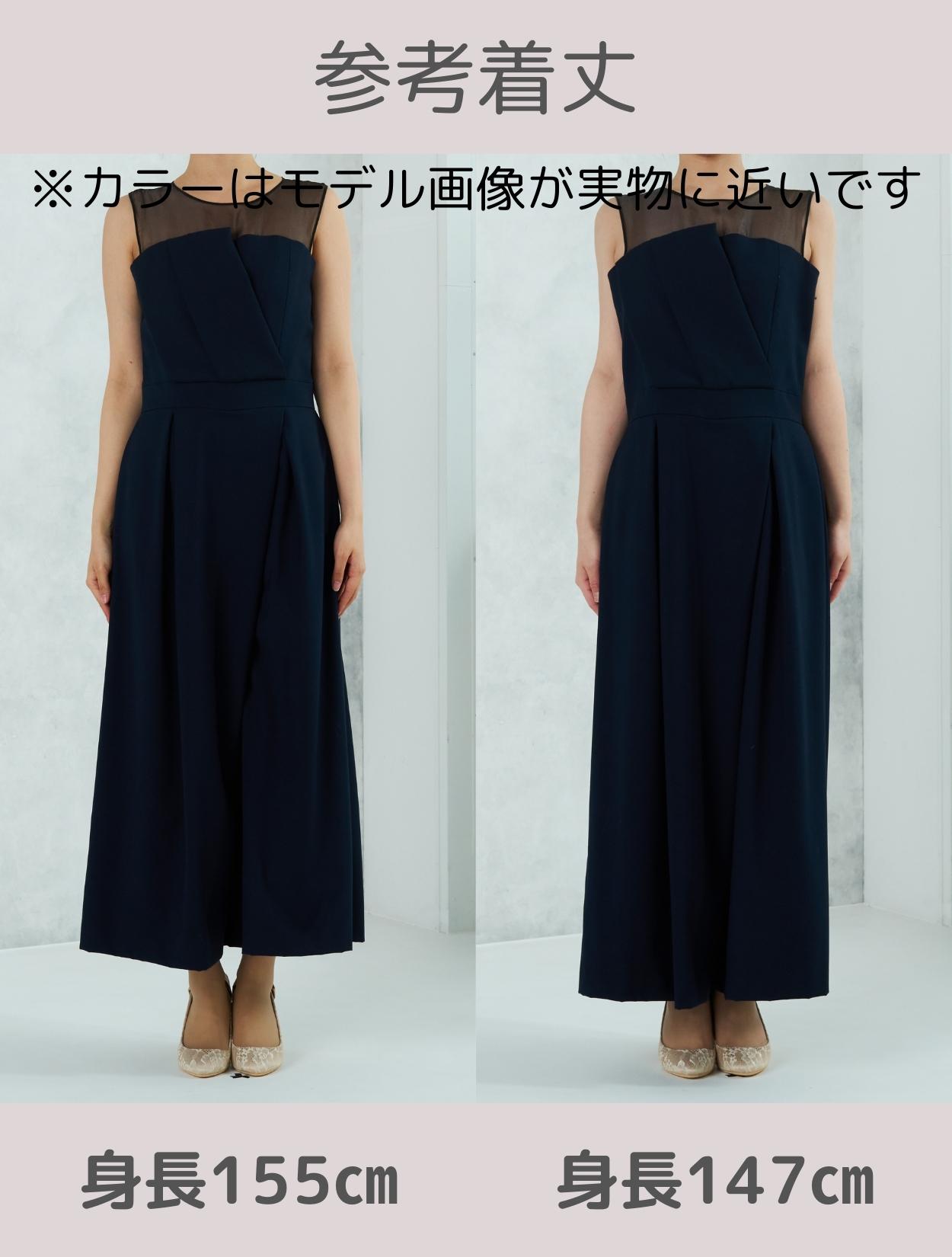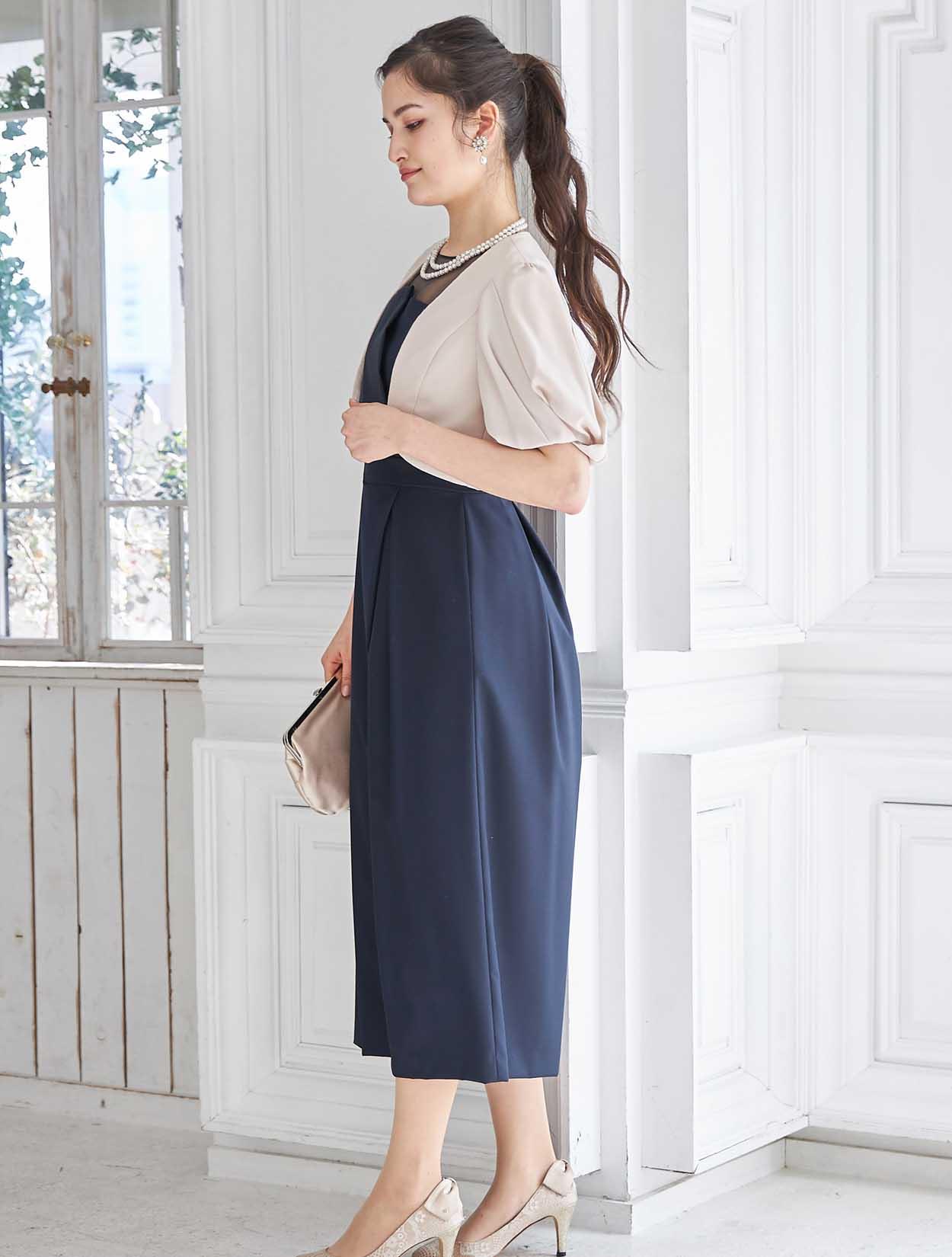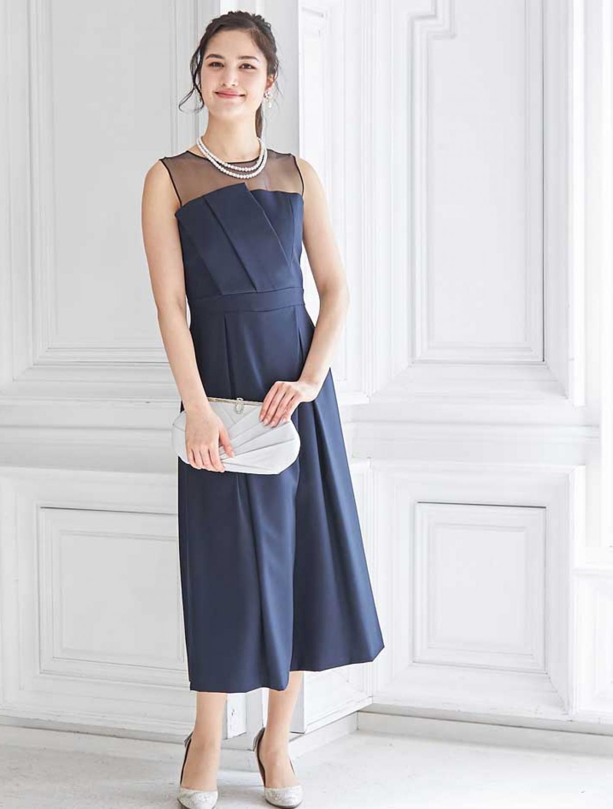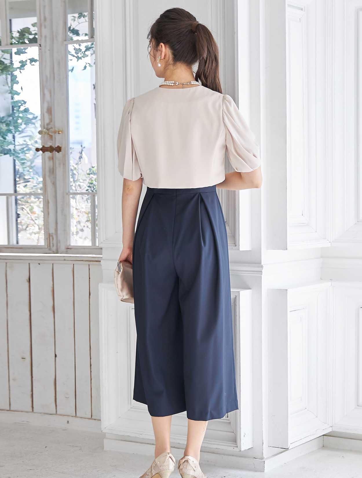 立体感のあるビスチェ風デザインがトレンドのドレス。斜めに入ったパンツのタックがシャープな印象ですか、一見スカートの様にも見えるので初めてのパンツドレスでも着やすいデザインです。