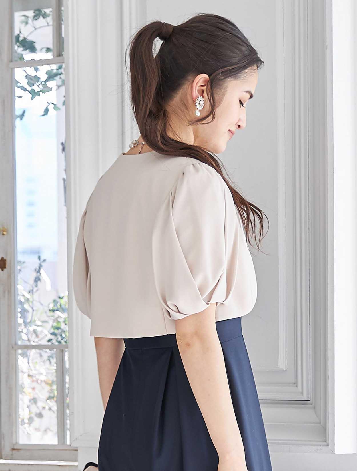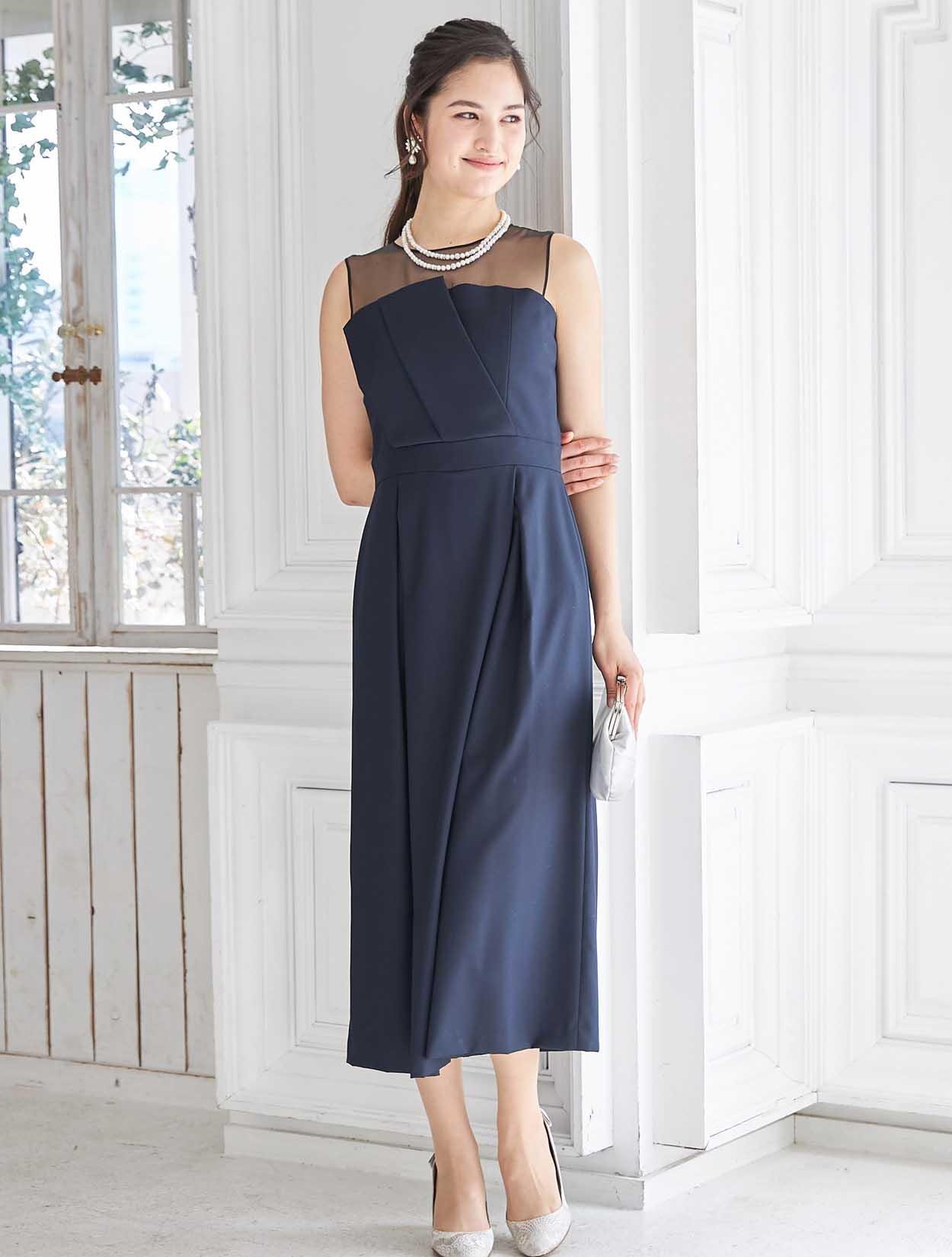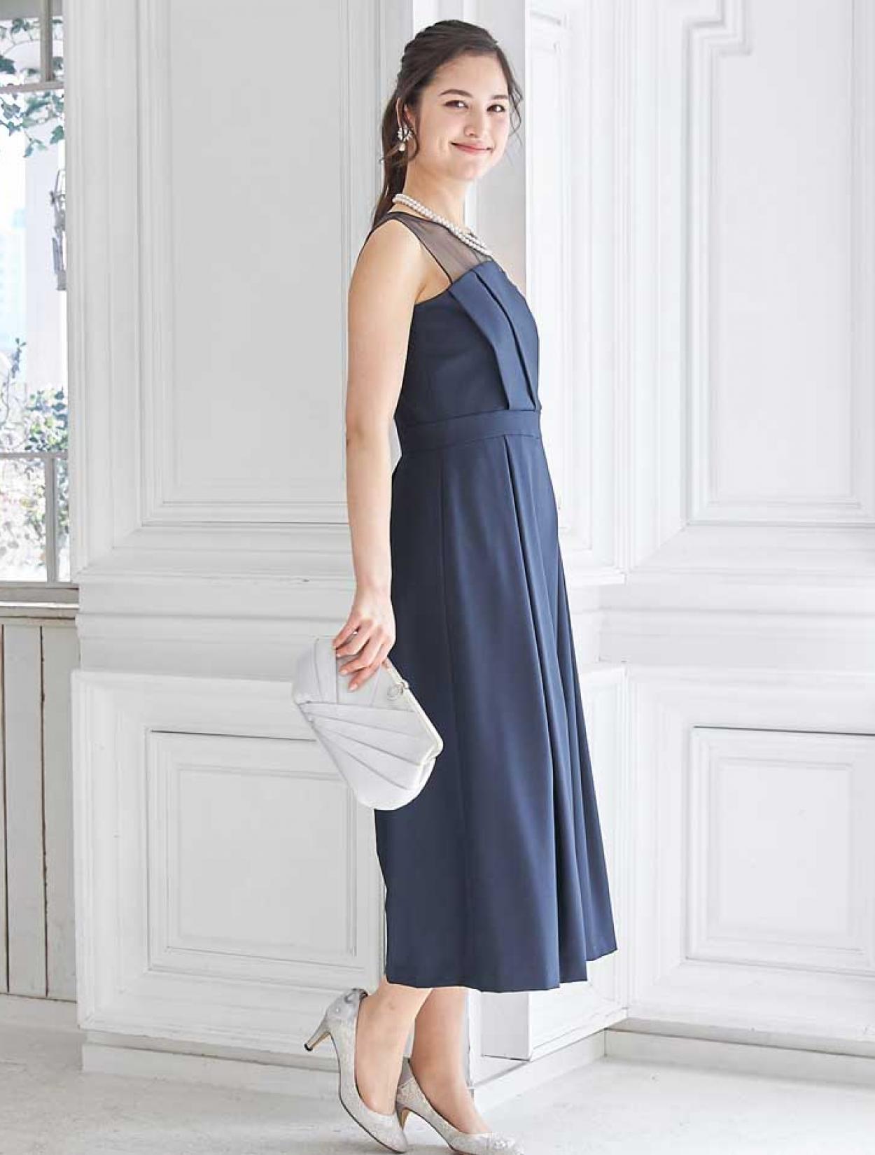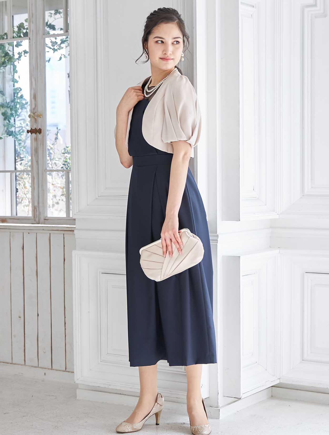 立体感のあるビスチェ風デザインがトレンドのドレス。斜めに入ったパンツのタックがシャープな印象ですか、一見スカートの様にも見えるので初めてのパンツドレスでも着やすいデザインです。