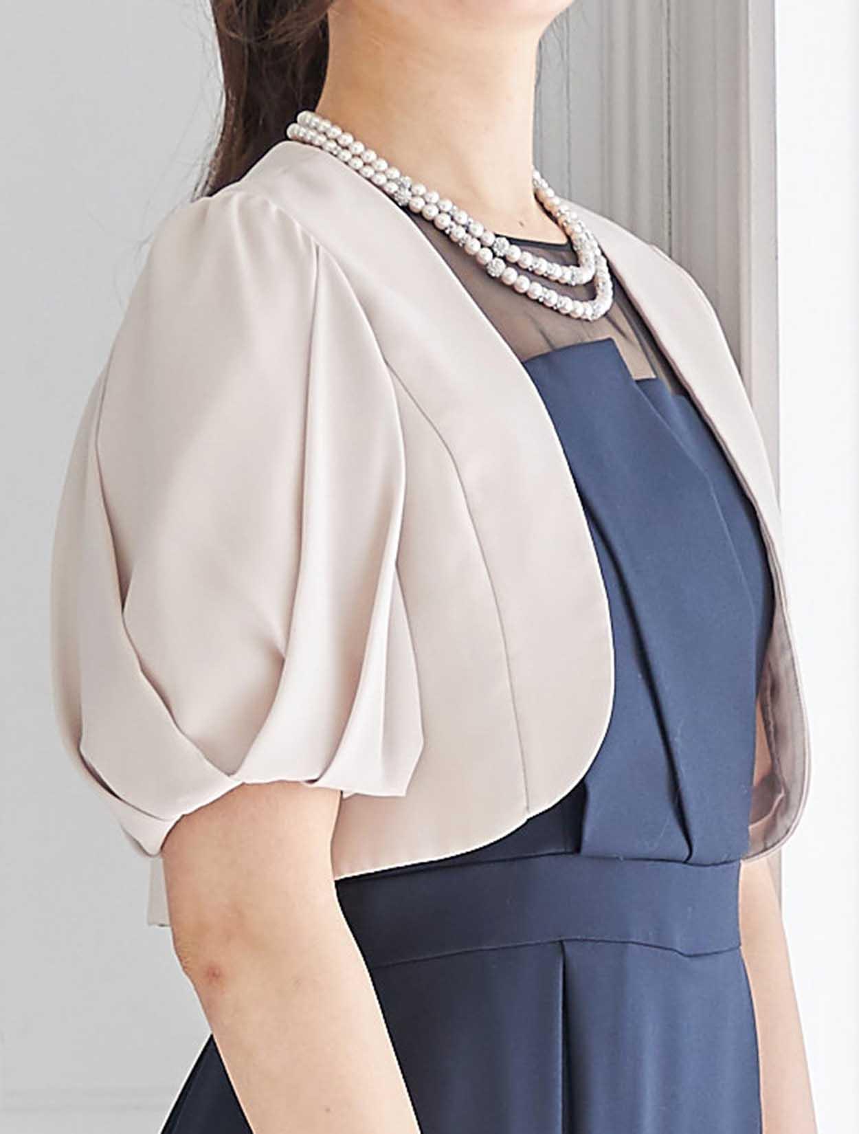 ベージュカラーと美しいカーブラインが引き立つ丸みのあるお袖が、女性らしい表情で柔らかい印象のジャケットスタイルに。