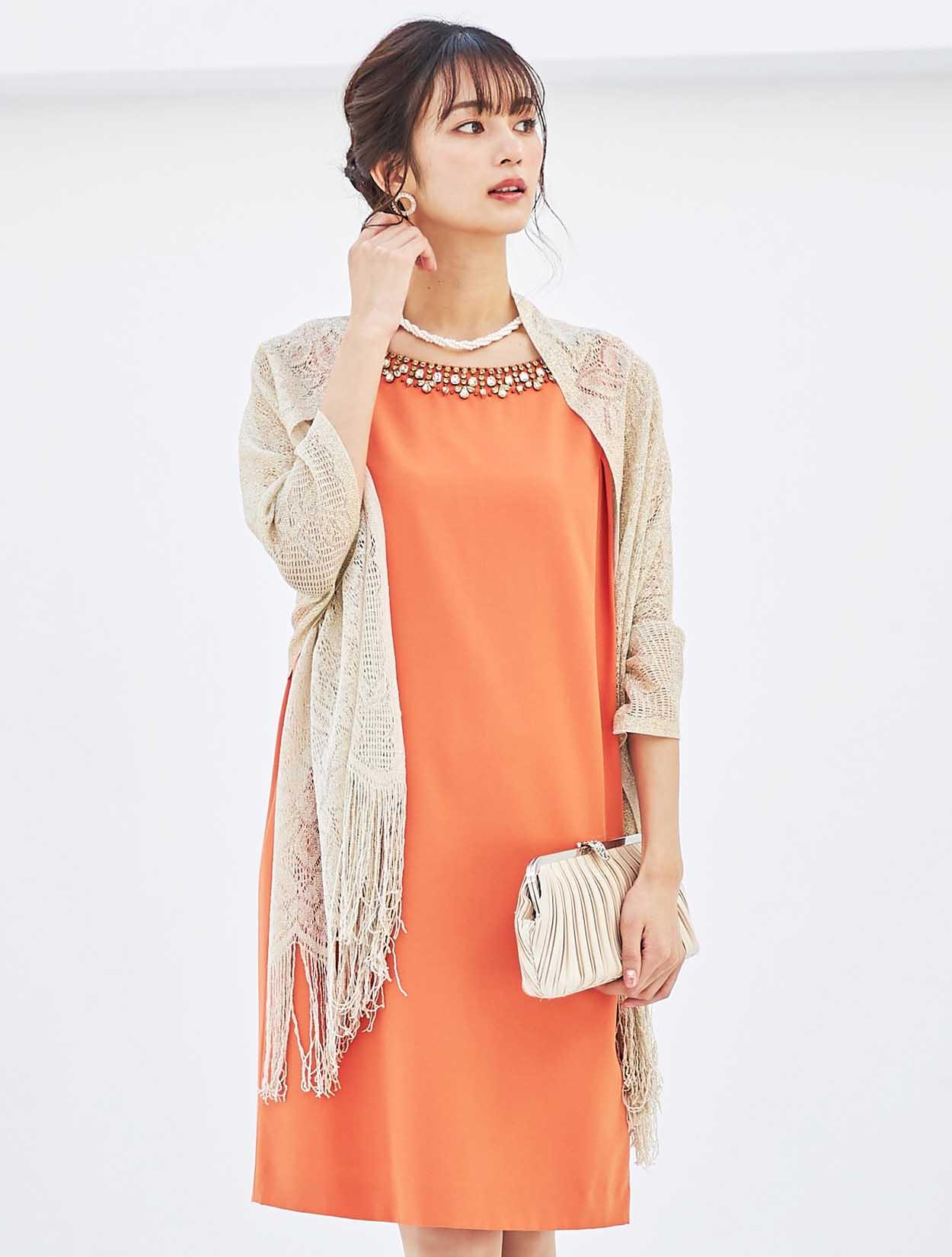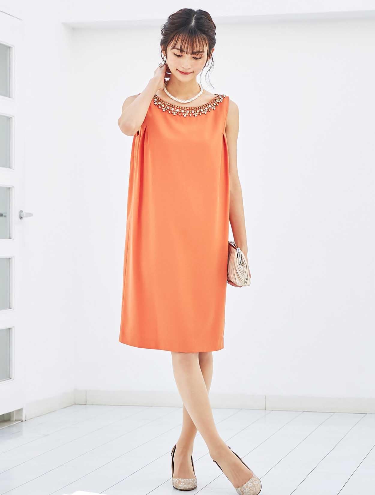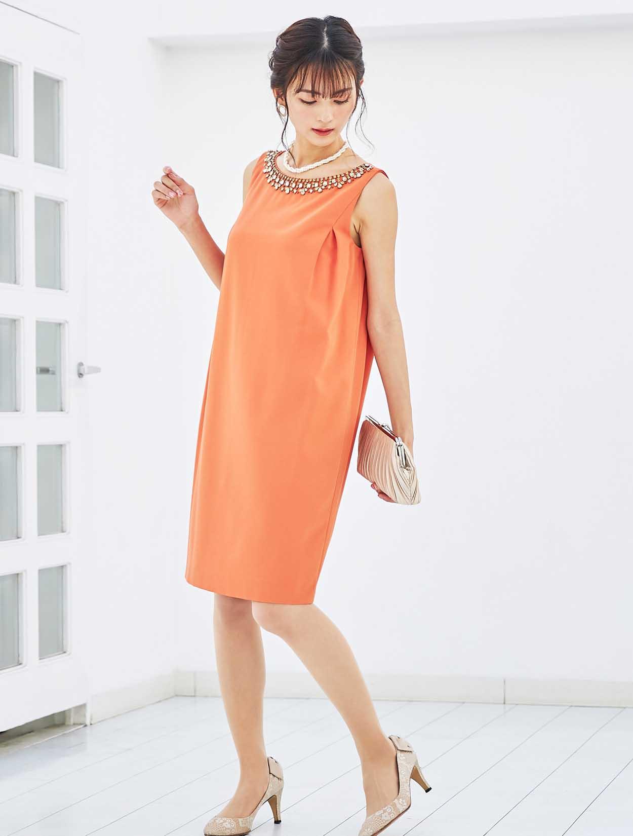 襟元のビジューでお顔周りを華やかに。ストンとしたサックドレスで、お腹周りや腰回りをカバーできる嬉しいデザインです。