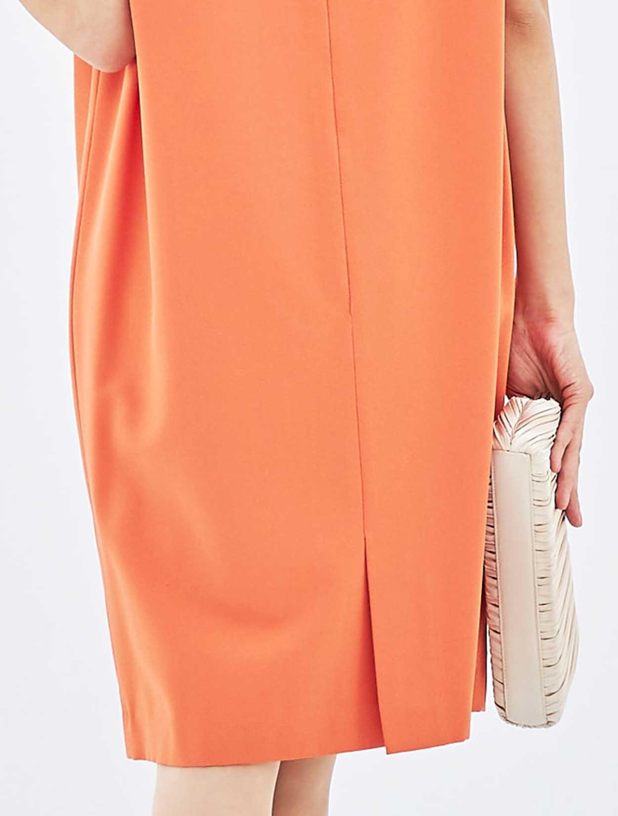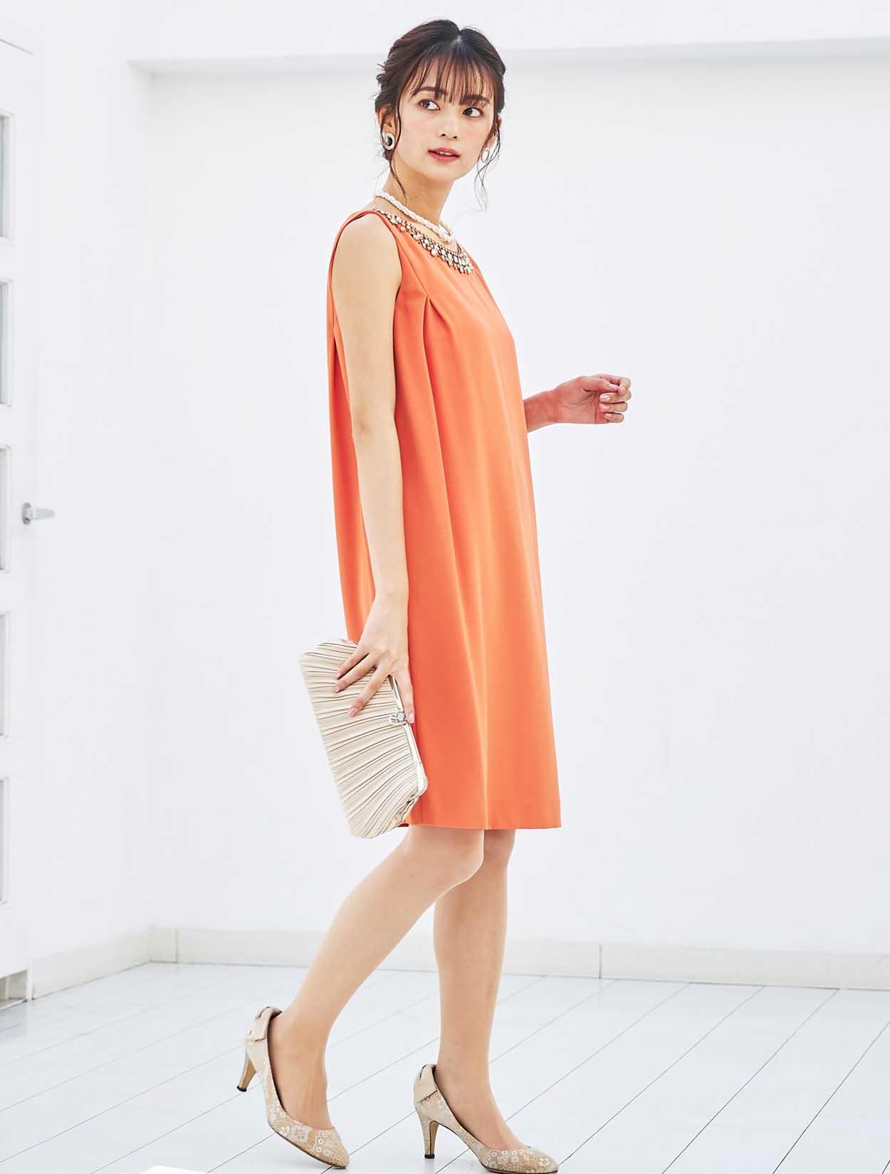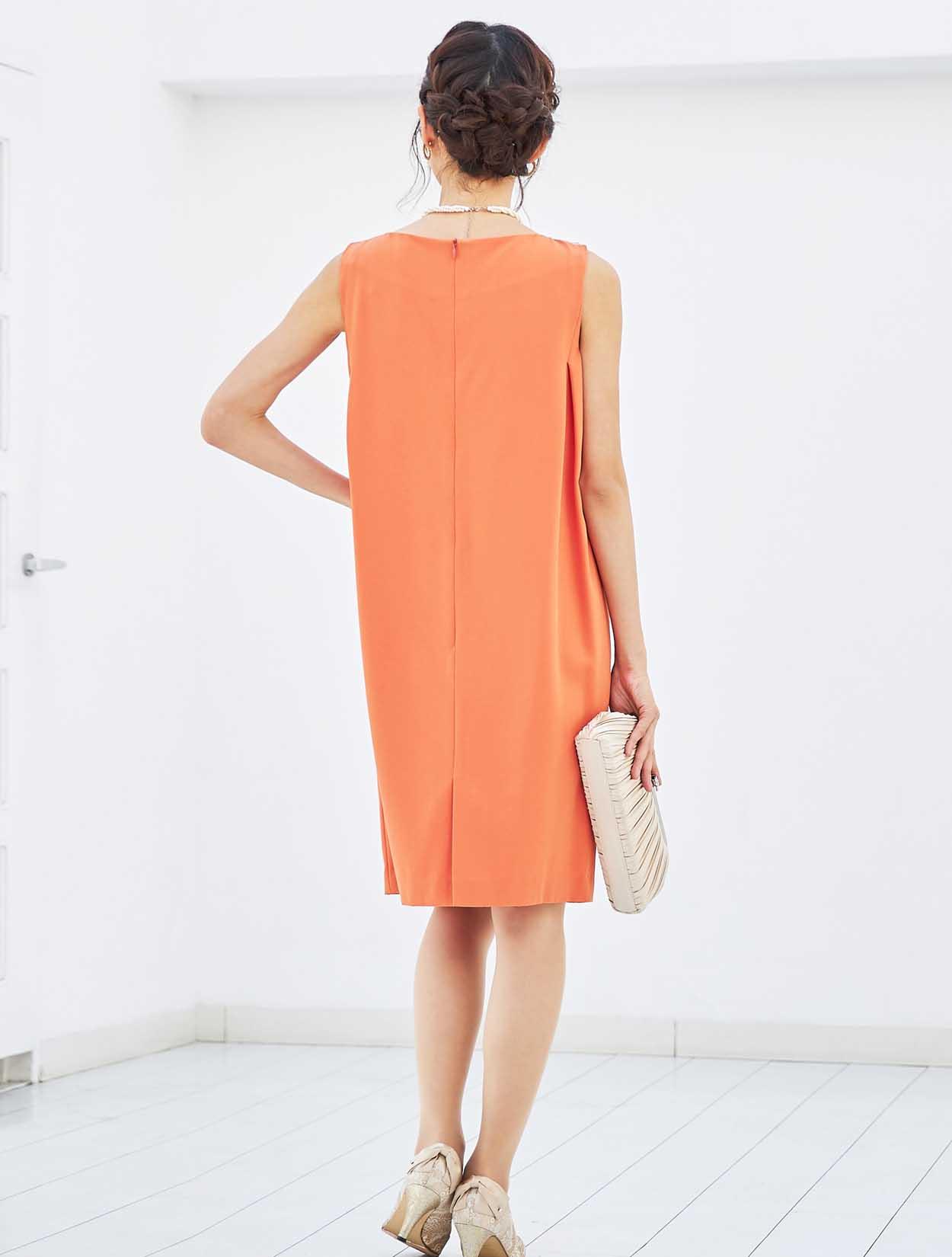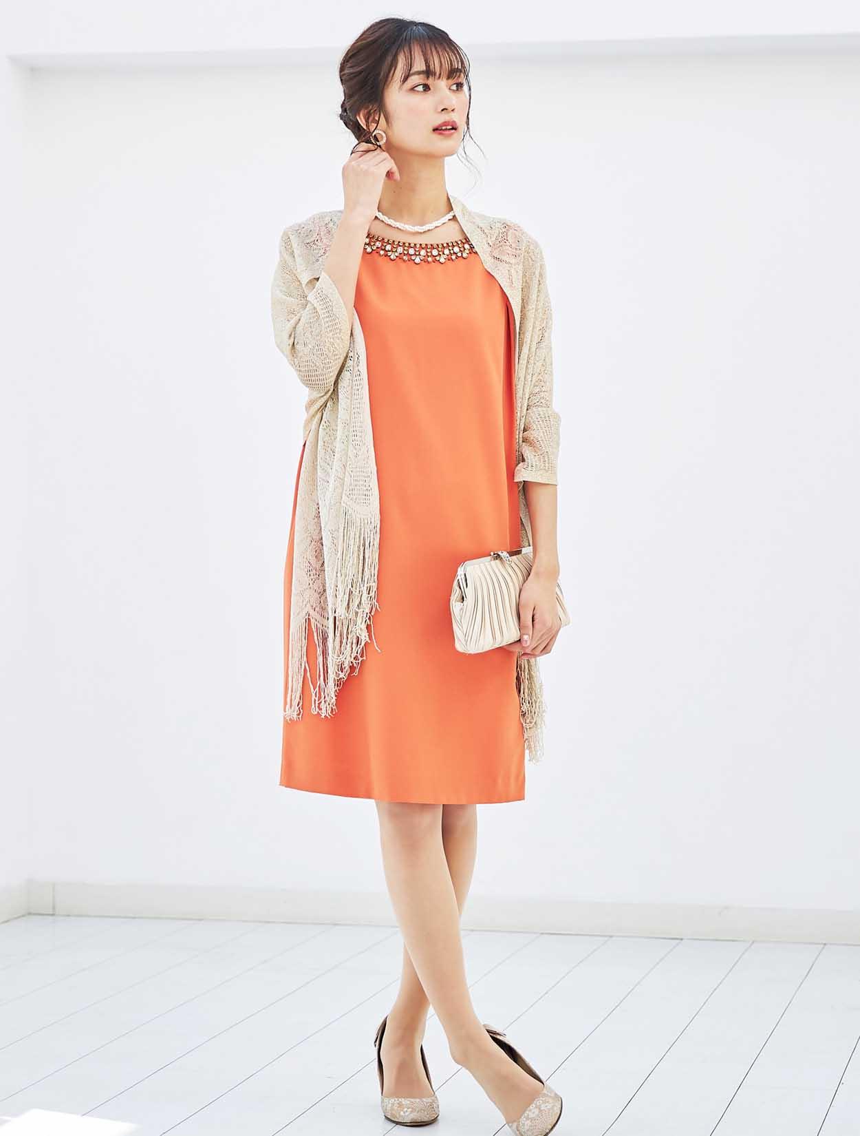 襟元のビジューでお顔周りを華やかに。ストンとしたサックドレスで、お腹周りや腰回りをカバーできる嬉しいデザインです。