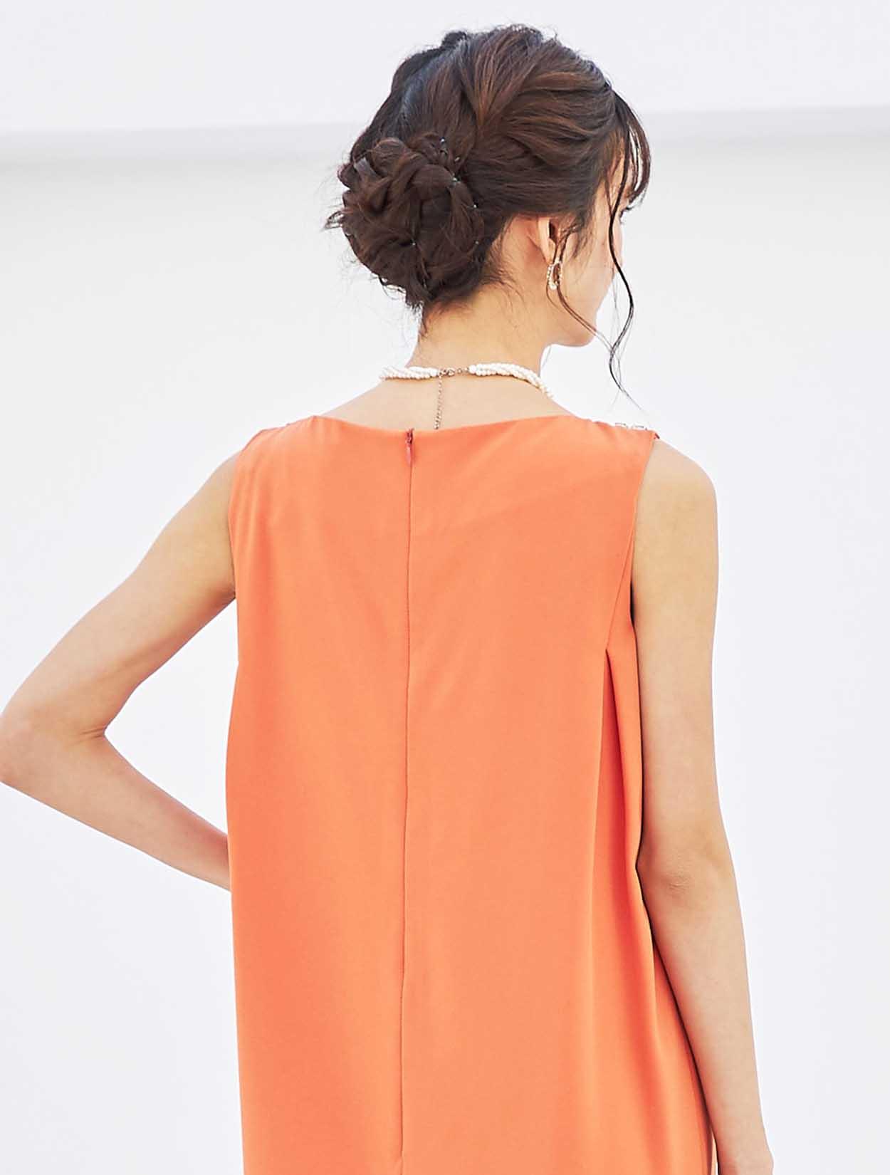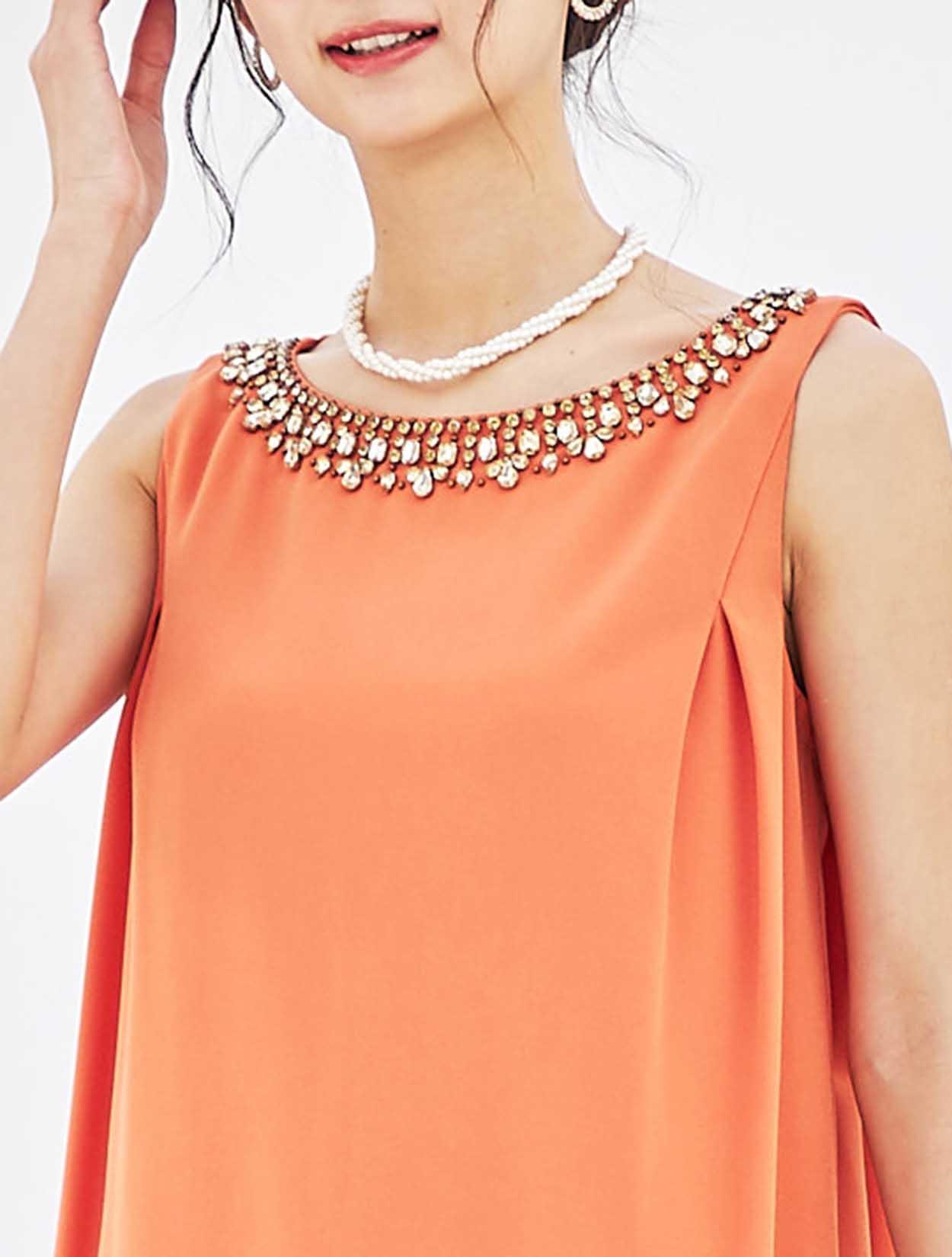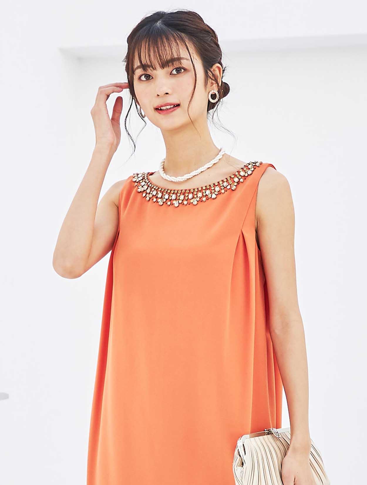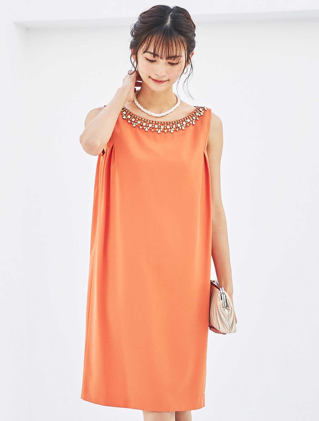 胸元ビジューが輝くサックドレス