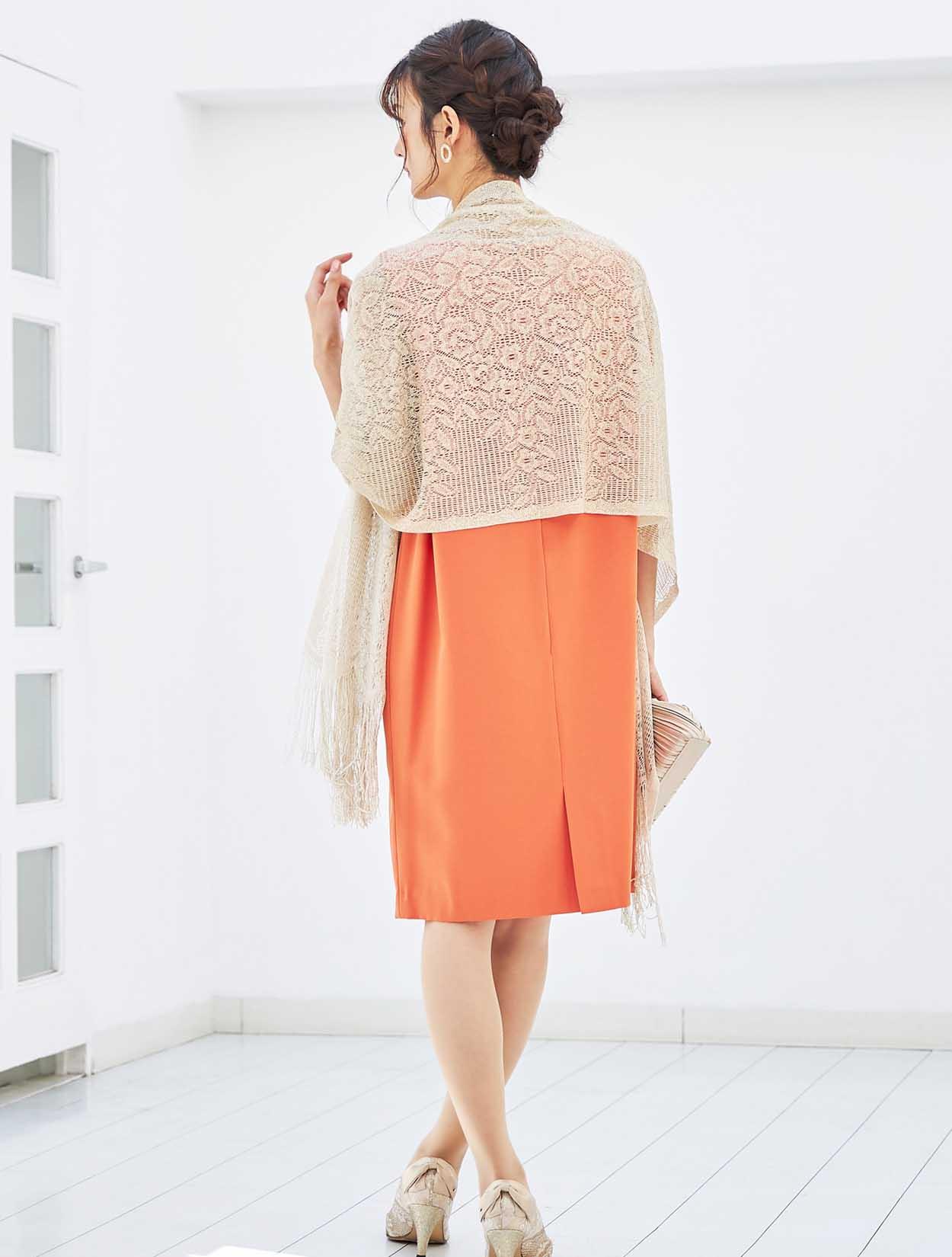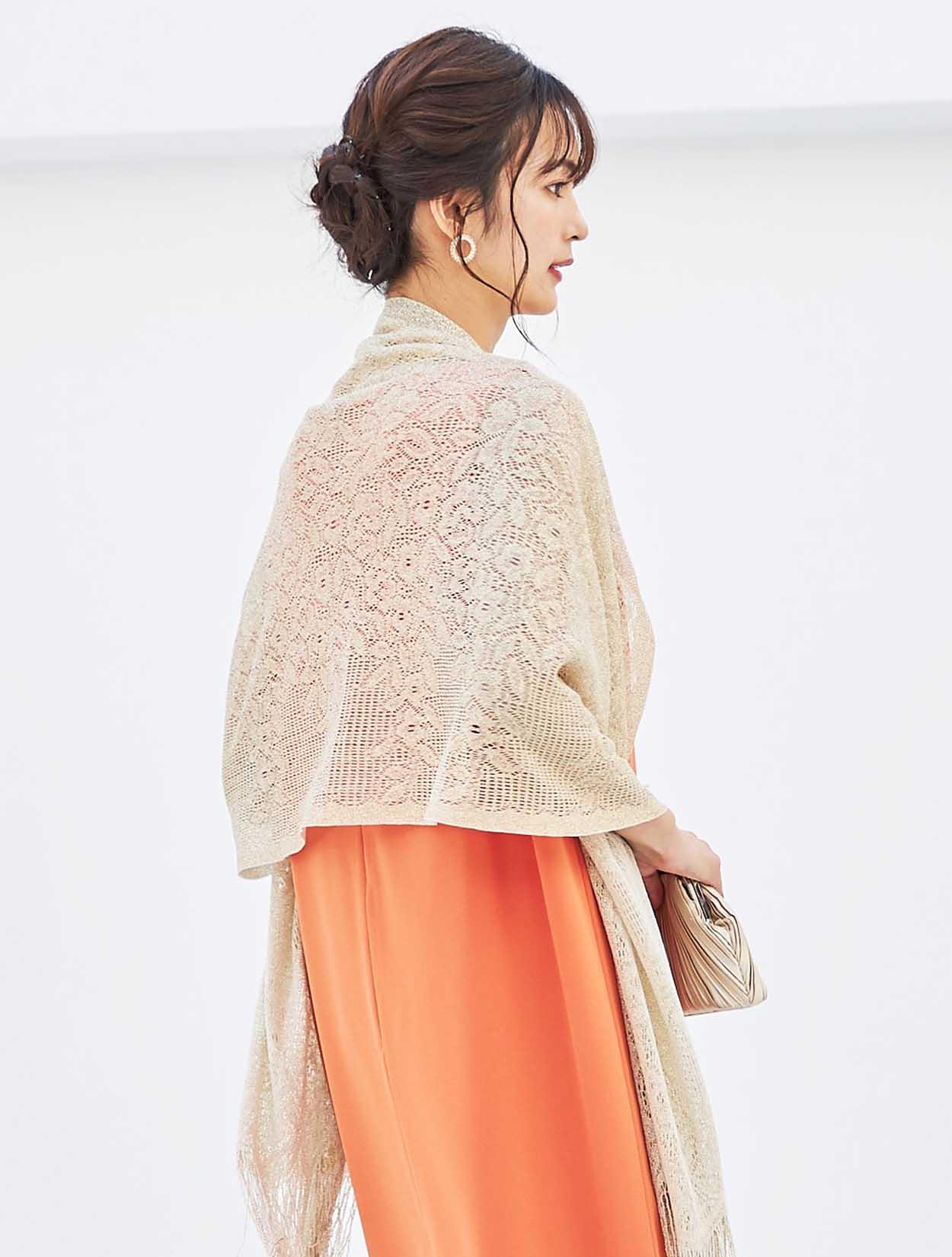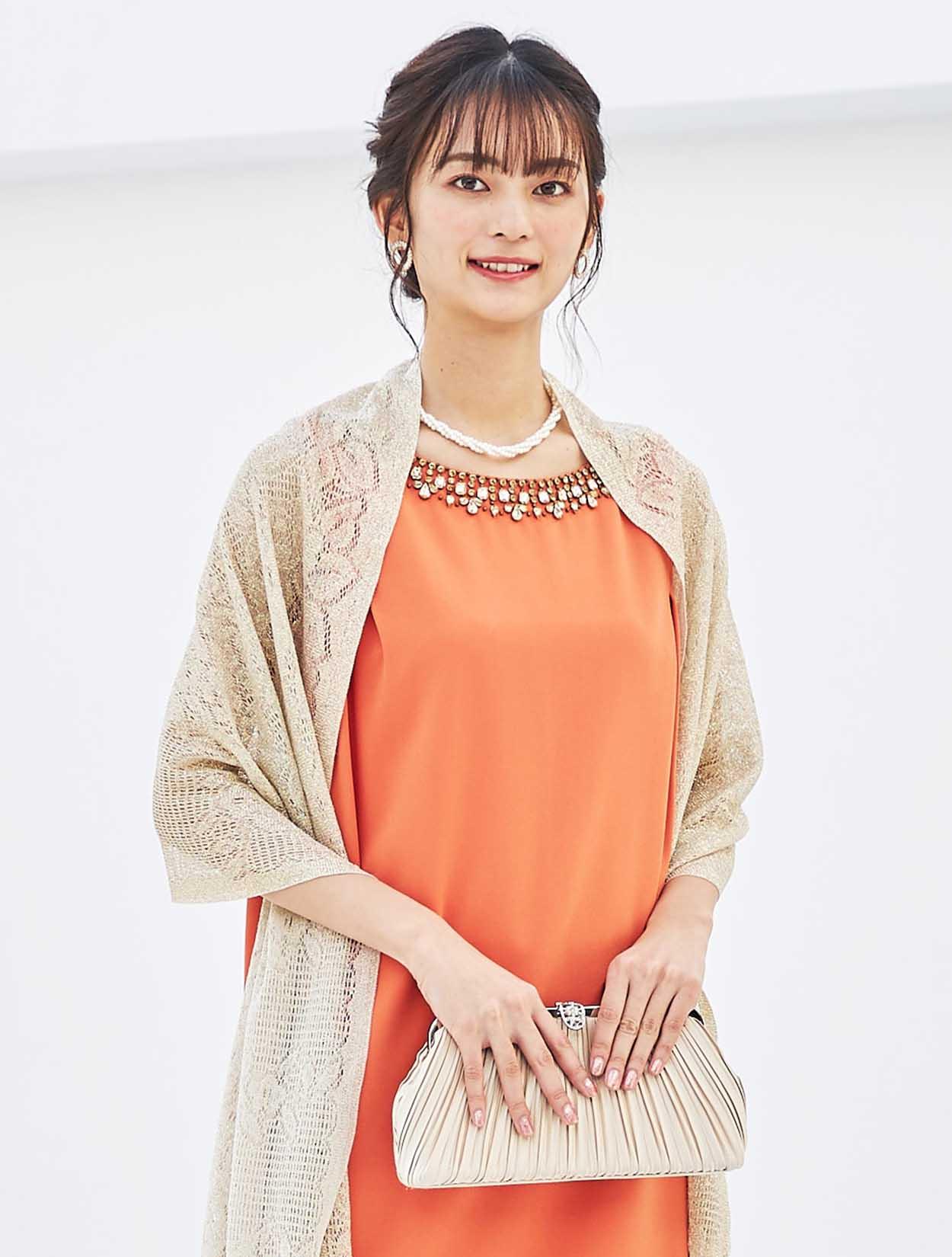 周りと差がつくパッと目を引くビタミンカラーにゴールドショールを合わせた華やかコーディネート。
