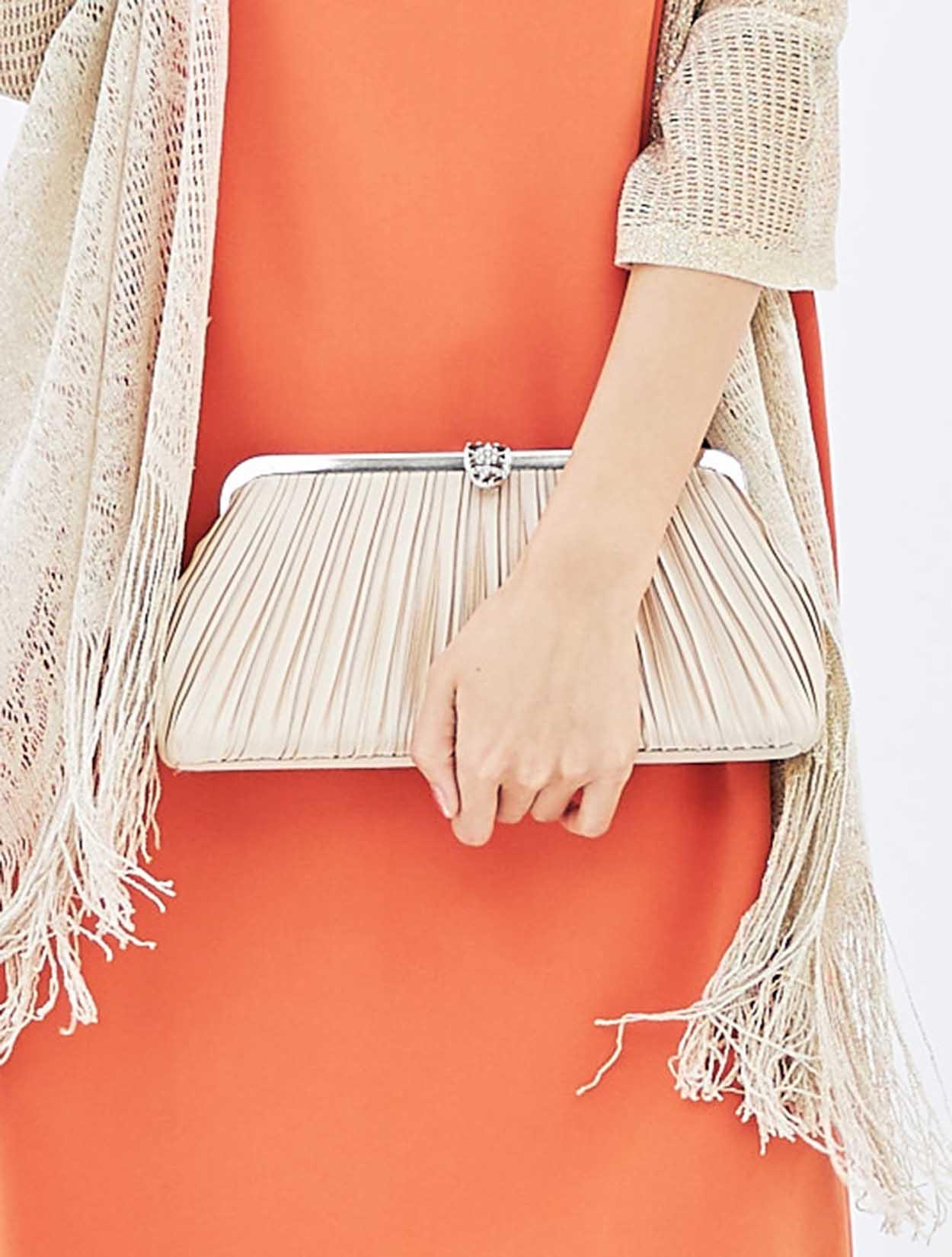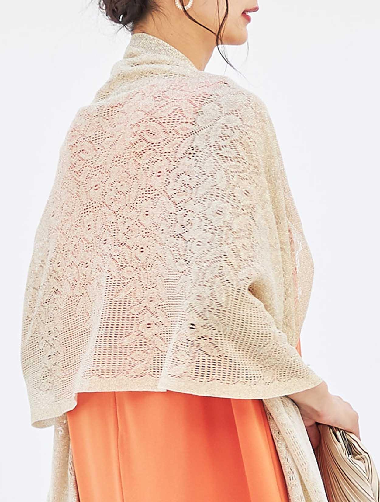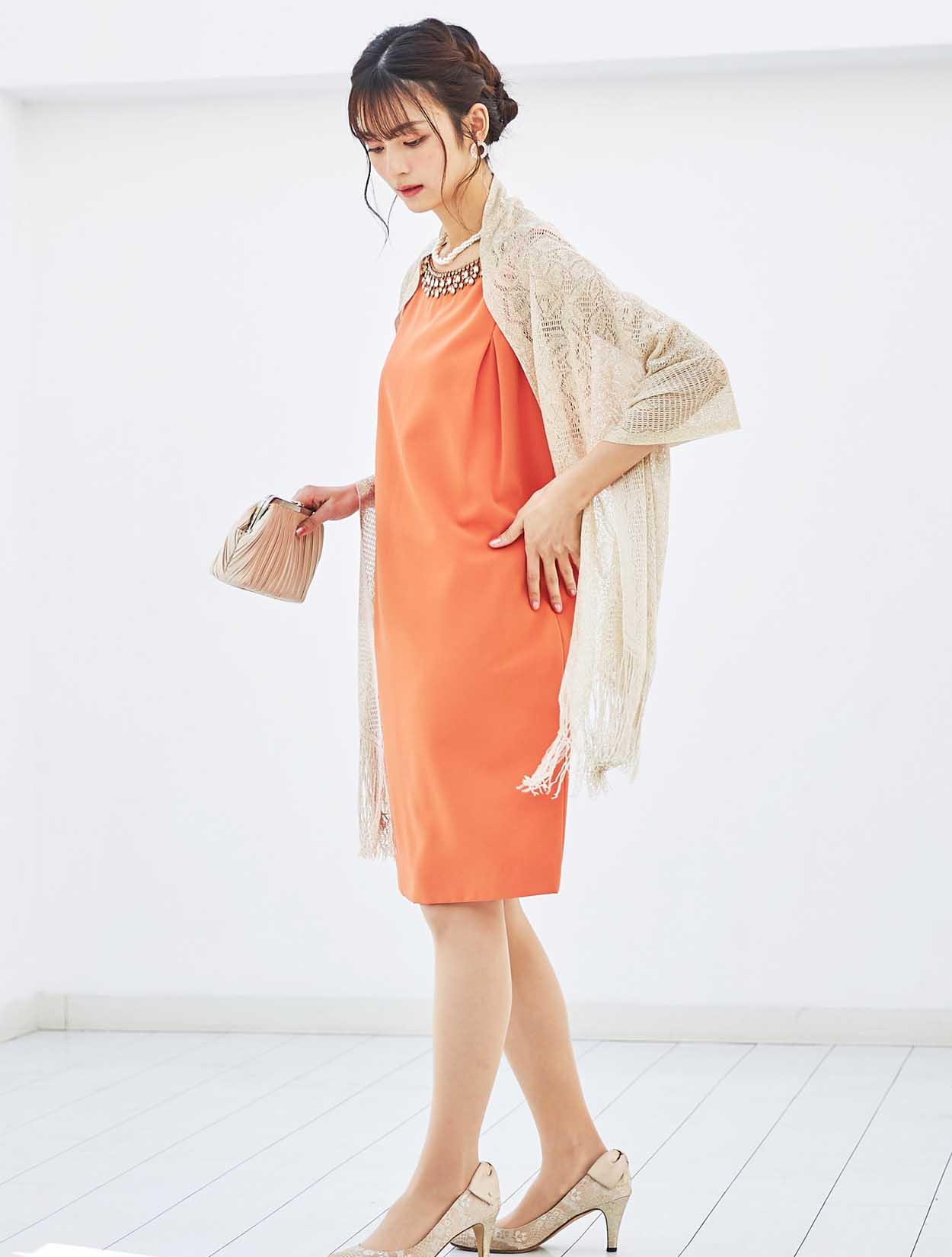 周りと差がつくパッと目を引くビタミンカラーにゴールドショールを合わせた華やかコーディネート。
