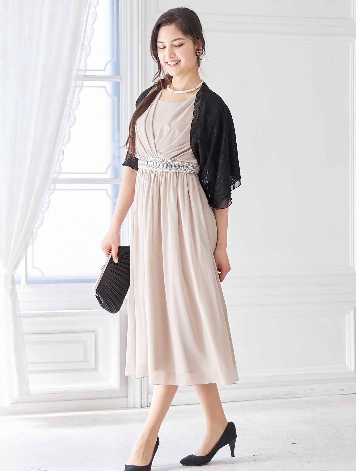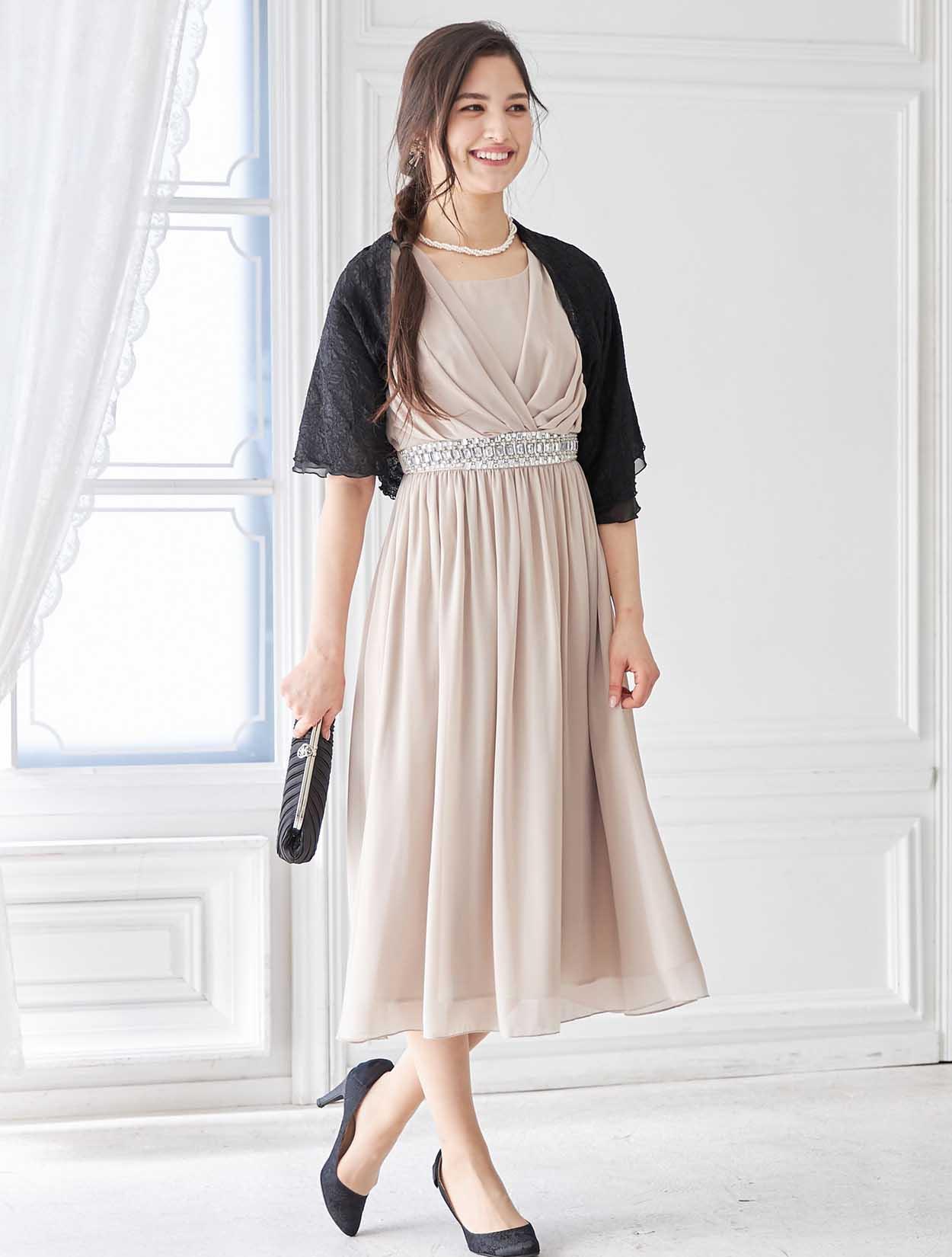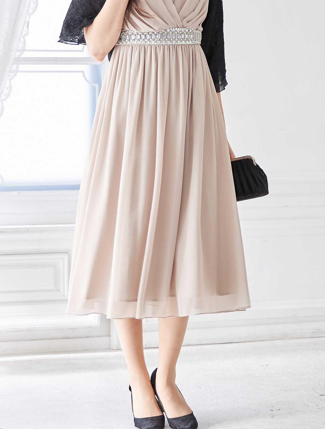大胆なウエストビジューが印象的なミディ丈ドレス