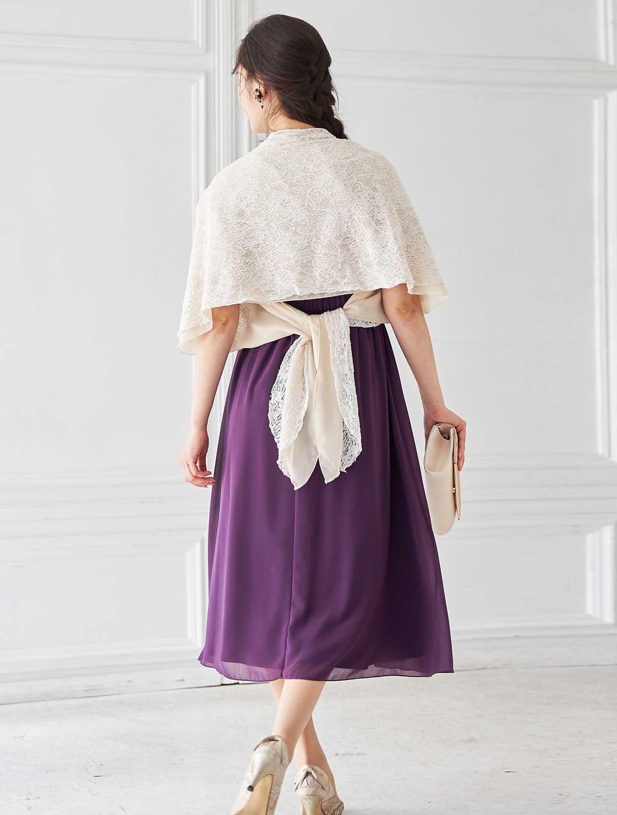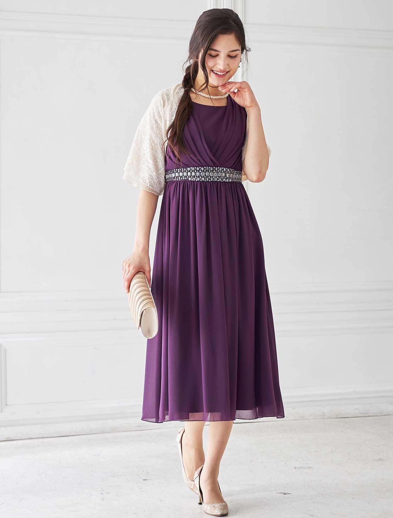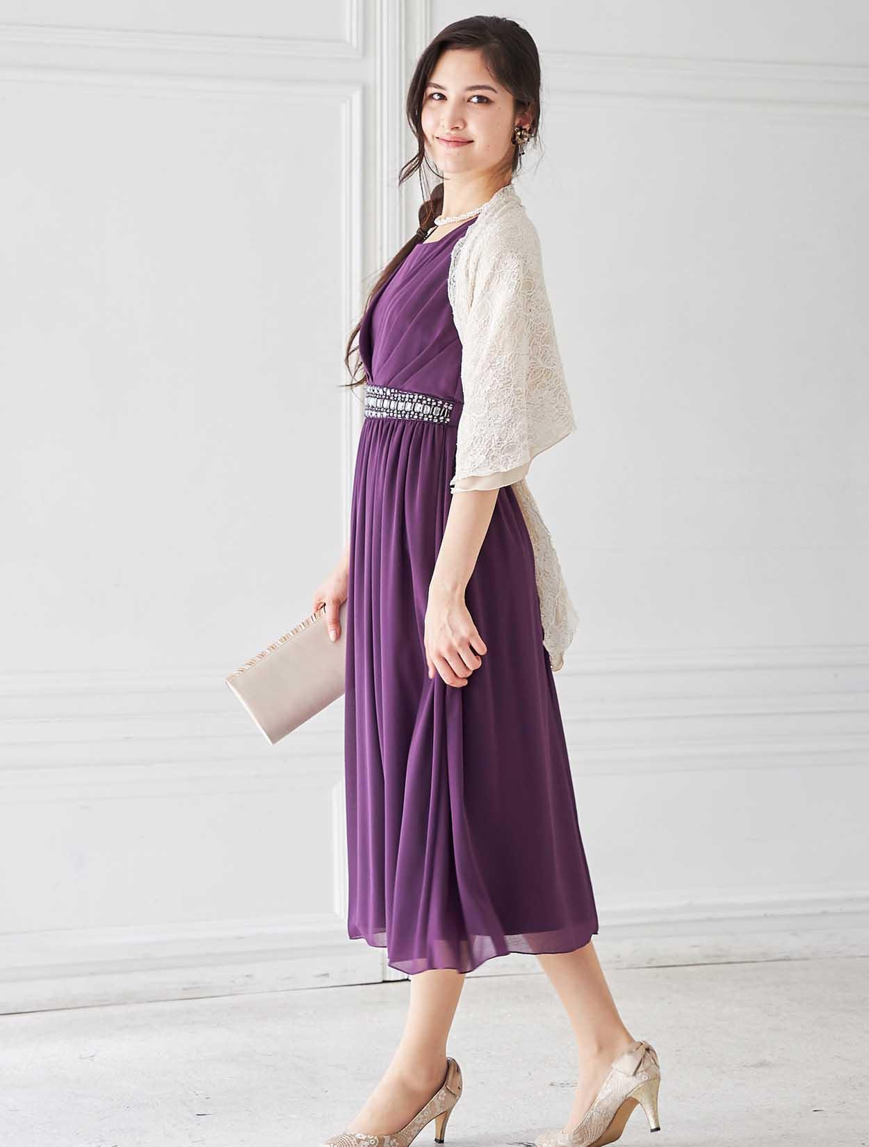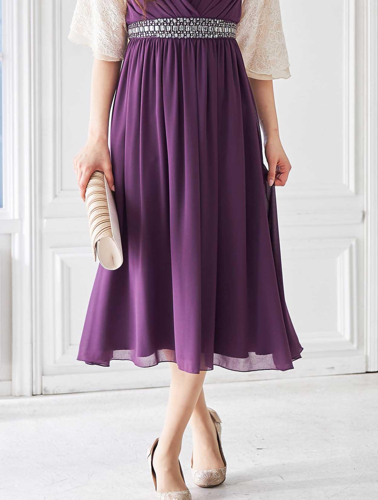 軽やかなシルエットに印象に残るパープルのミディ丈ドレス