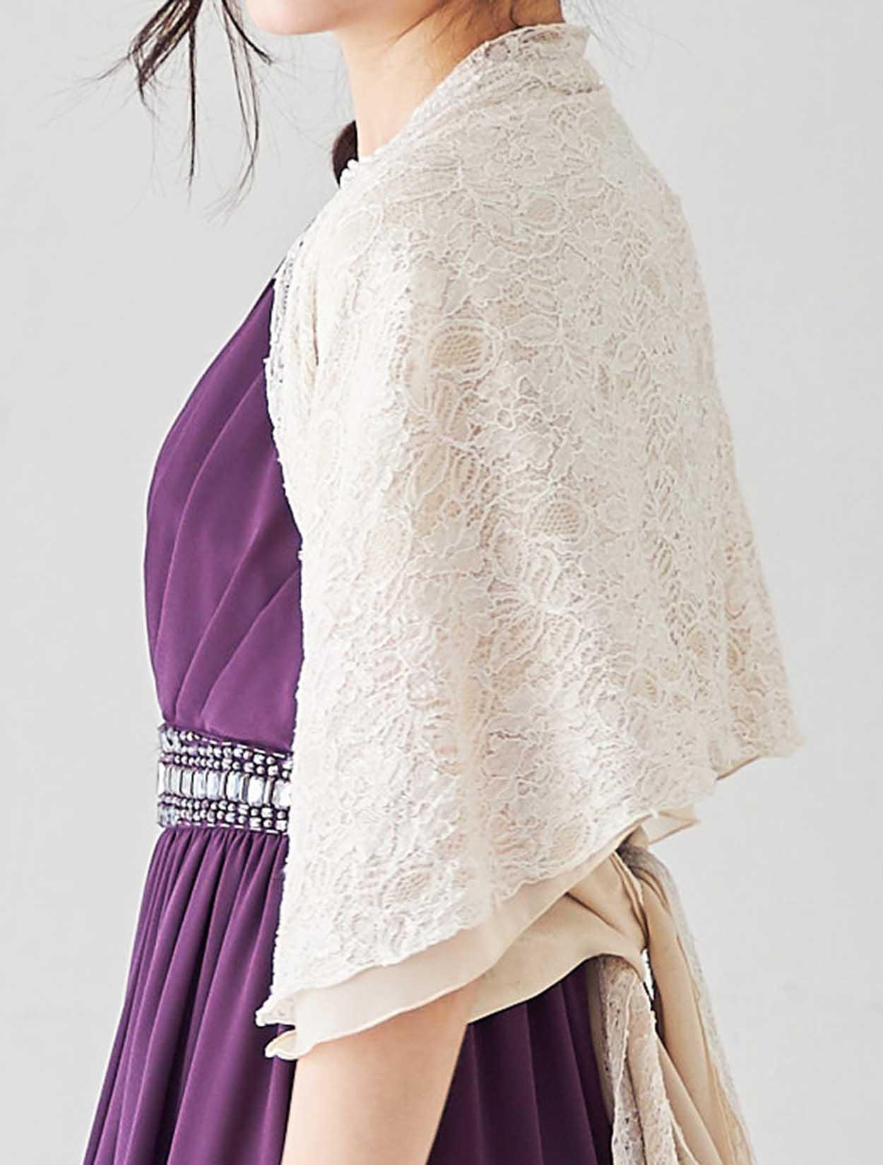 上品なレースをふんだんに使用した高級感のあるショールは、袖通し付きのデザインで着崩れの心配もありません。