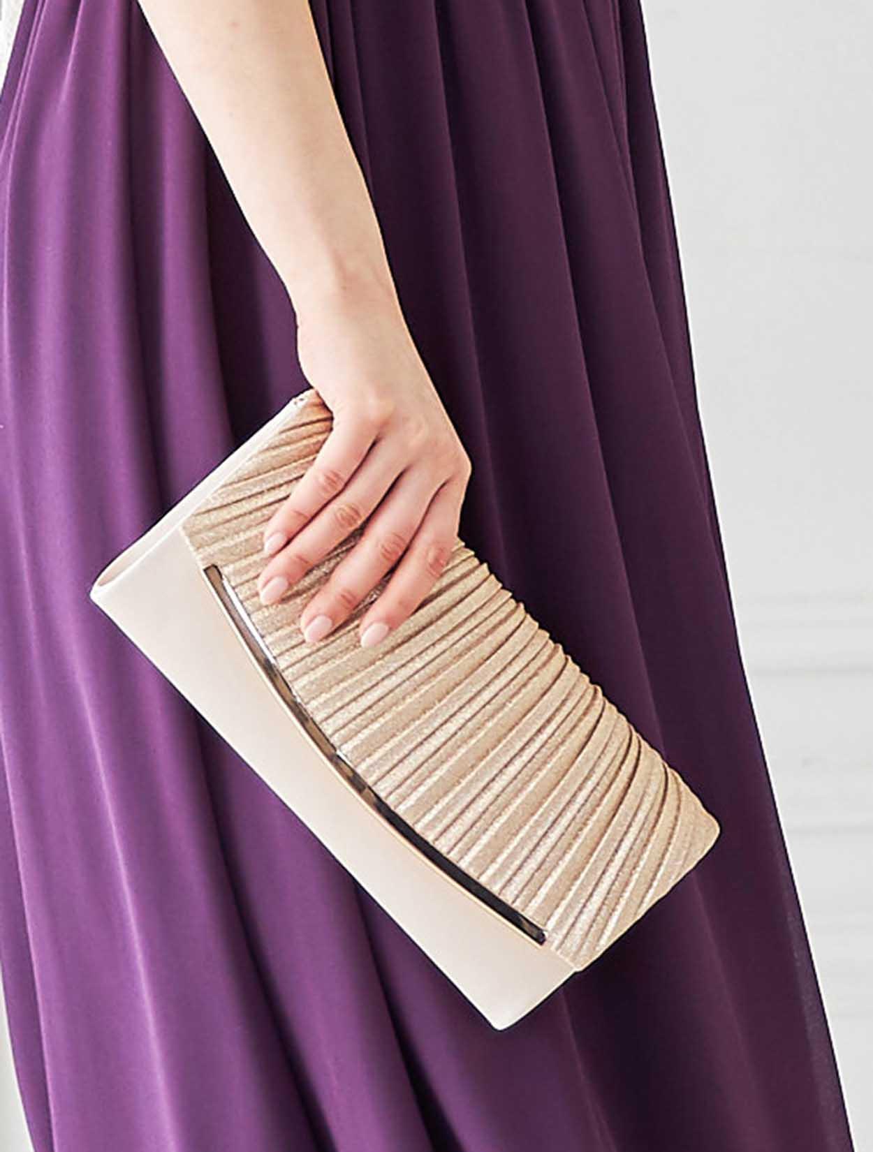 差をつける豪華パープルドレス×ベージュ系小物の個性が光るコーディネート。