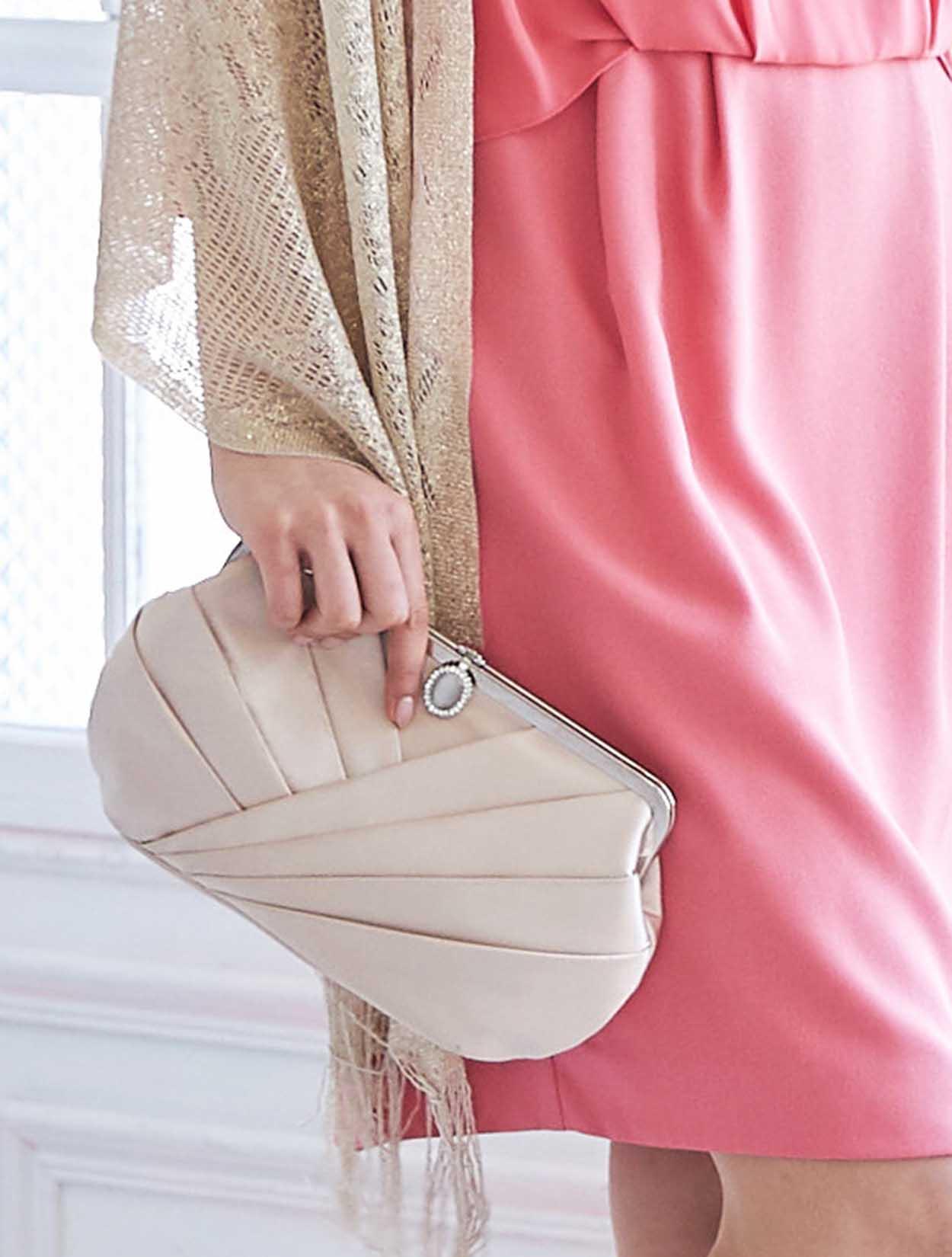 華やかなピンクを落ち着いた雰囲気にさせてくれるベージュの小物を合わせたコーディネート。