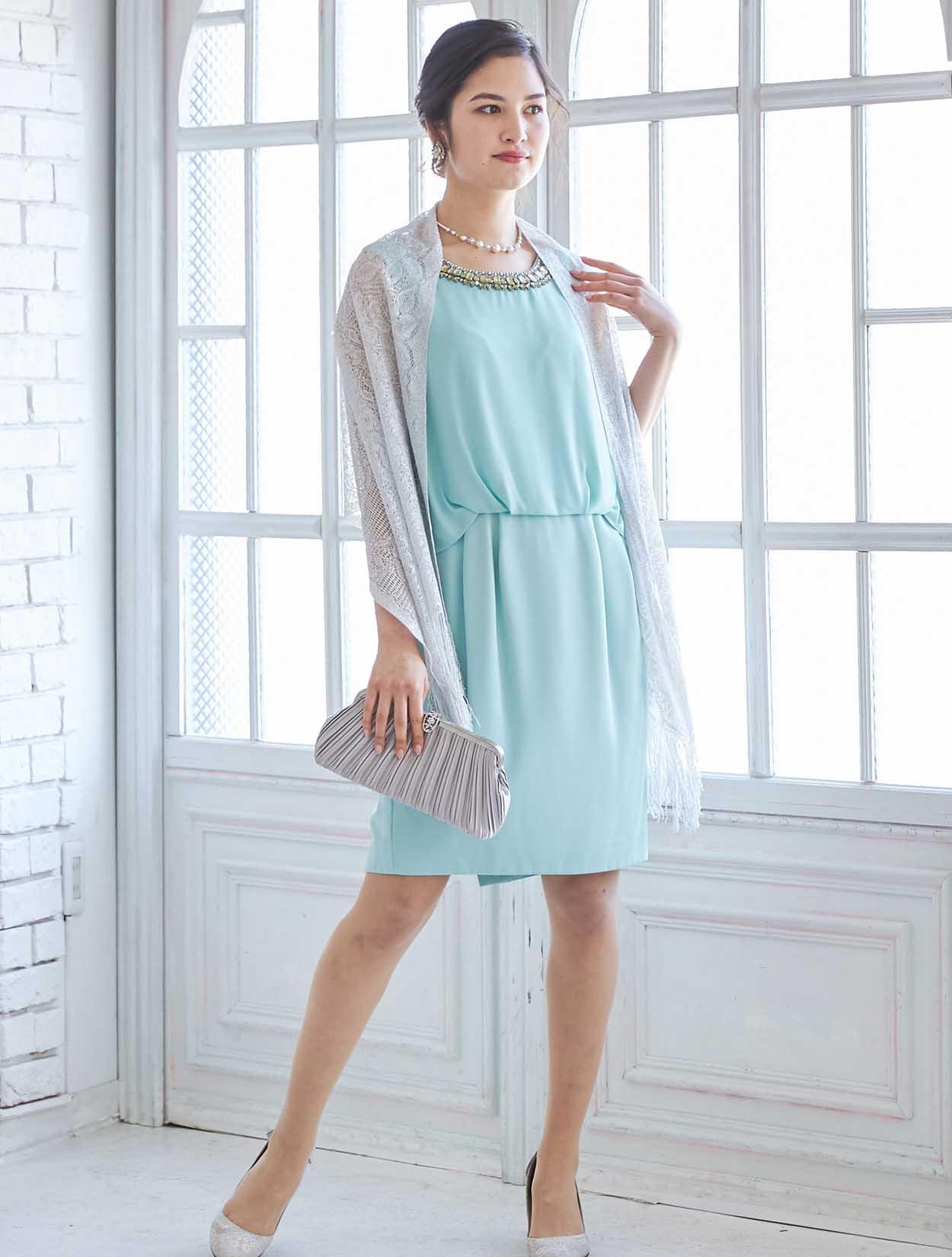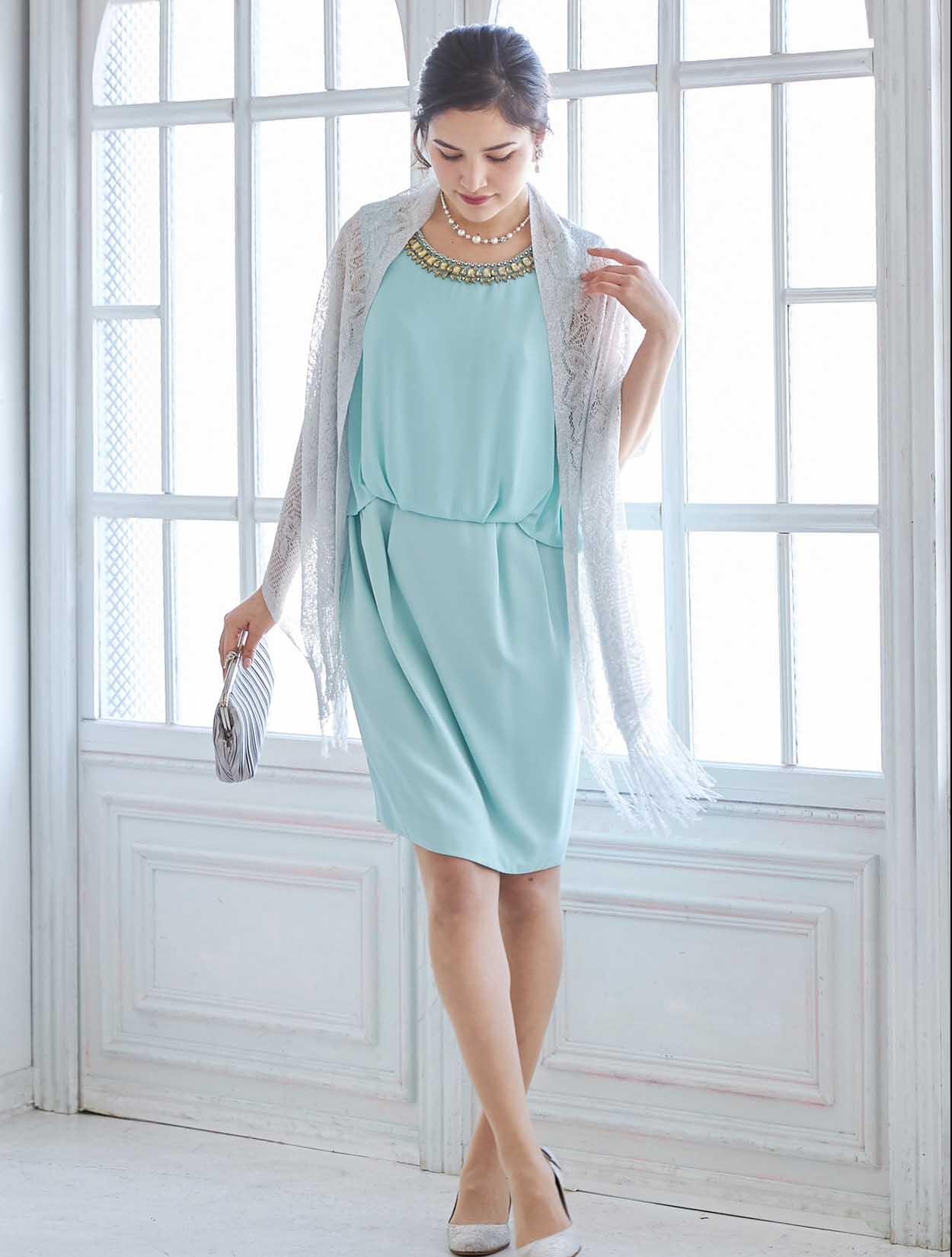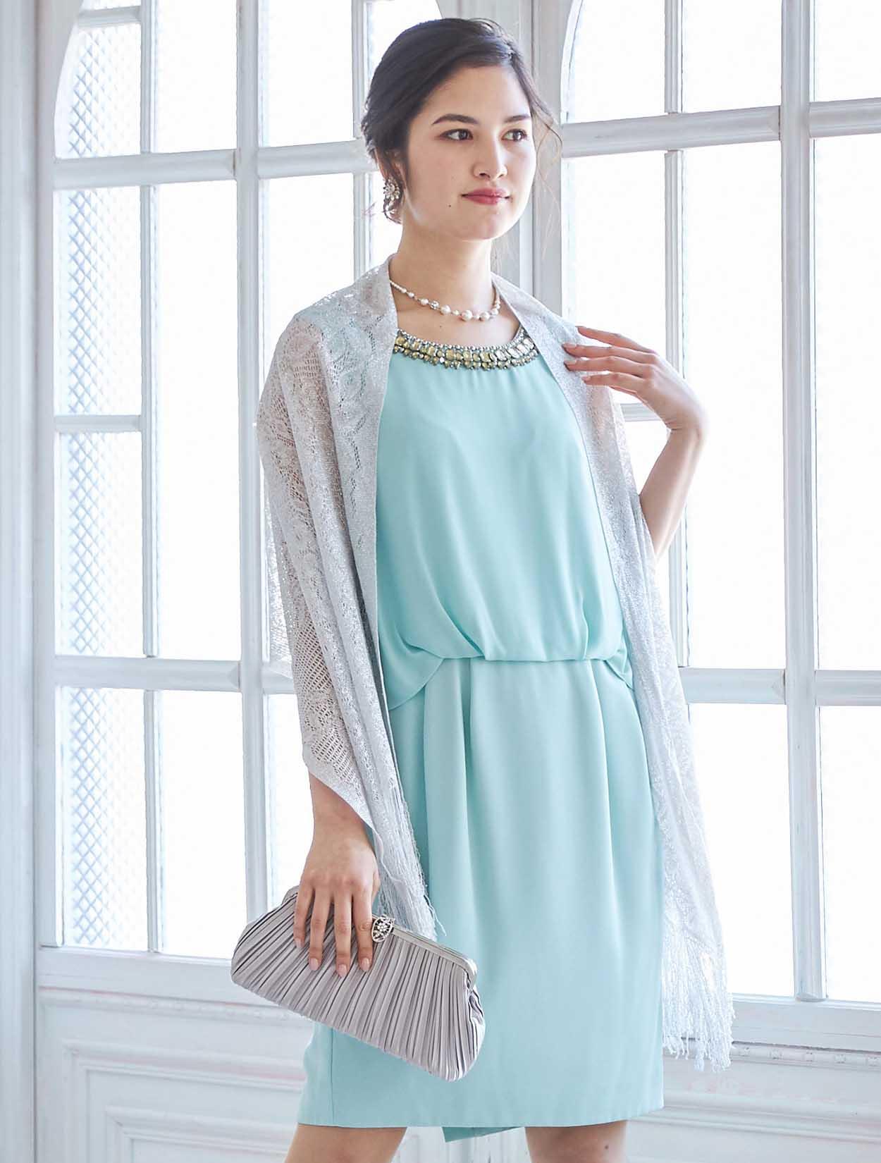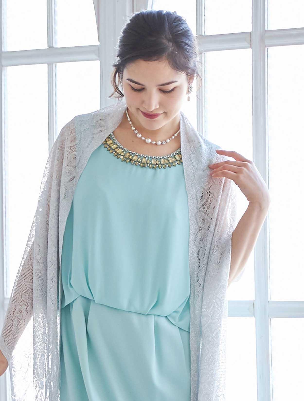 胸元のビジューが顔周りを明るくみせてくれる華やかなドレスです。