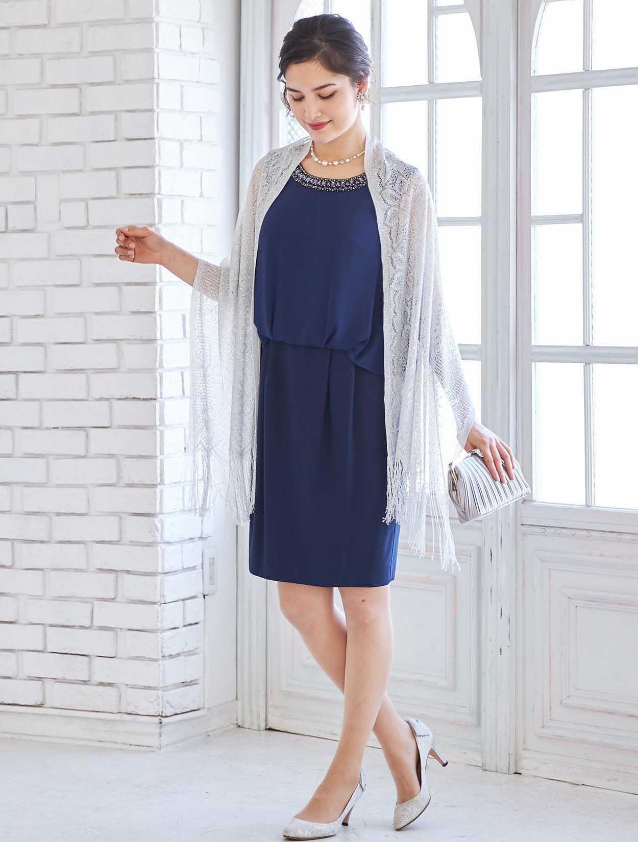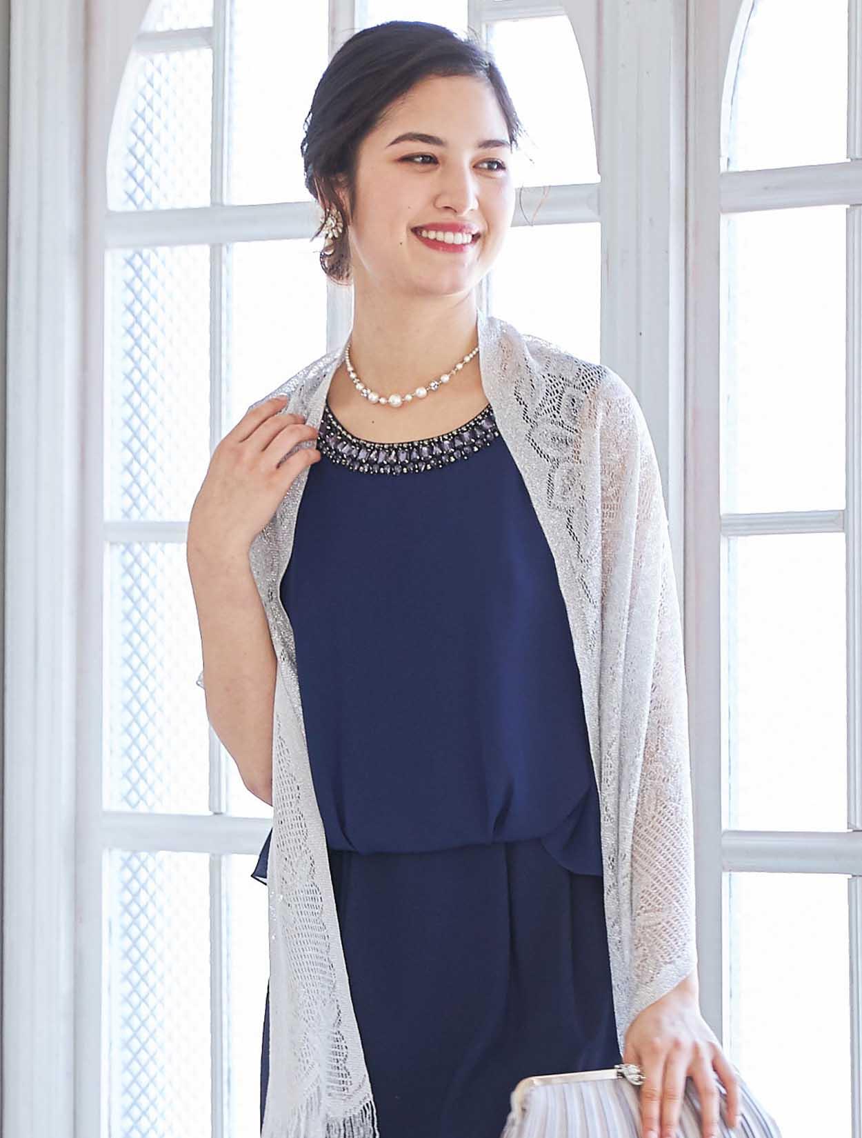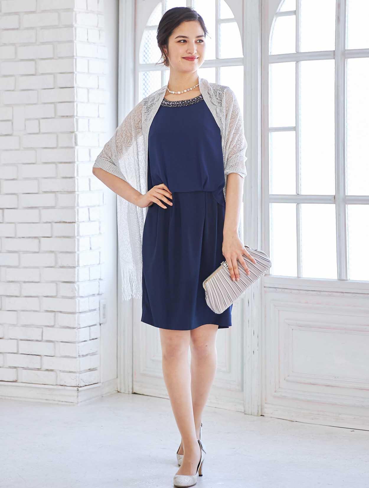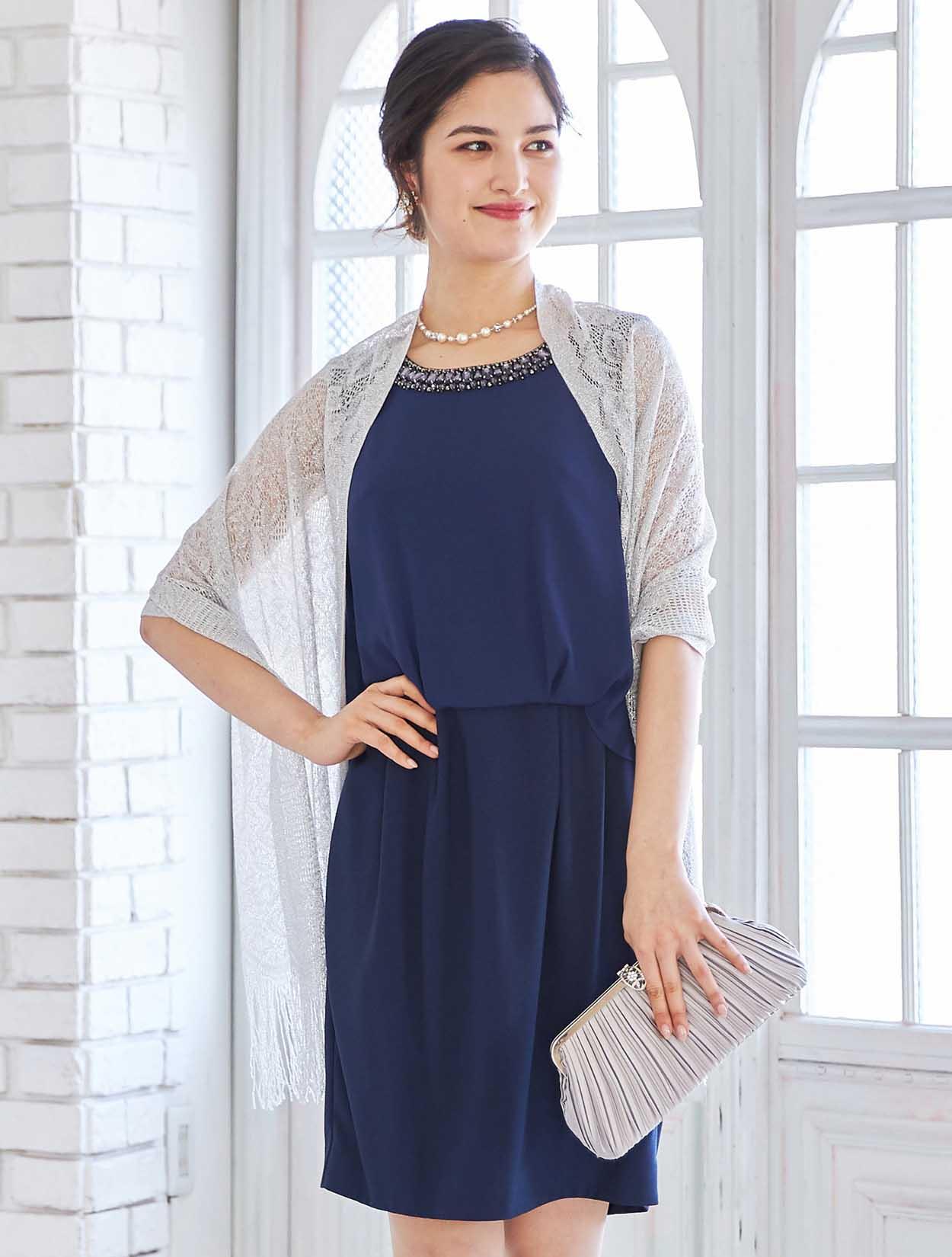 胸元のビジューが顔周りを明るくみせてくれる華やかなドレスです。