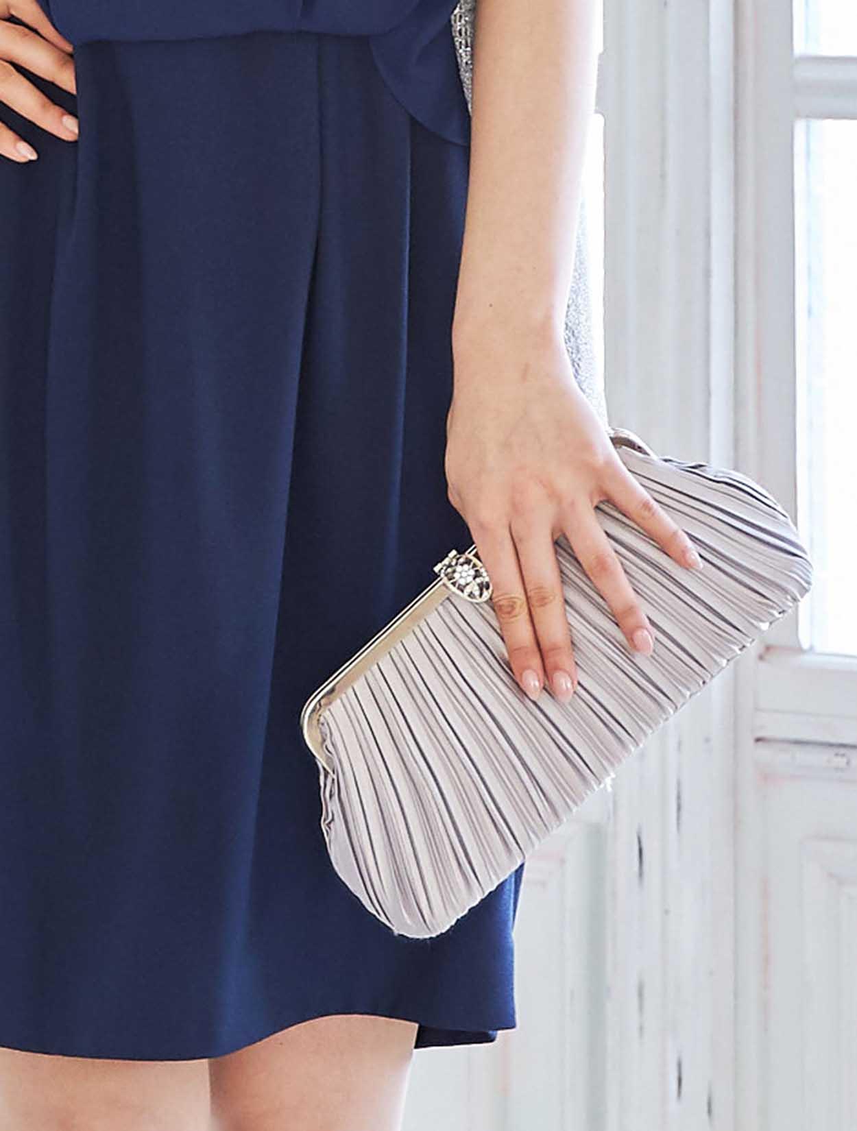 バッグのプリーツの縦ラインが大人っぽいドレスをよりスッキリとした印象に。