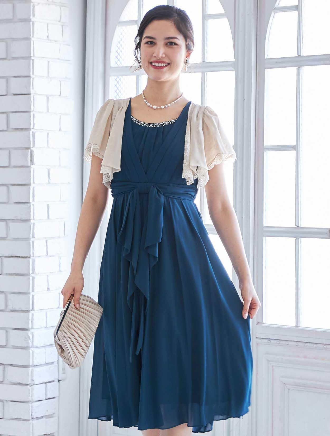 アンダーバストに近いハイウエスト切り替えで、脚長効果のあるドレス。ウエスト背中はゴム仕様で余裕がありますが、正面はもたつかず着痩せして見えるデザインです。カシュクールデザインのVラインが上半身をスッキリ見せてくれます。首元が詰まったデザインが苦手な方や、首が短いのがお悩みの方におすすめです。丈が長過ぎないので、小柄な方でもバランスよく着こなせます。ネックラインにはビーズの刺繍があり、お顔周りを華やかに見せてくれます。ネックレスはシンプルなデザインがおすすめ。大ぶりのイヤリングならネックレスはなくても寂しくありません。被りで着て、首後ろのボタンを一つ留めるだけ。楽に着られるので、背中ファスナーが苦手な方や一人でお着替えする方に人気です。