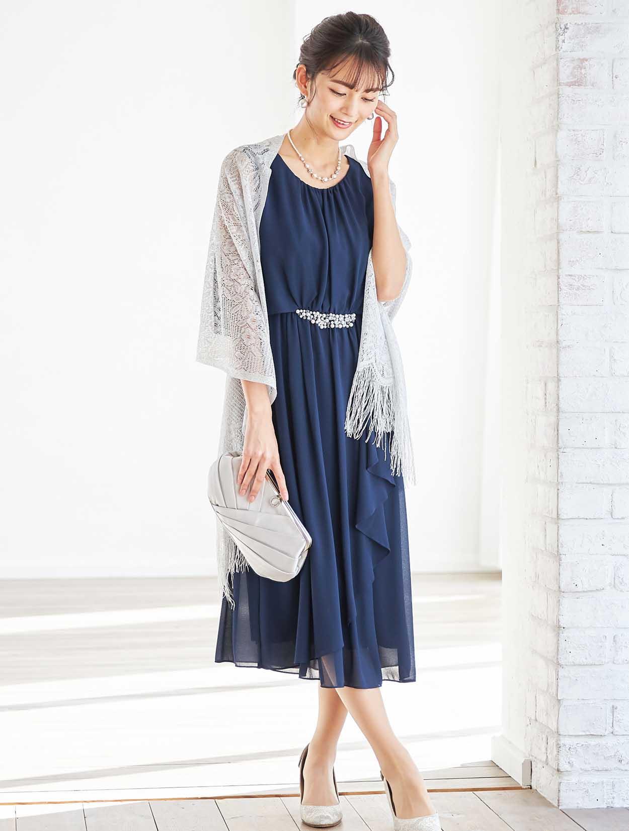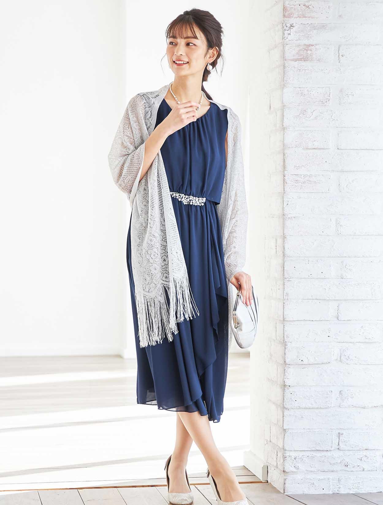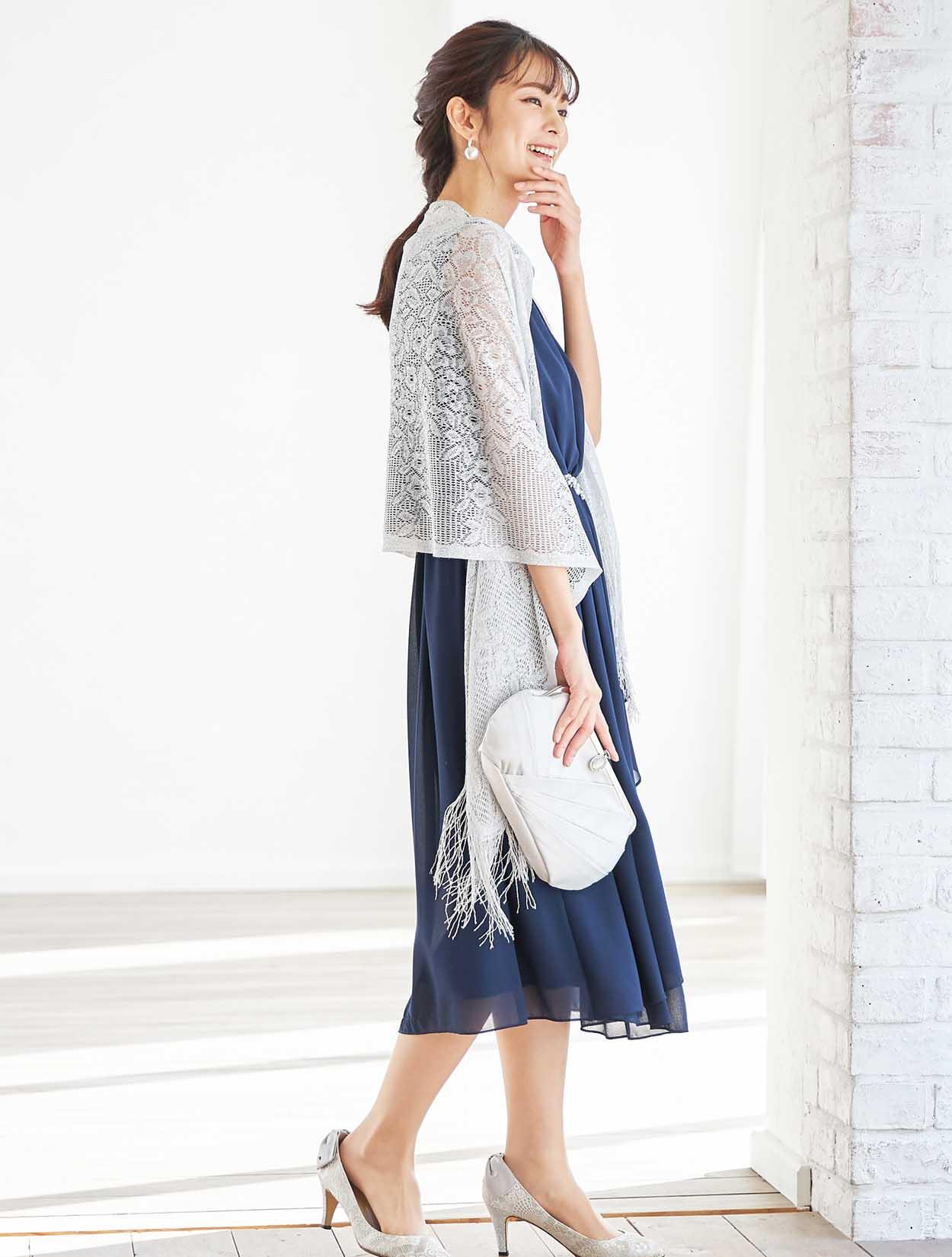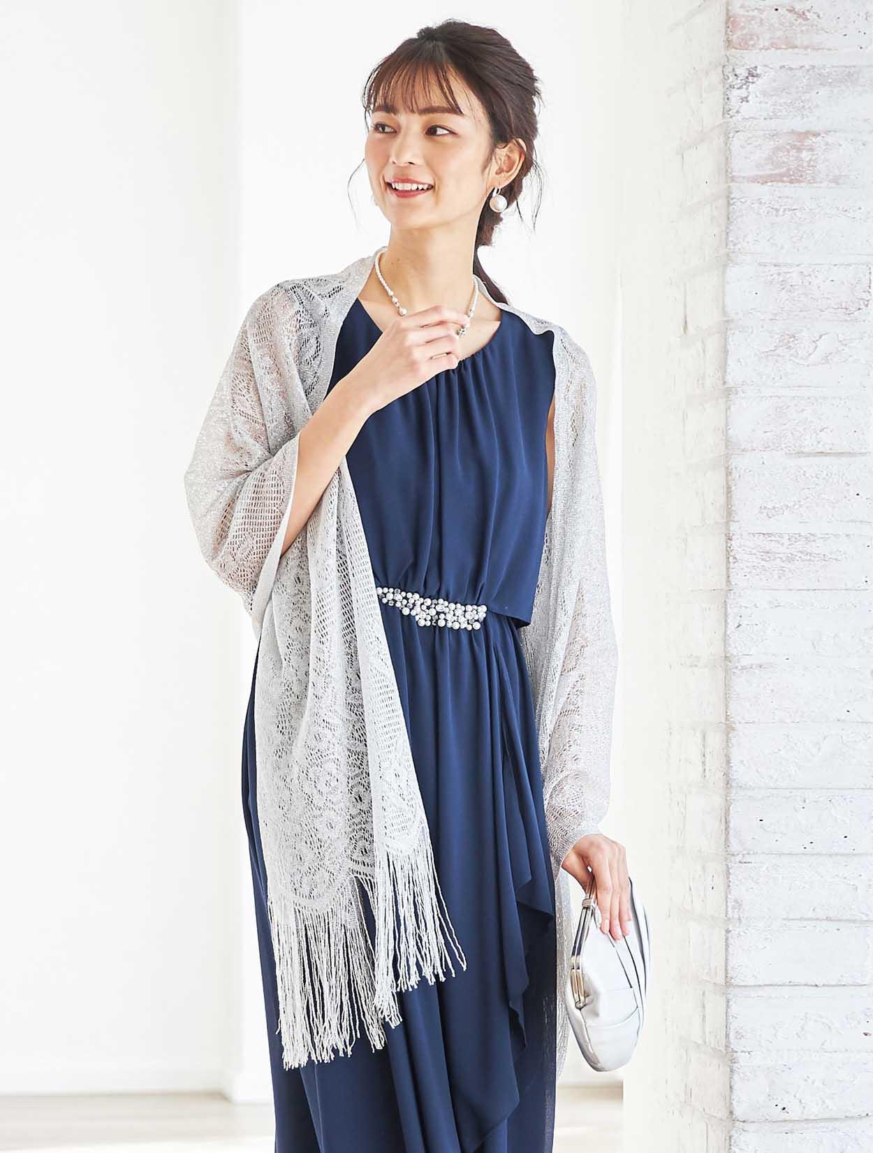 落ち着いた印象のネイビーのドレスは、ラメストールを羽織ると華やかなパーティースタイルに。