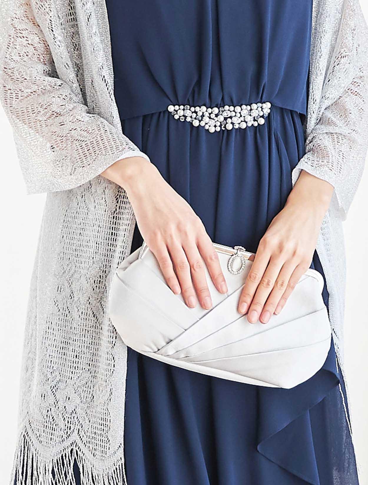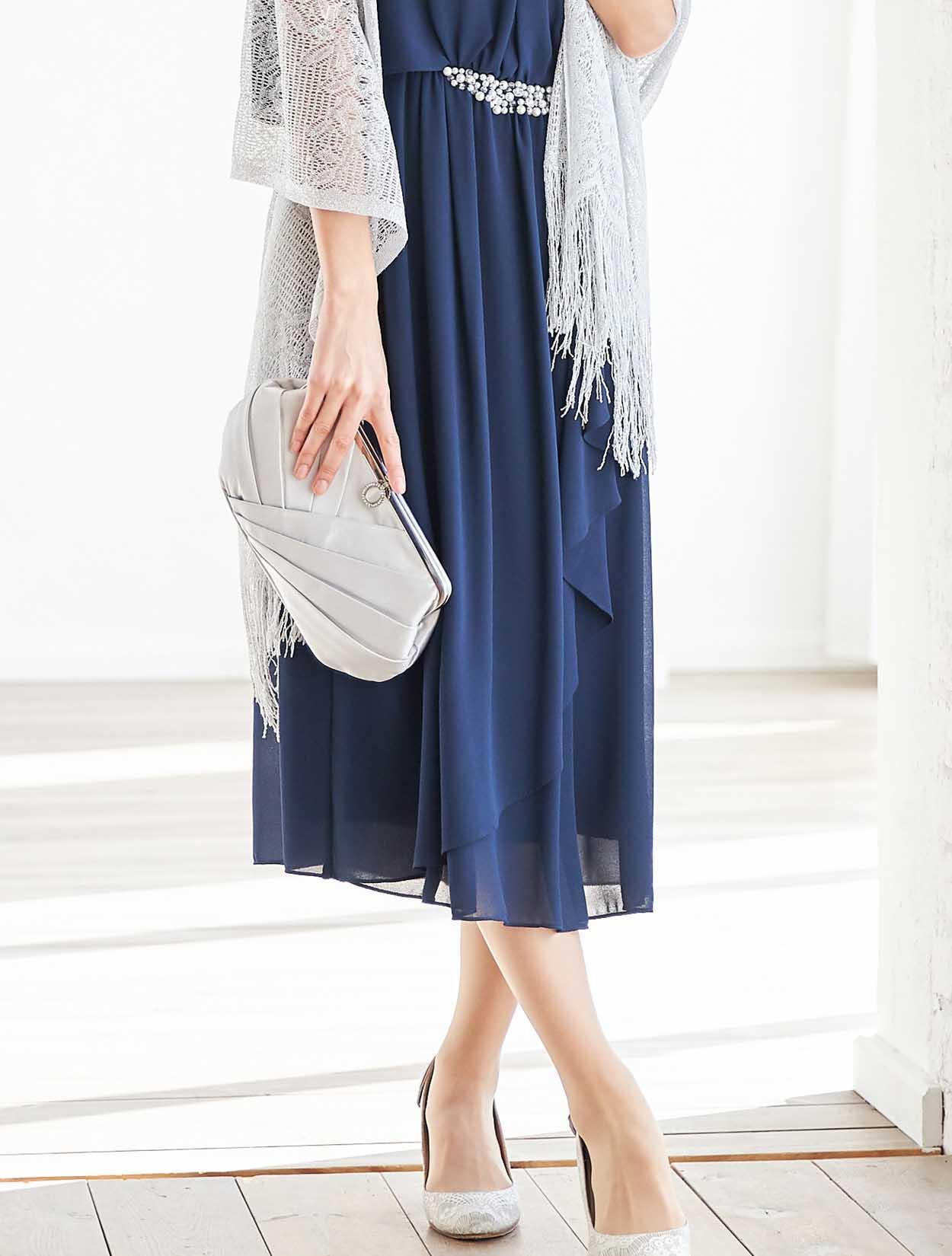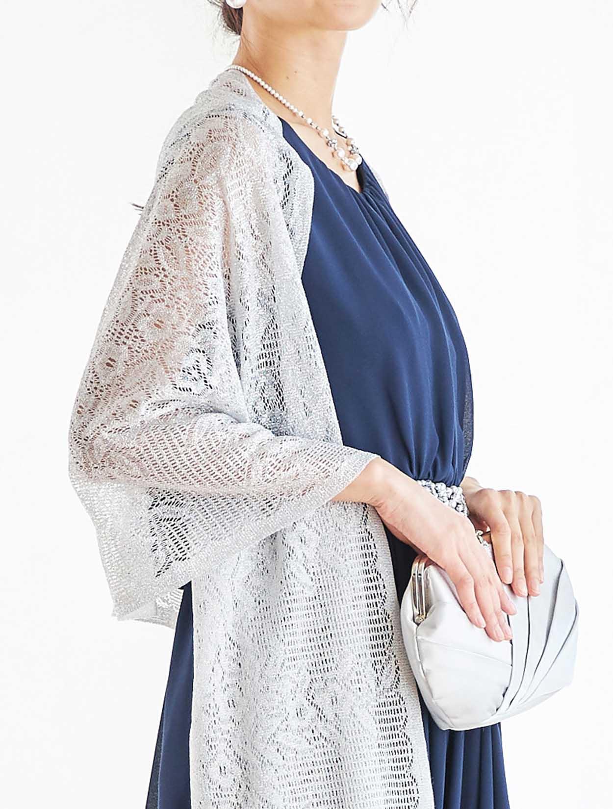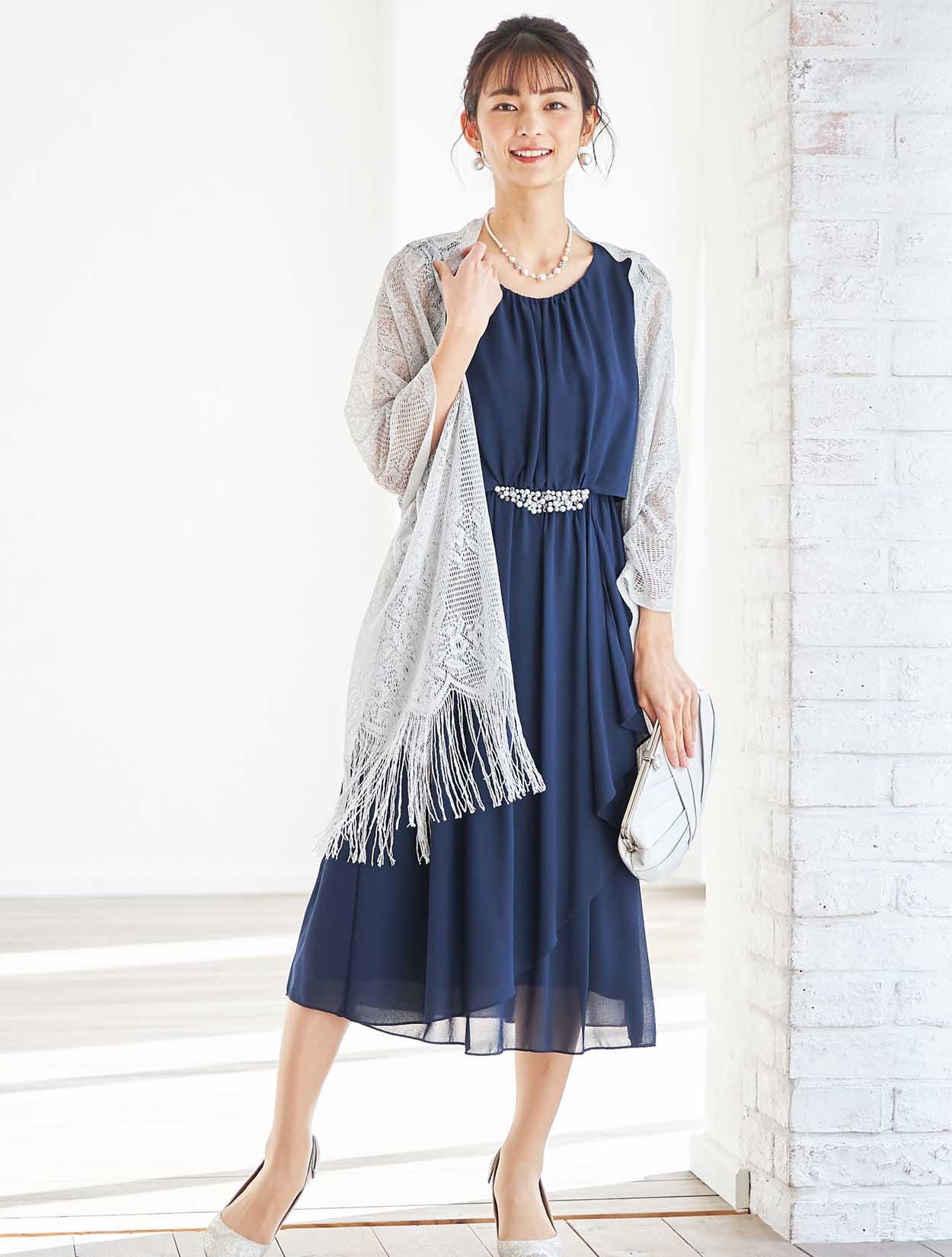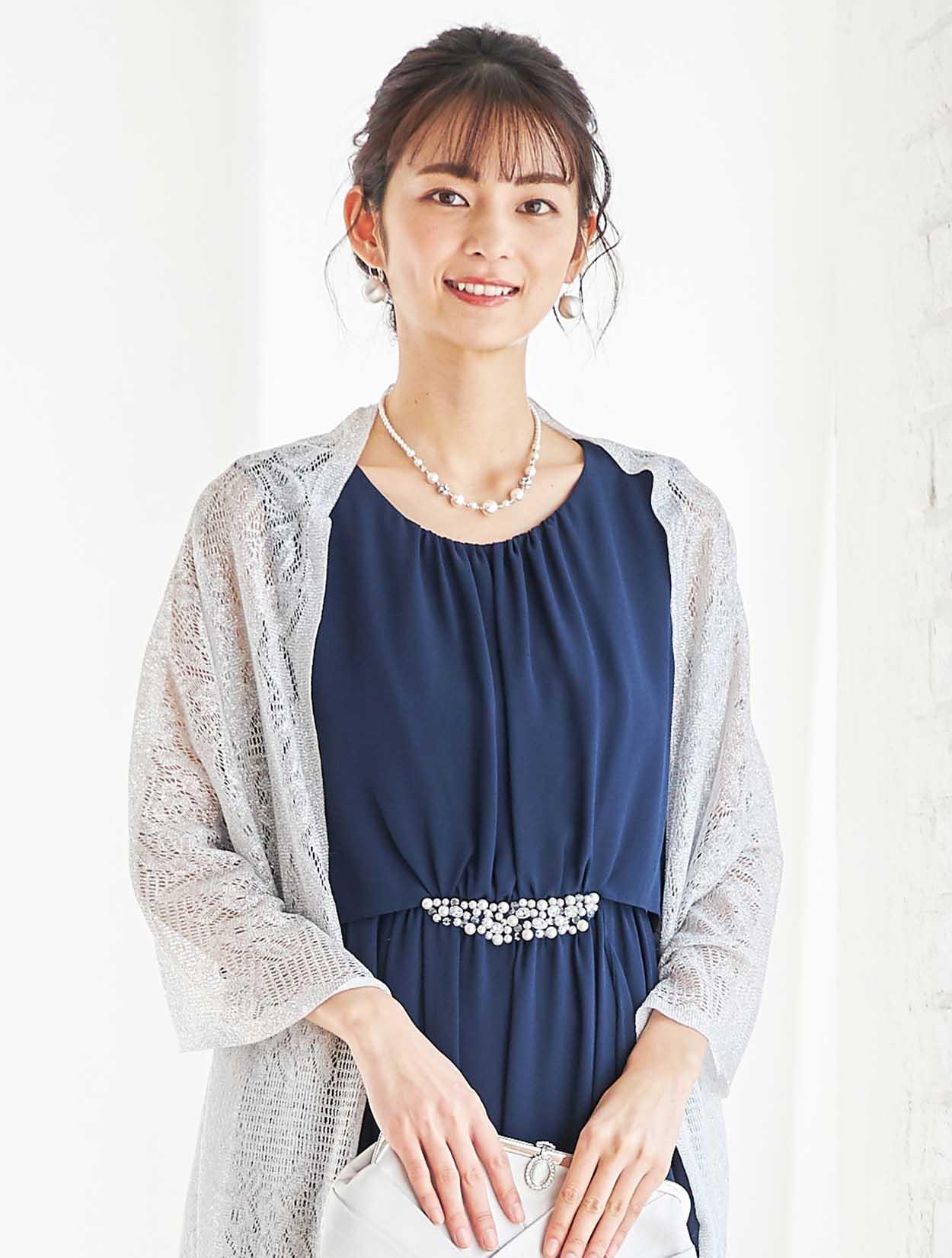 落ち着いた印象のネイビーのドレスは、ラメストールを羽織ると華やかなパーティースタイルに。