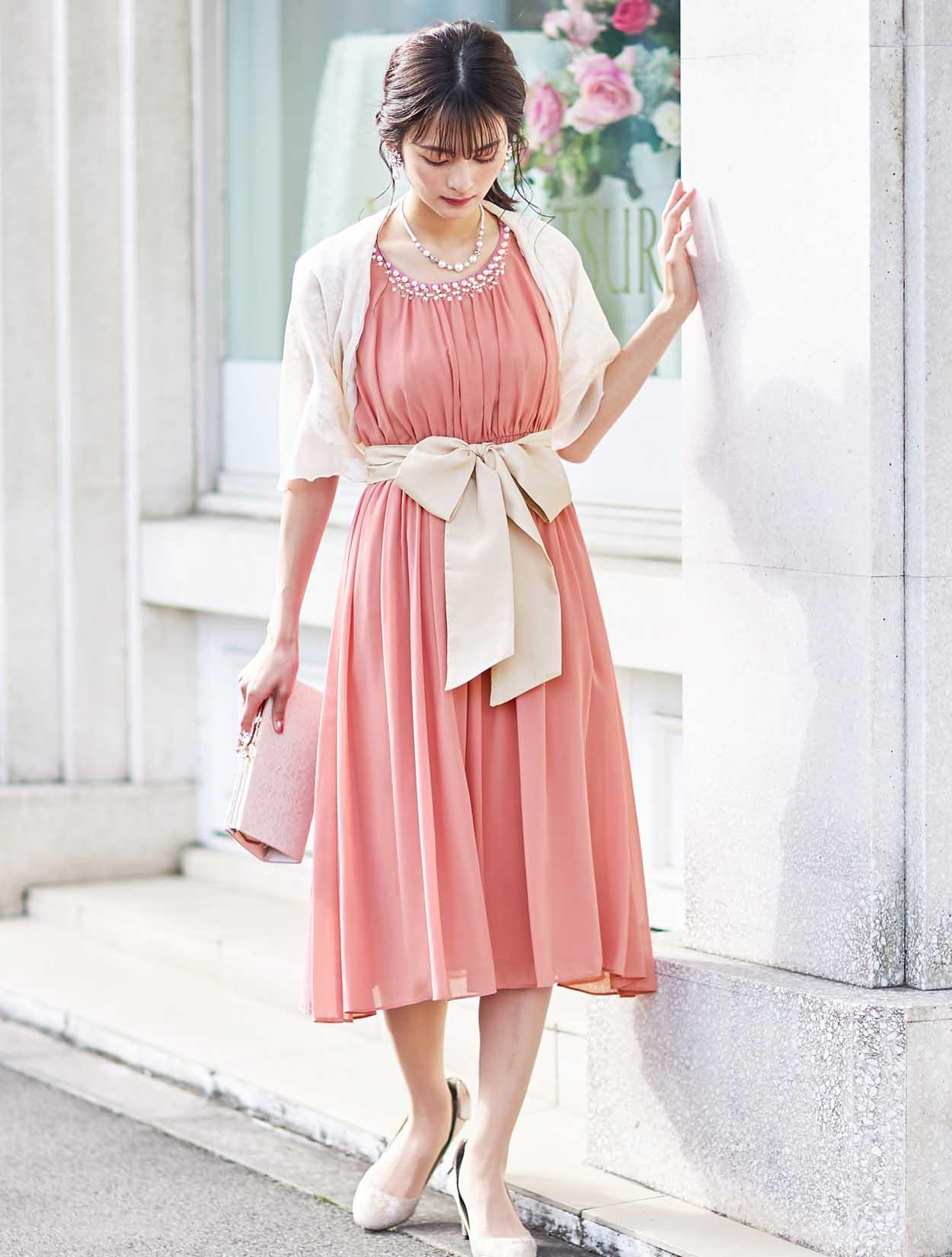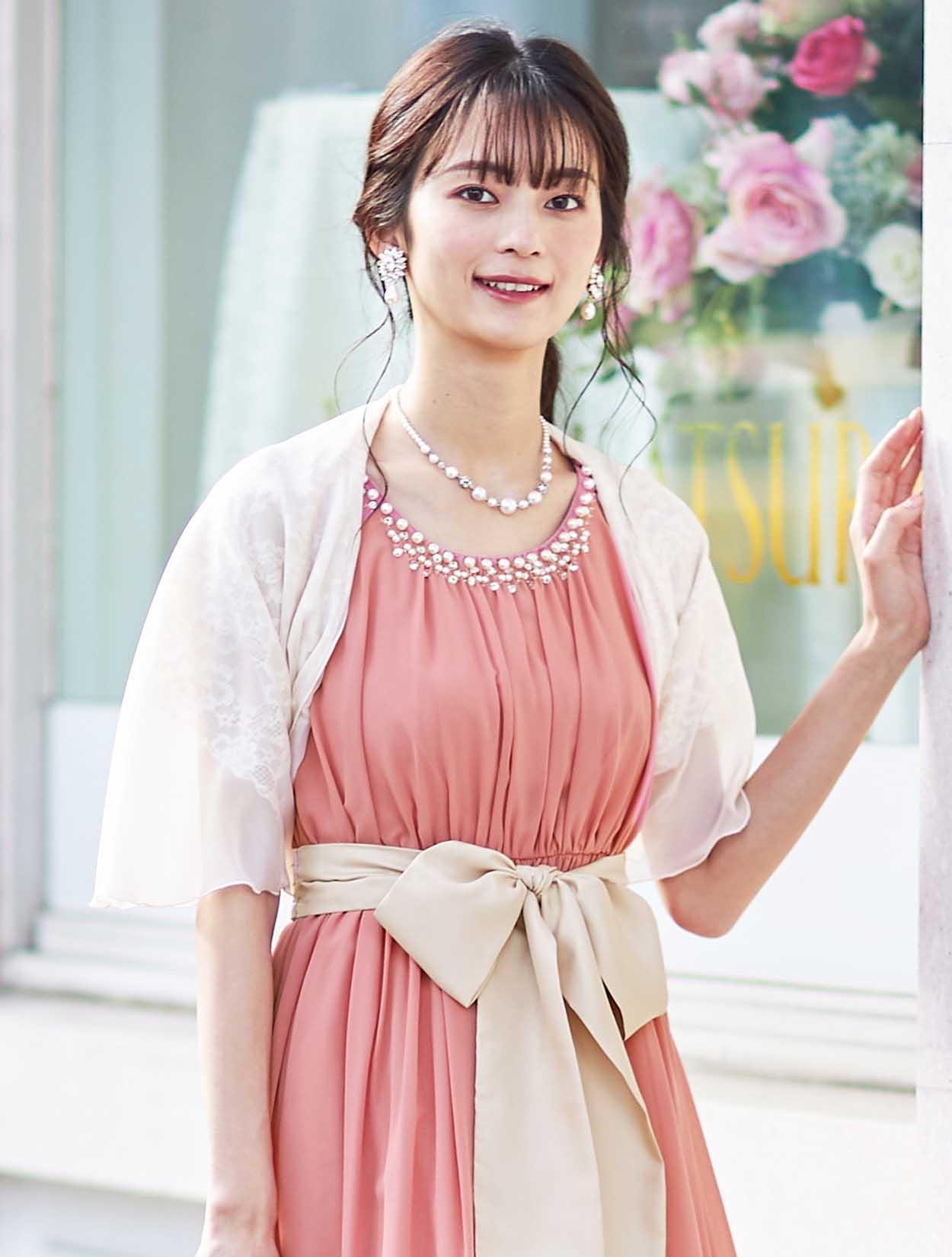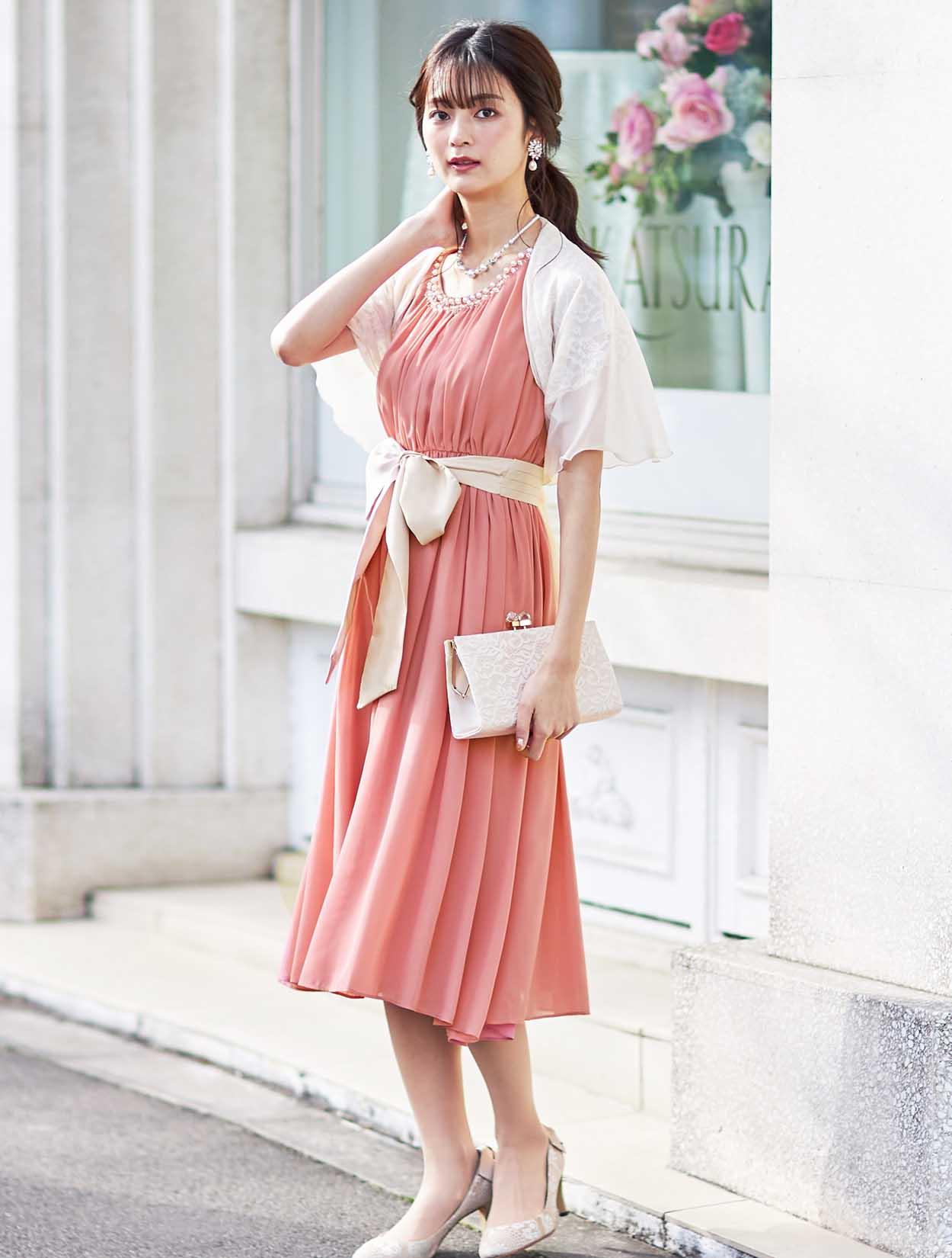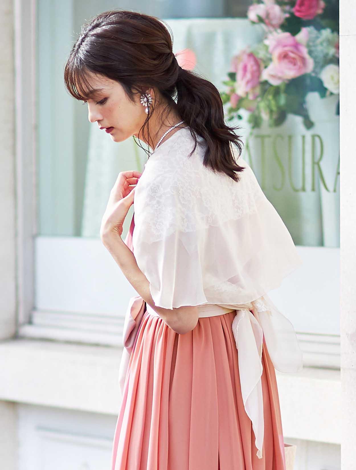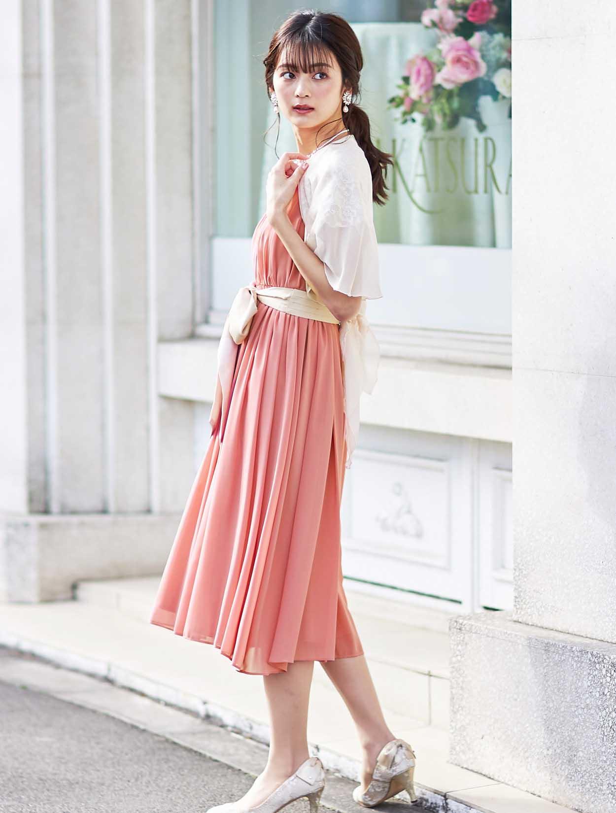 可愛さが魅力のふんわりドレスは、ショールを合わせてちょっぴり大人な雰囲気に。