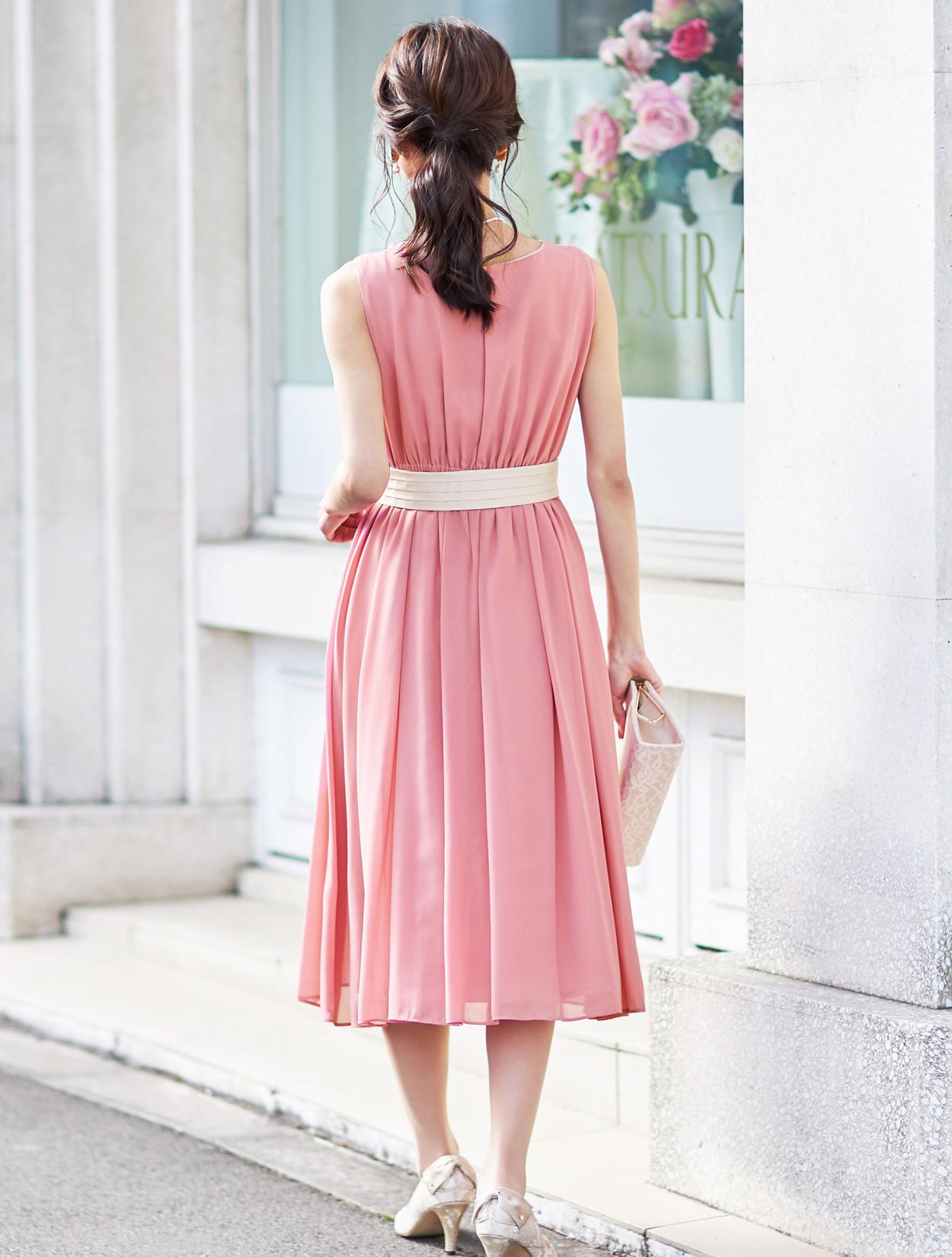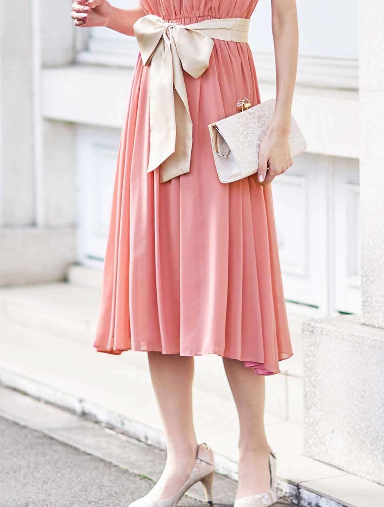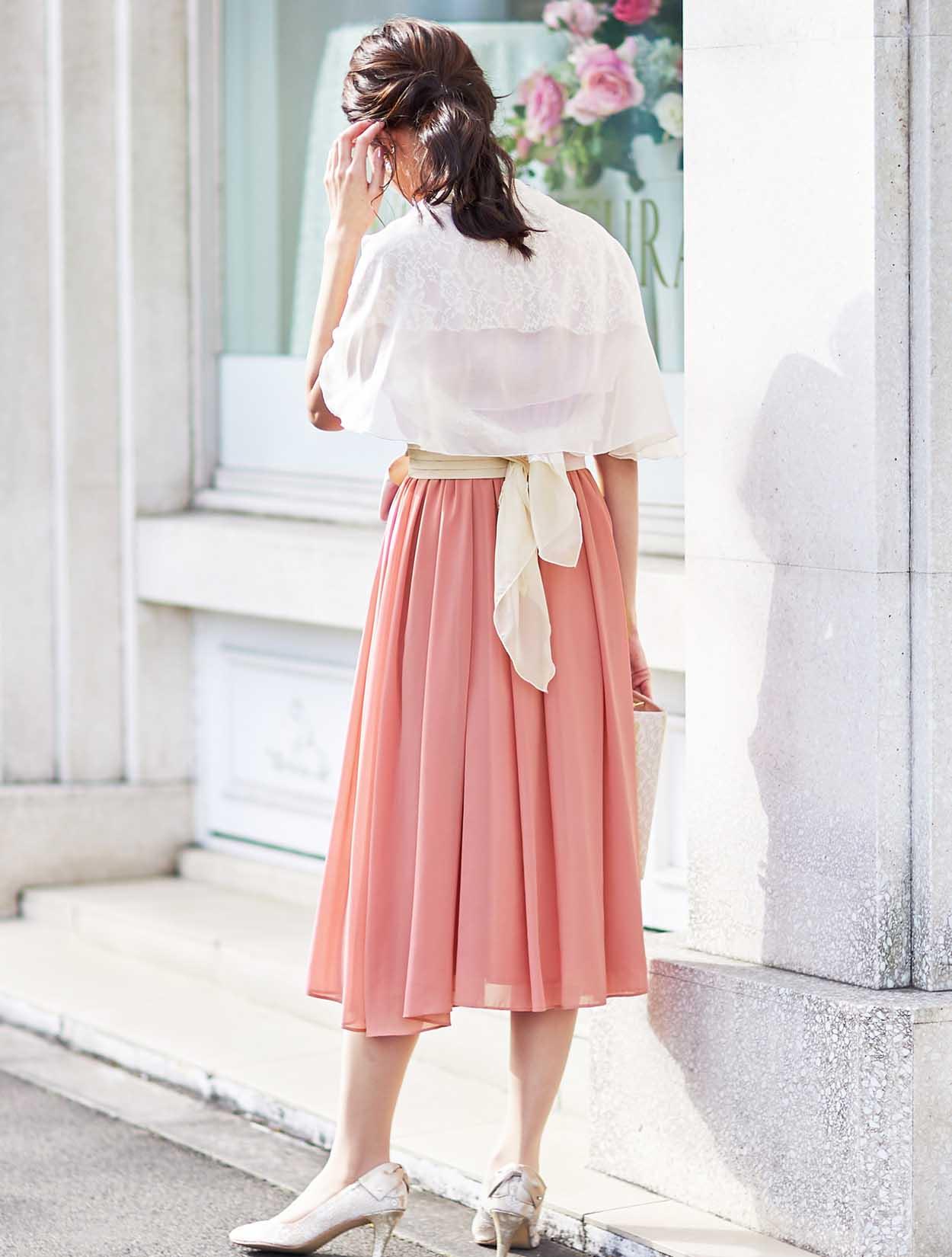 甘くなりがちなピンクカラーも、膝下まであるミモレ丈で大人な印象に。