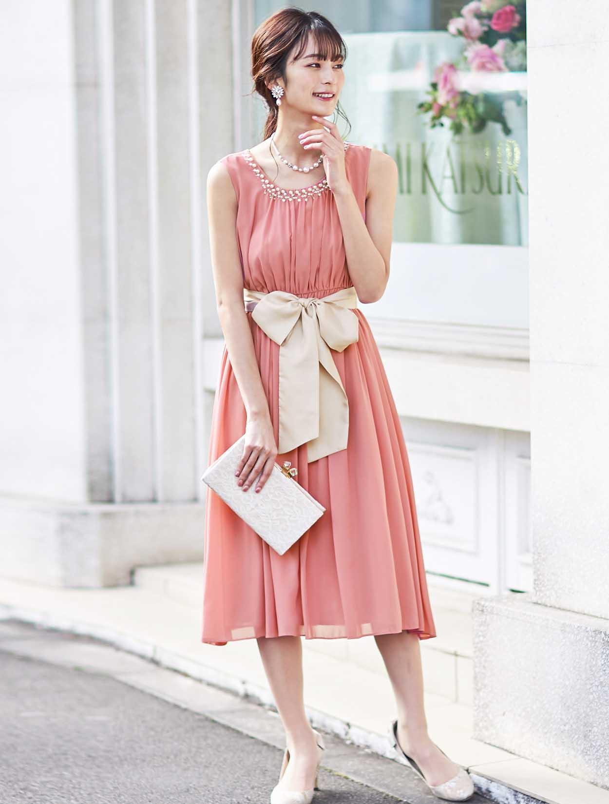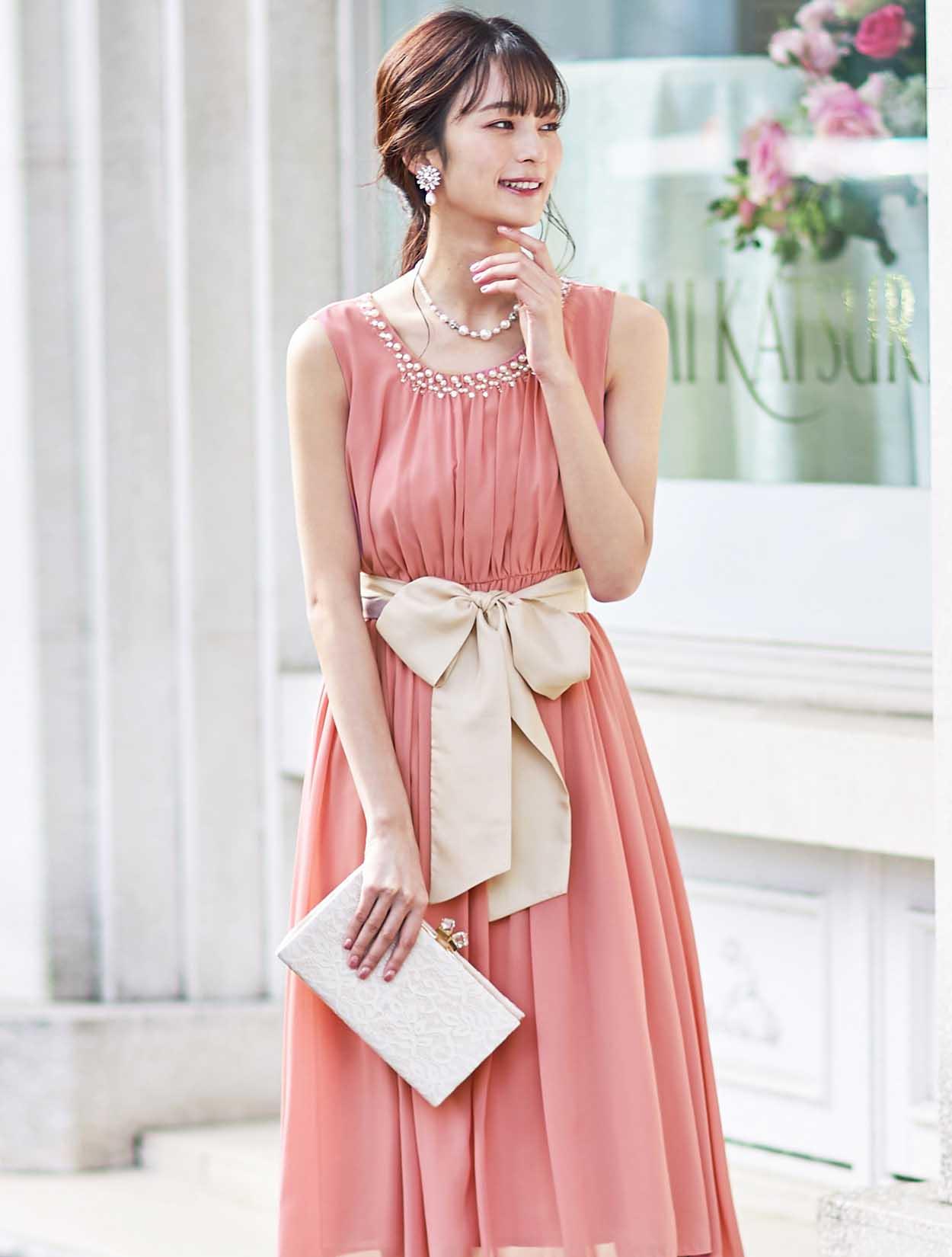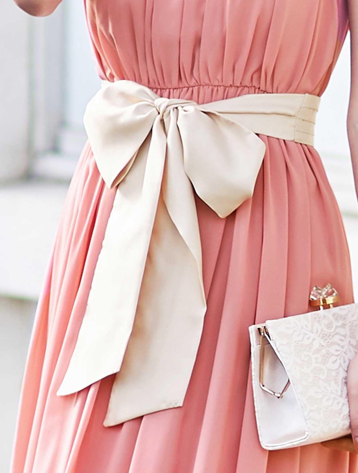 たっぷりと施されたギャザーで、フワッと綺麗なシルエットが女性らしさを演出。ウエストリボンを締めると、胸下でウエストマークがされるので、脚長効果も抜群です。