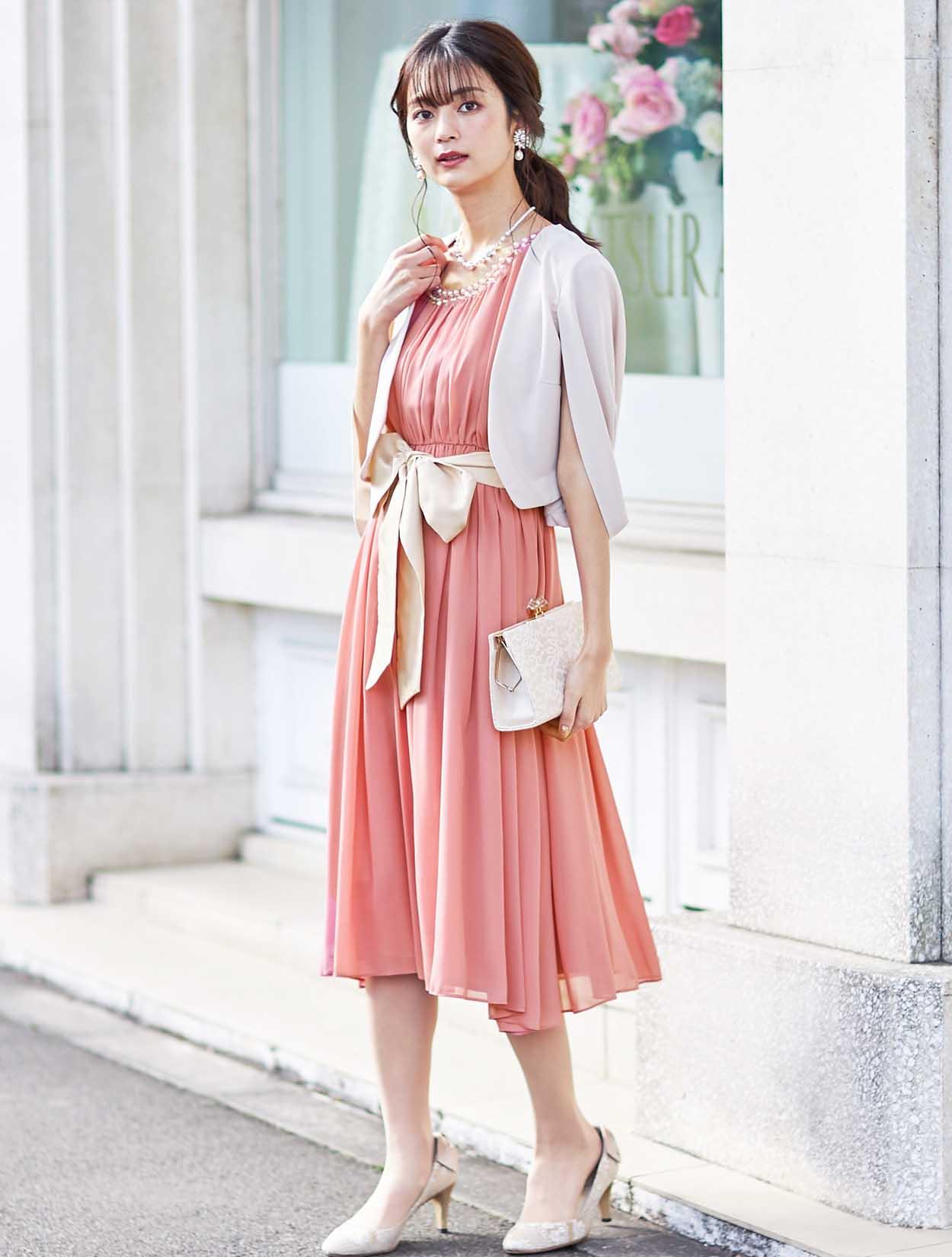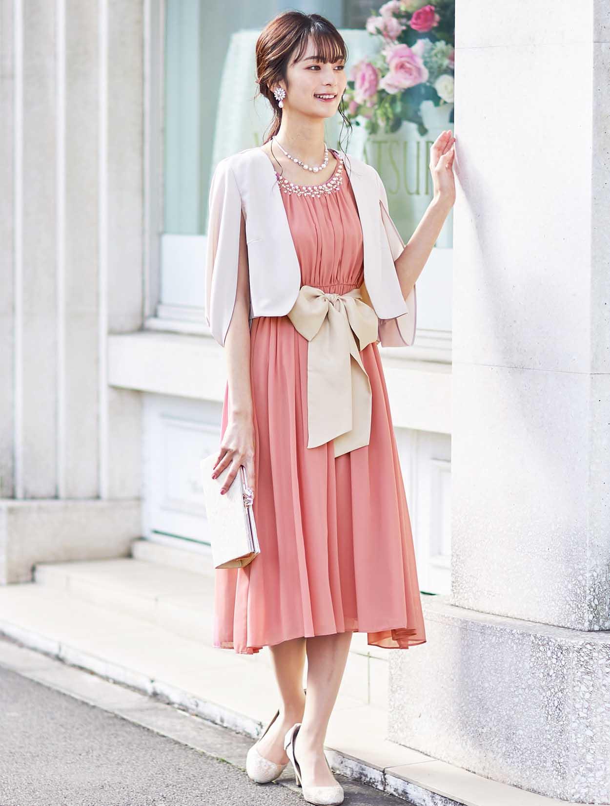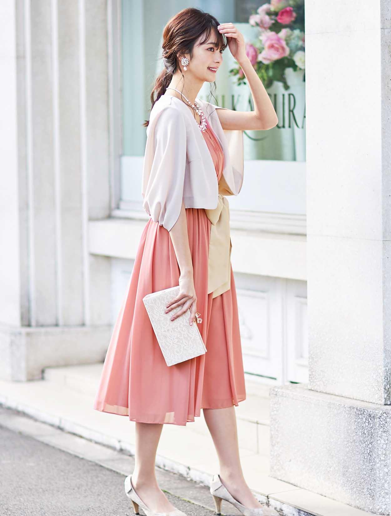 フェミニンなドレスにジャケットを羽織ると、どんなシーンにも対応できるフォーマルな装いに。