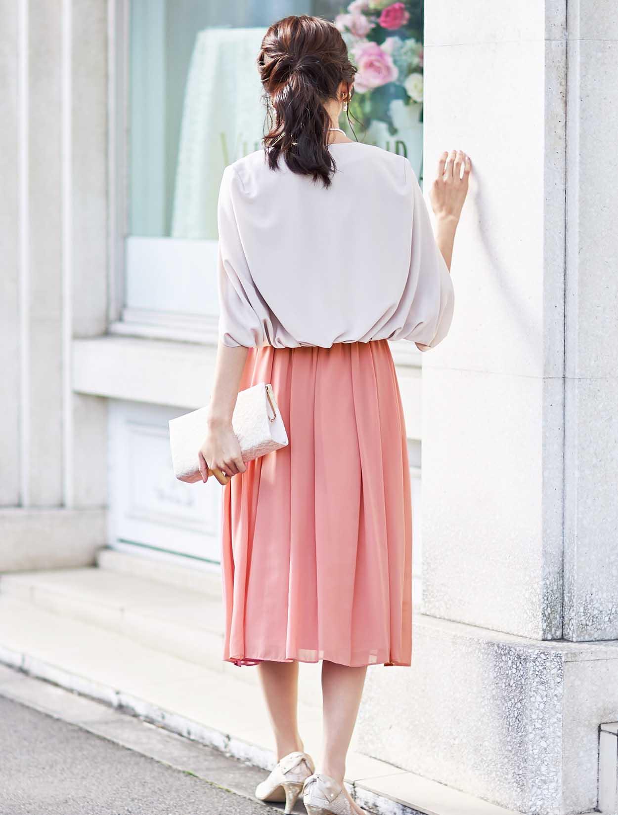 甘くなりがちなピンクカラーも、膝下まであるミモレ丈で大人な印象に。