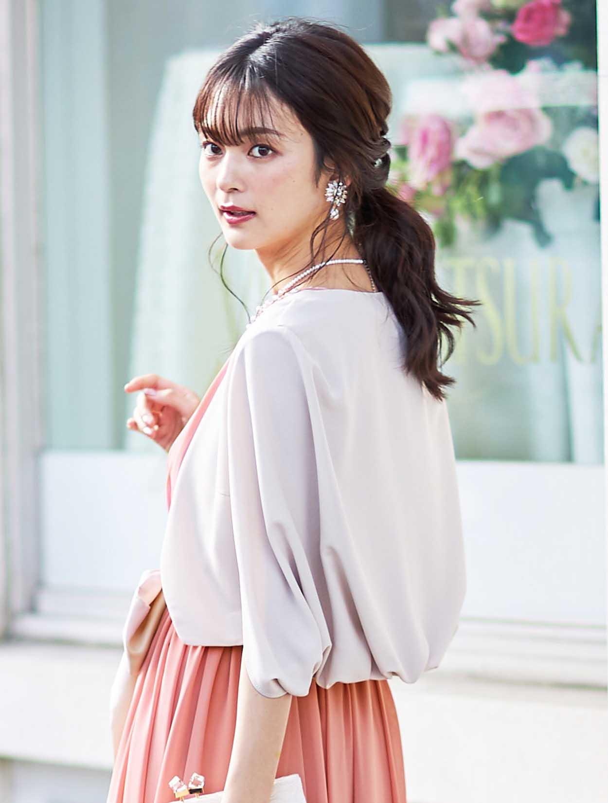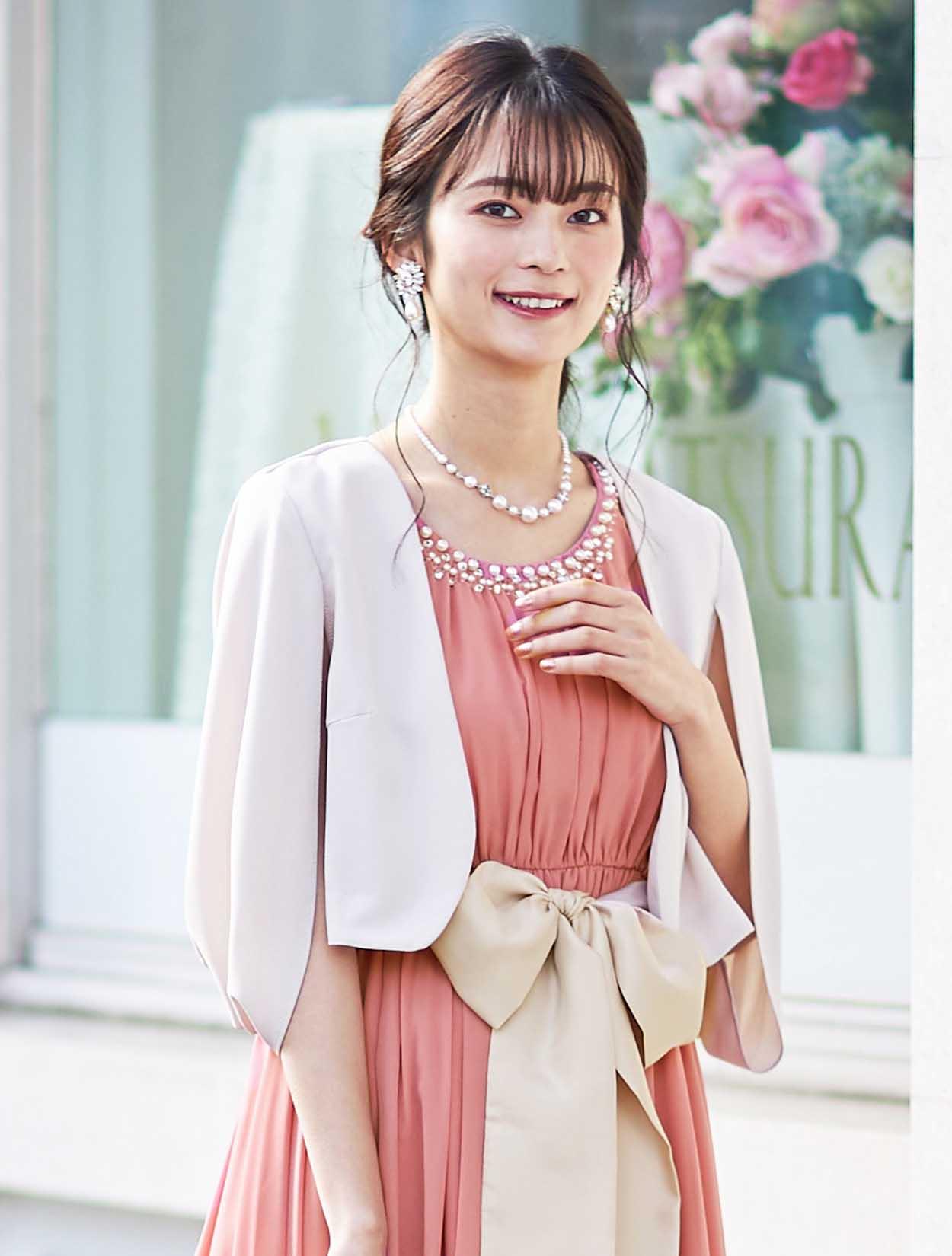 かっちり感のあるジャケットボレロを合わせた、上品なコーディネート。