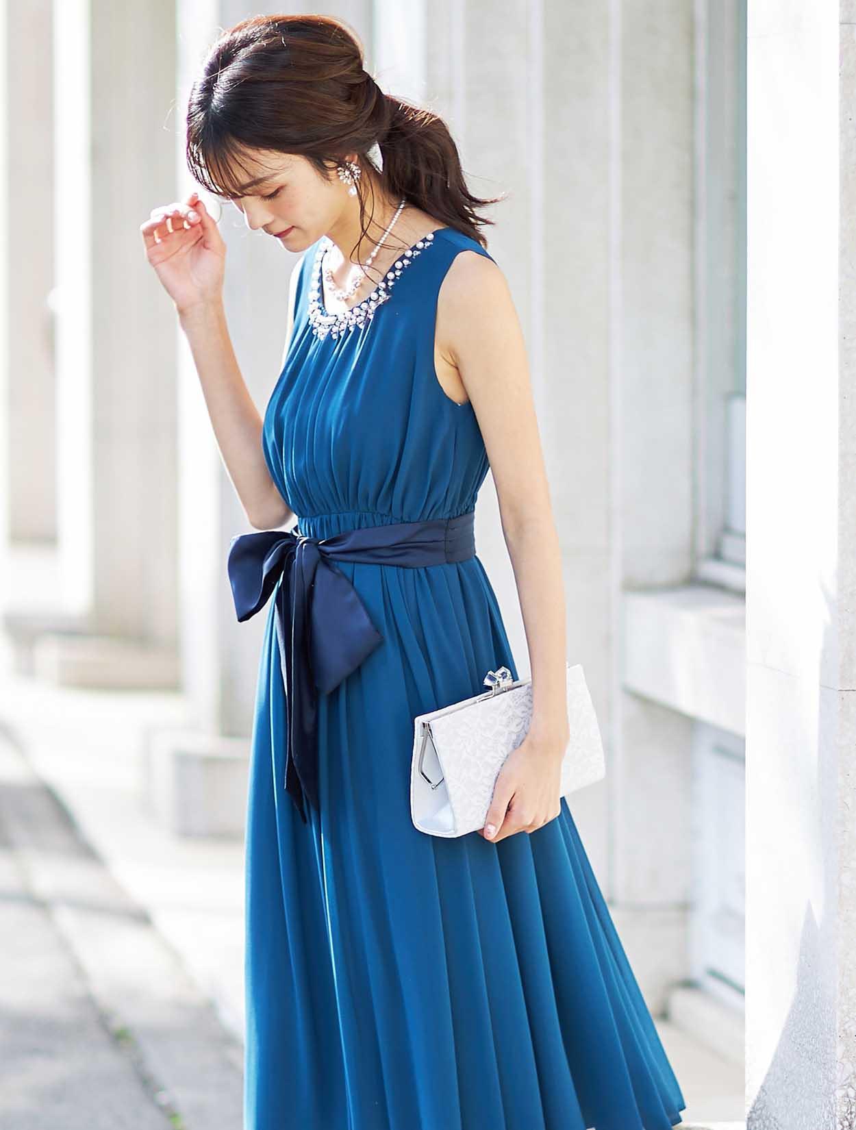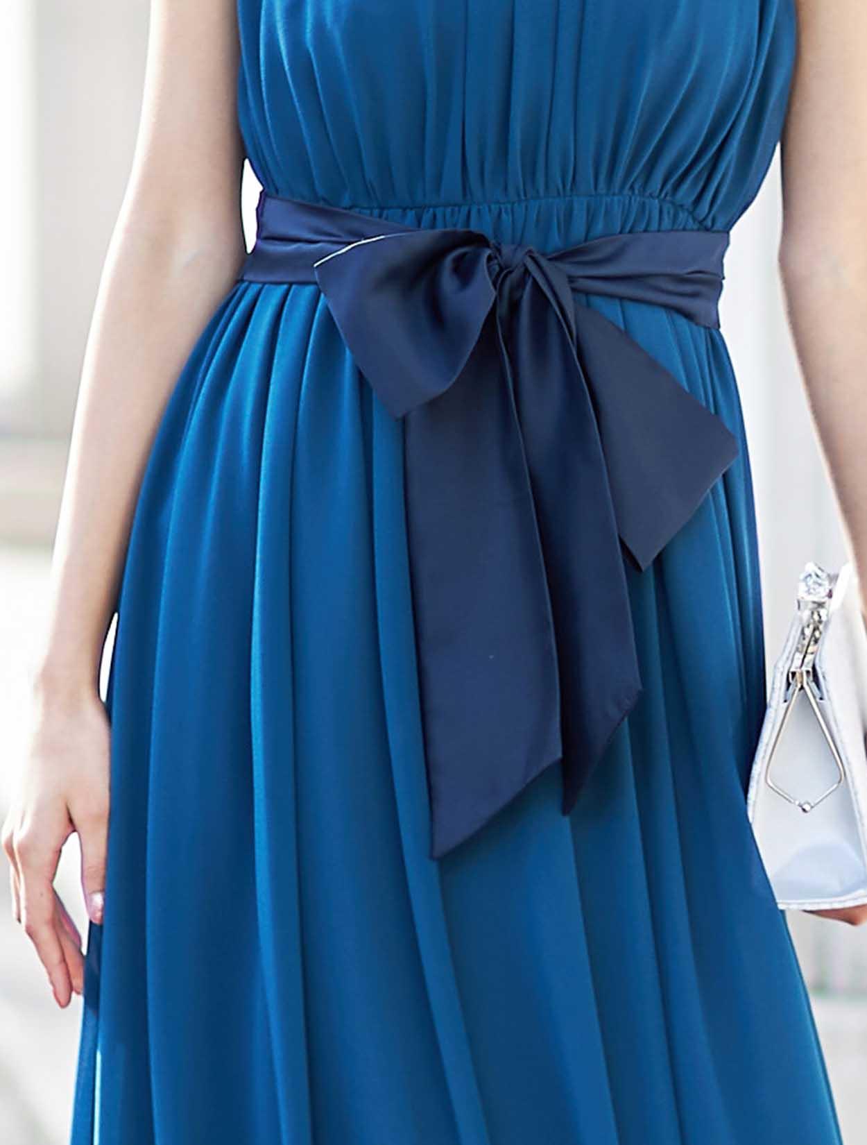 少しグリーンがかった綺麗なブルーのドレスは、落ち着いた色のドレスをお探しの方にもおすすめです。ウエストリボンはドレスよりも濃い目のブルーなので、ウエストもスッキリと見せてくれます。