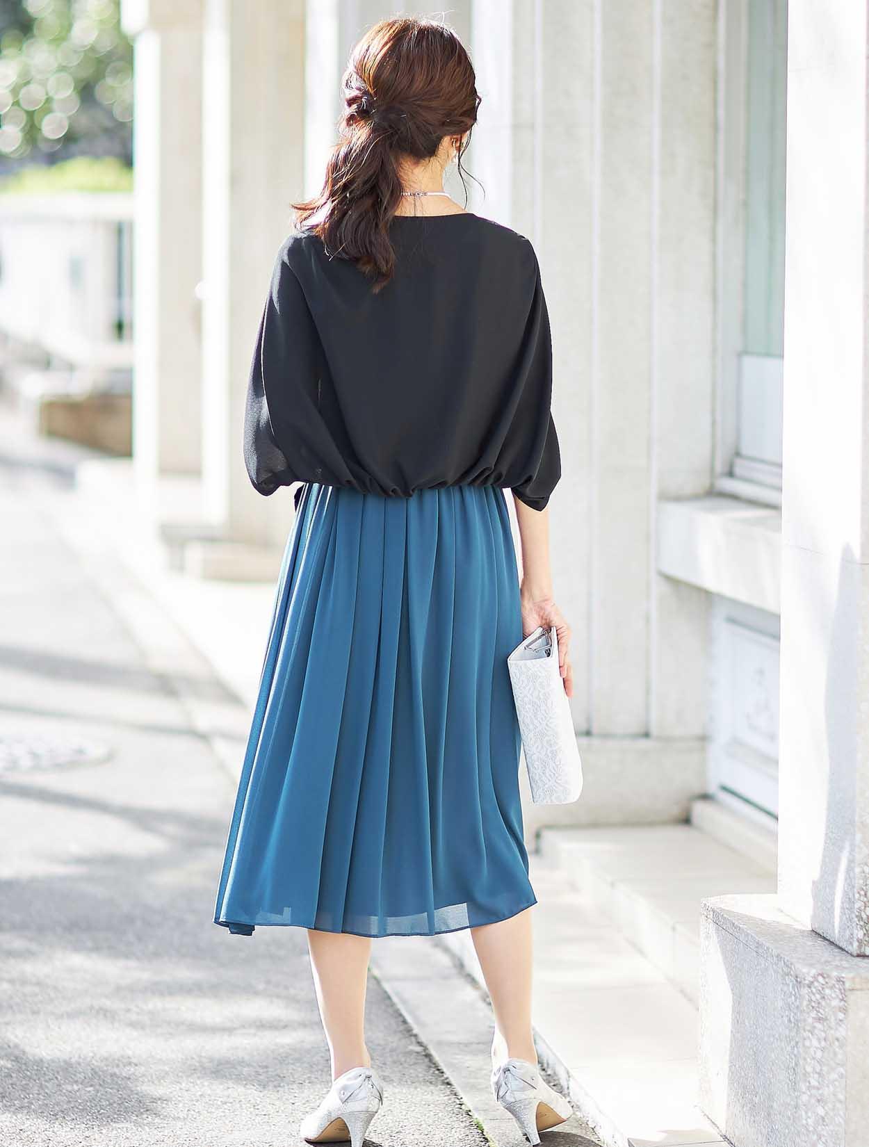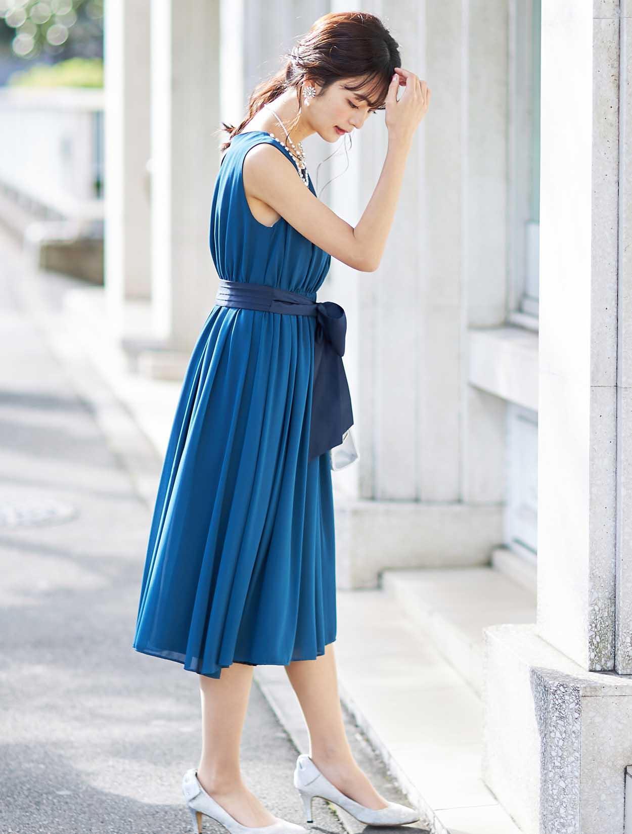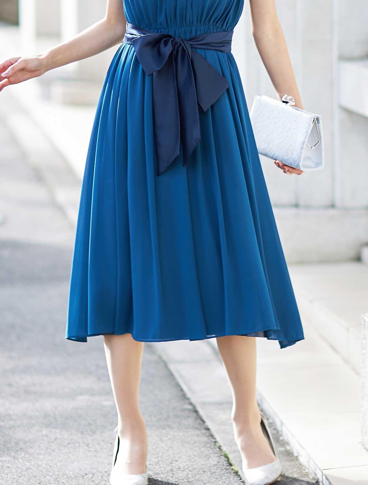 きれい目ブルーのギャザーたっぷりミモレ丈ドレス