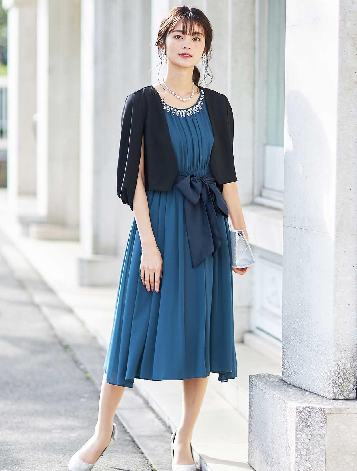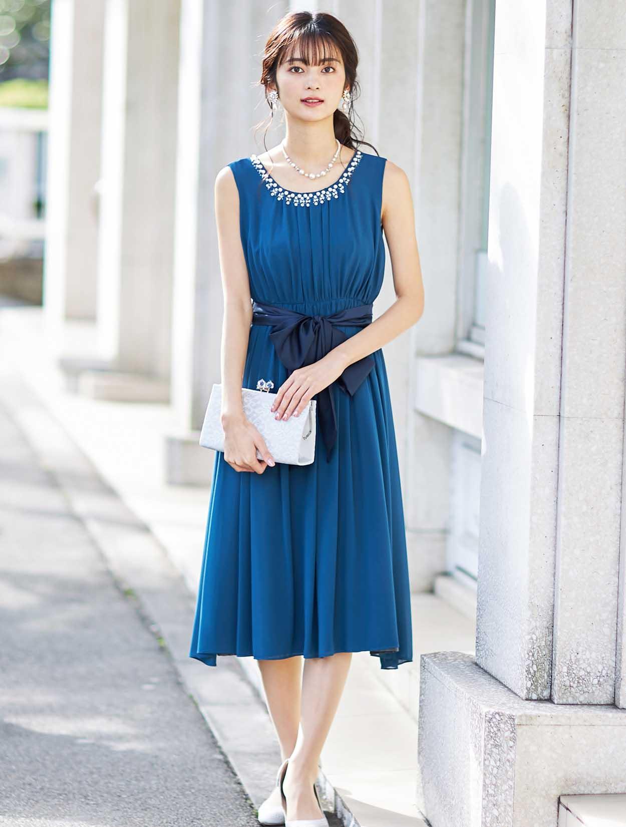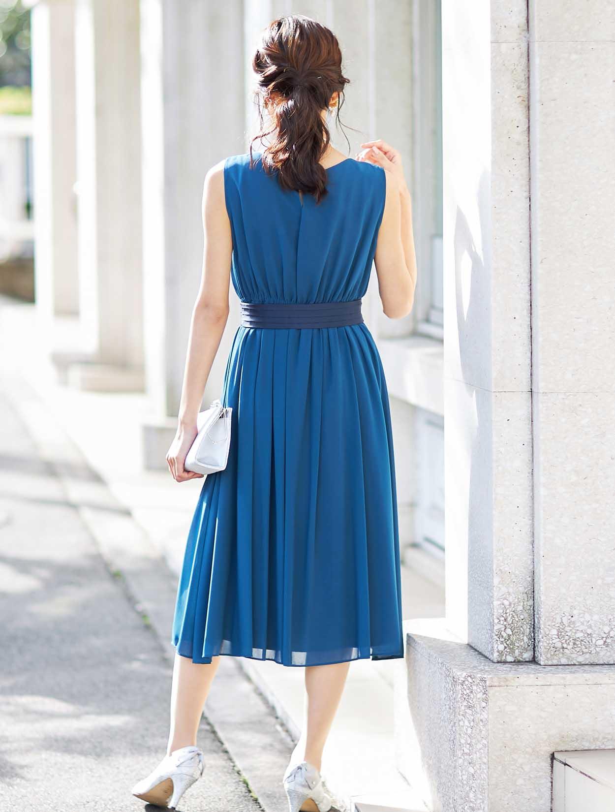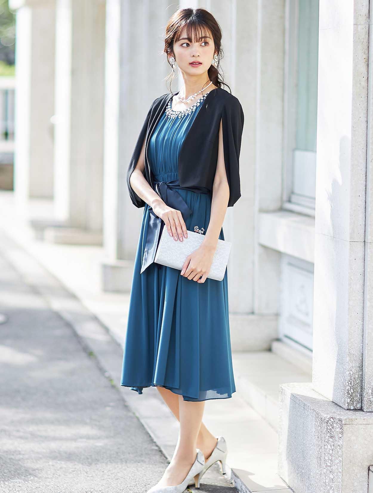 きれい目ブルーのギャザーたっぷりミモレ丈ドレス