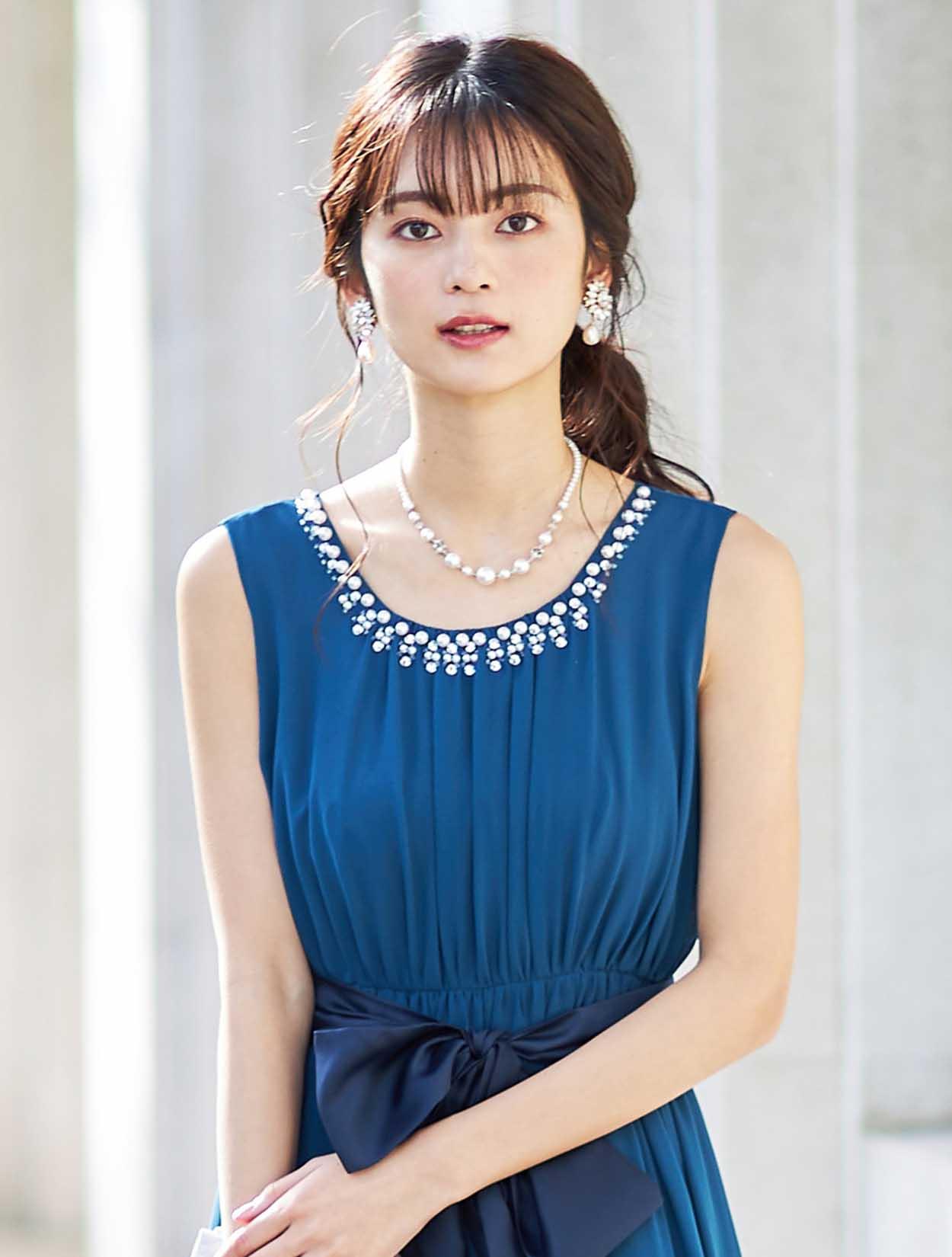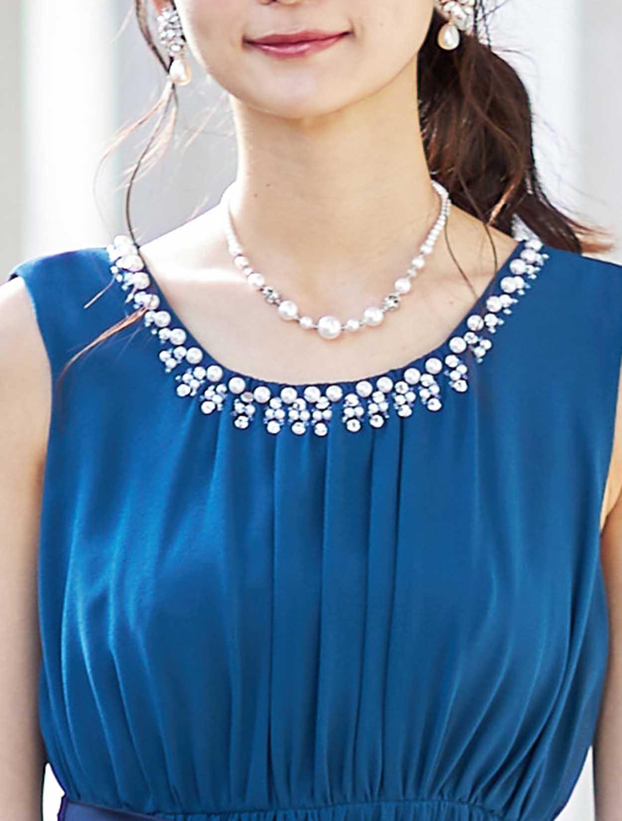 襟元にパールのあるドレスなので、ネックレスはシンプルなものがおすすめ◎