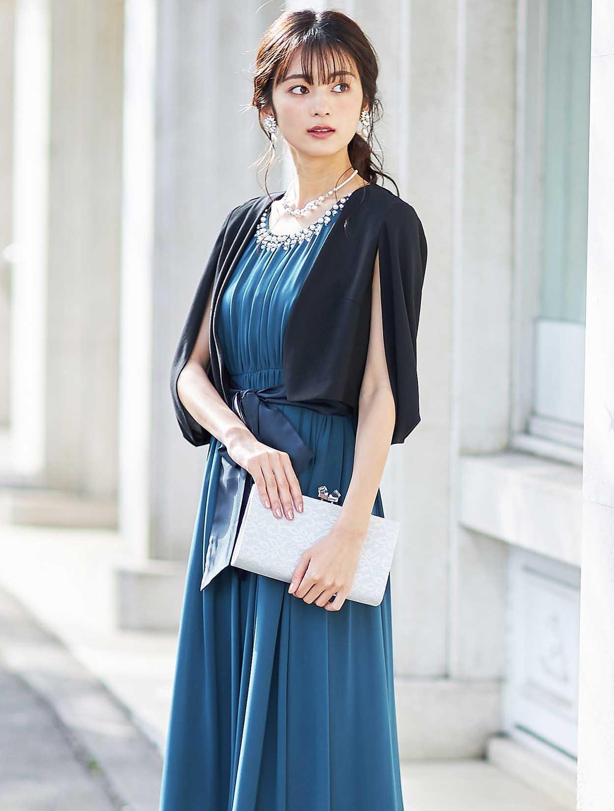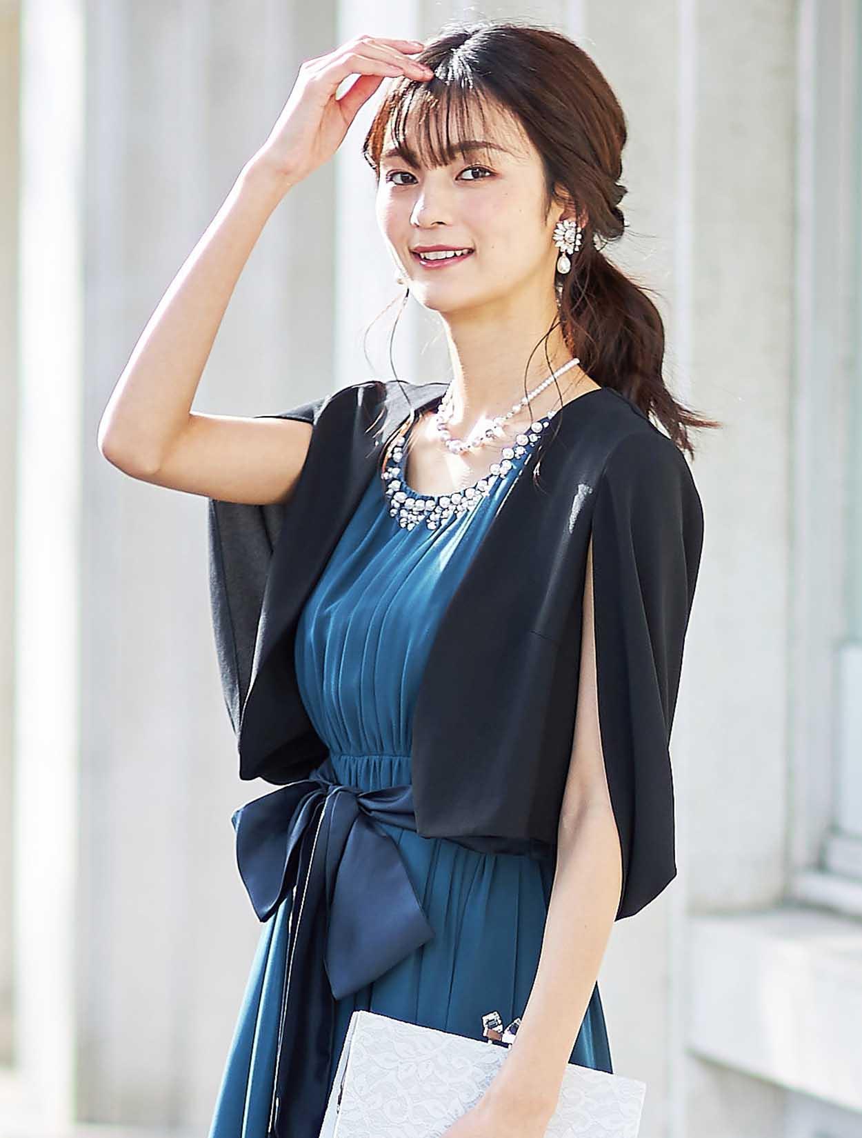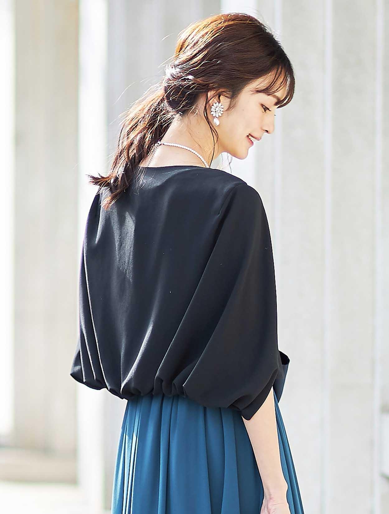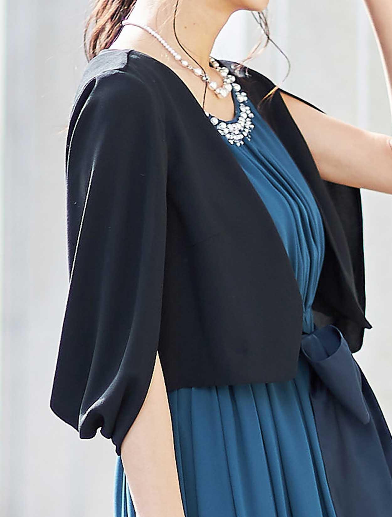 固い印象になりがちなブラックのジャケットボレロは、ケープ風のデザインで後ろ姿が素敵な一枚。