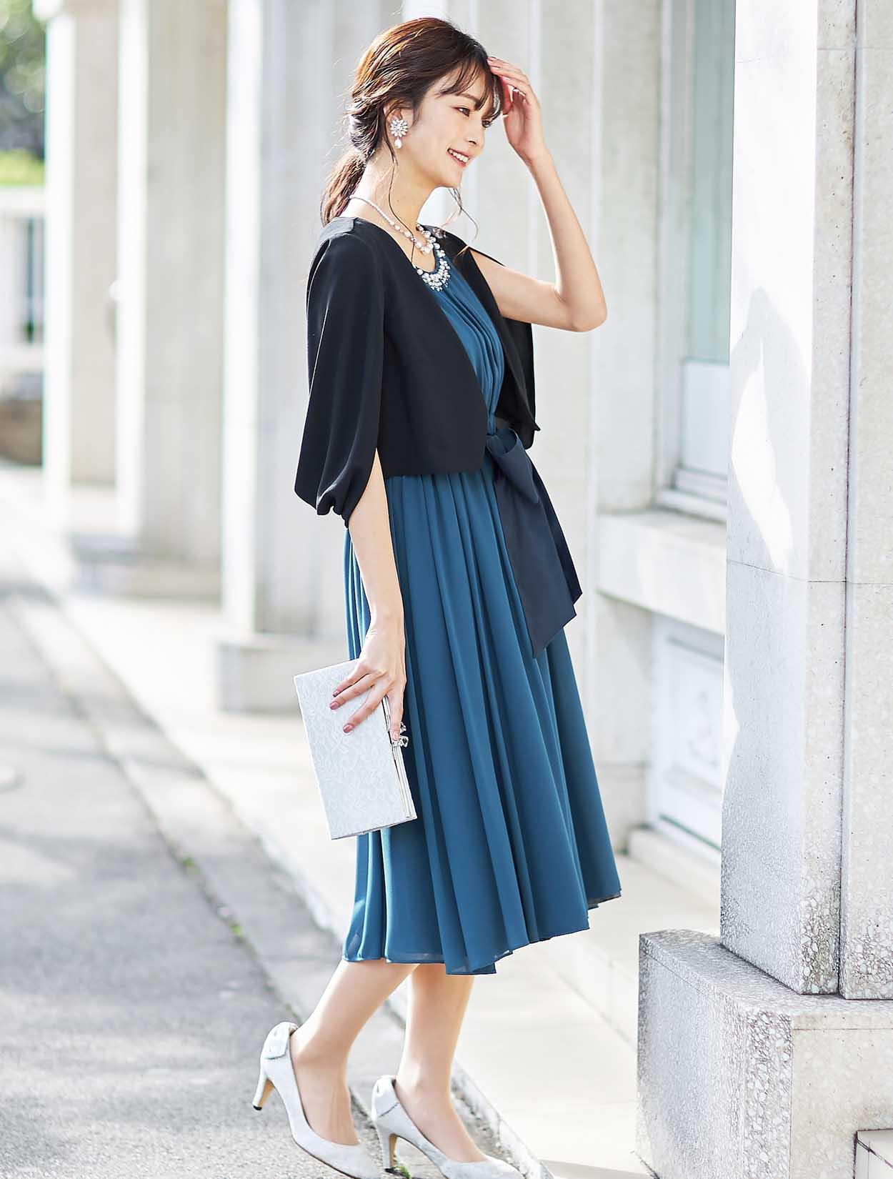 クールなジャケットボレロを合わせた、大人なフェミニンコーディネート。