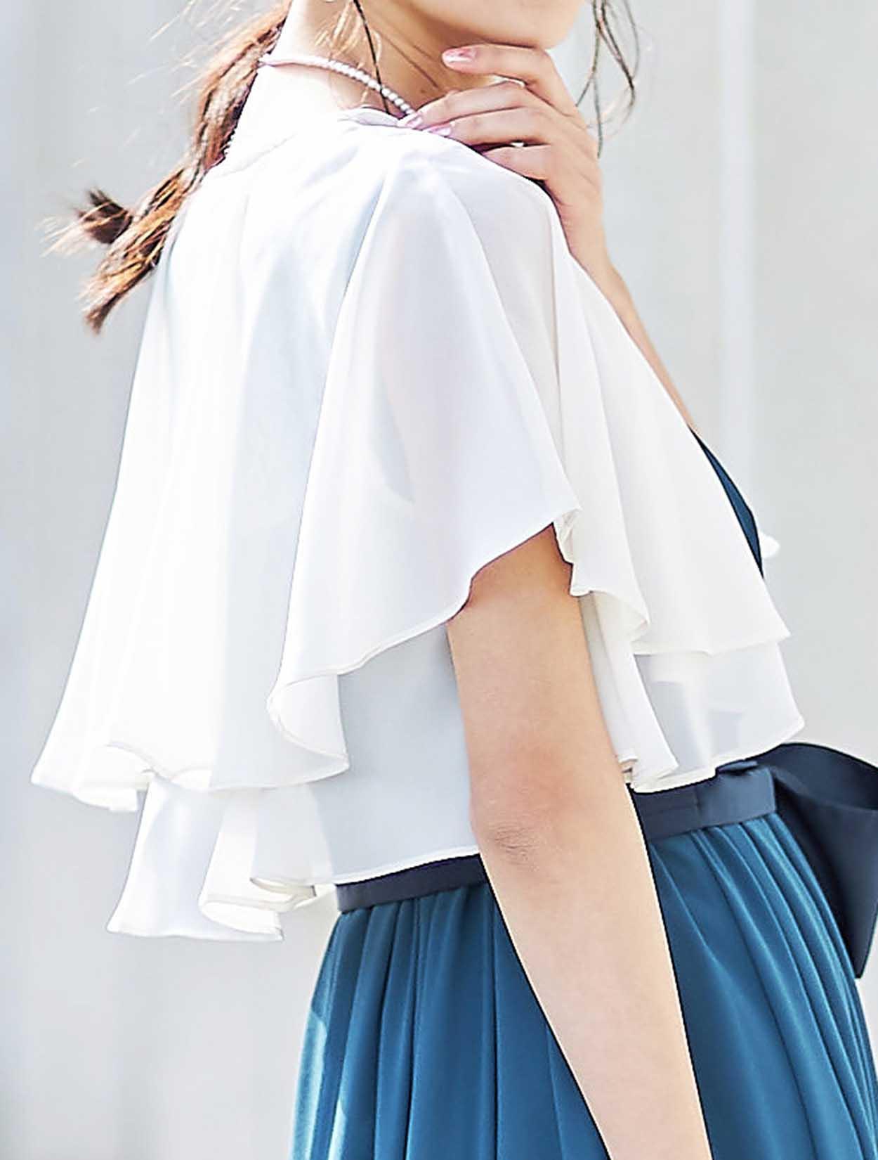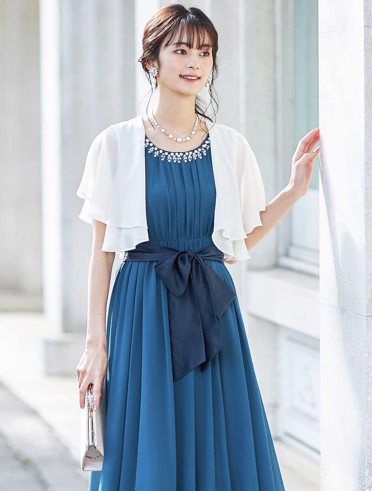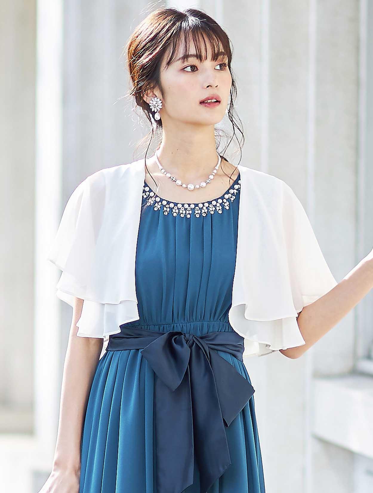 透け感が綺麗なベージュのボレロが、ドレスのブルーを引き立てて爽やかな印象に。