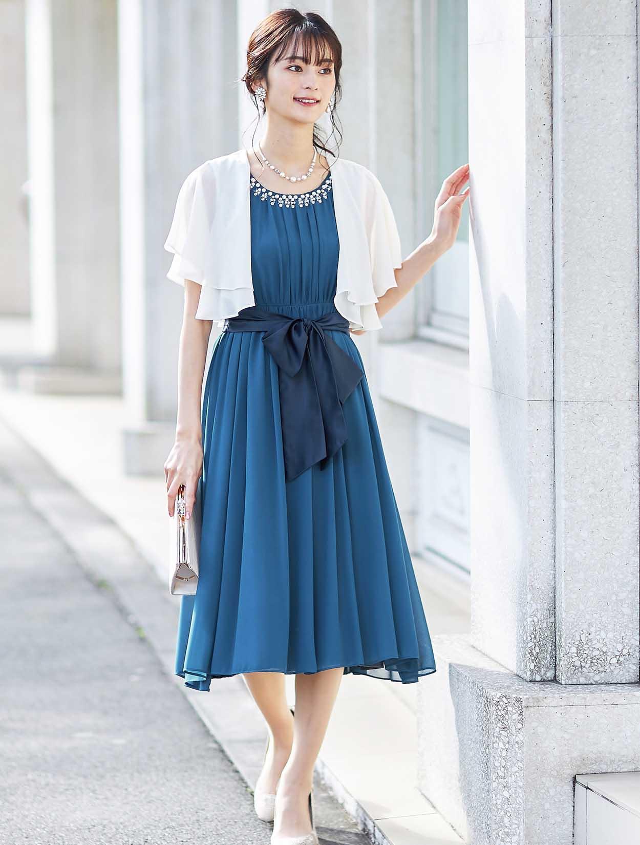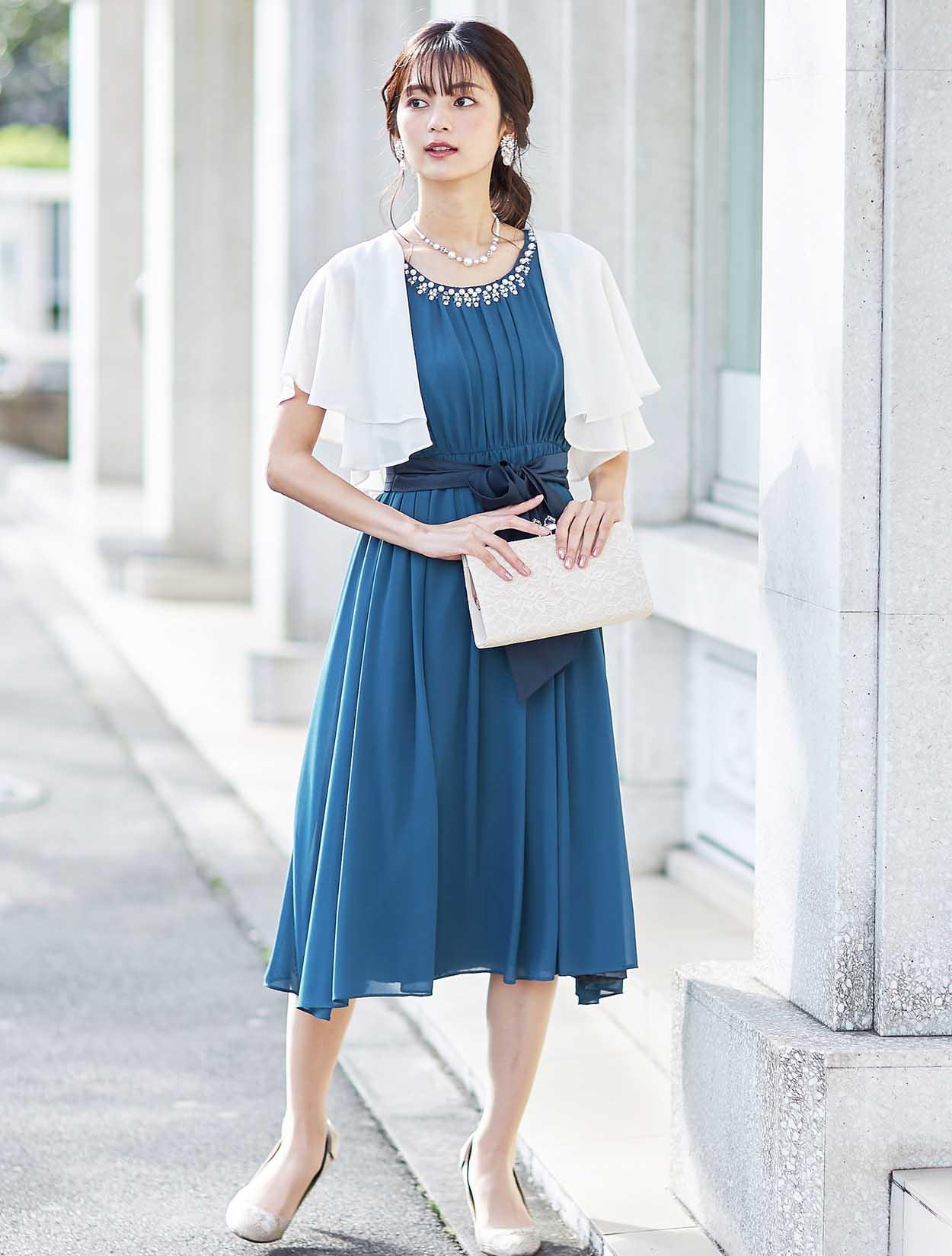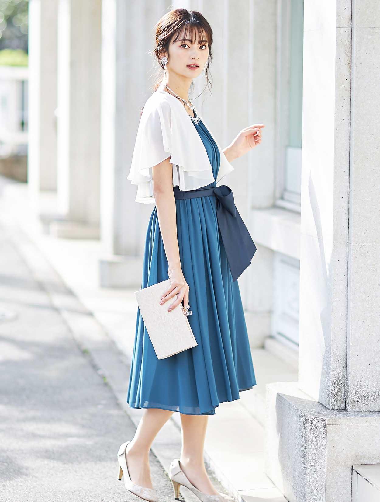 透け感が綺麗なベージュのボレロが、ドレスのブルーを引き立てて爽やかな印象に。