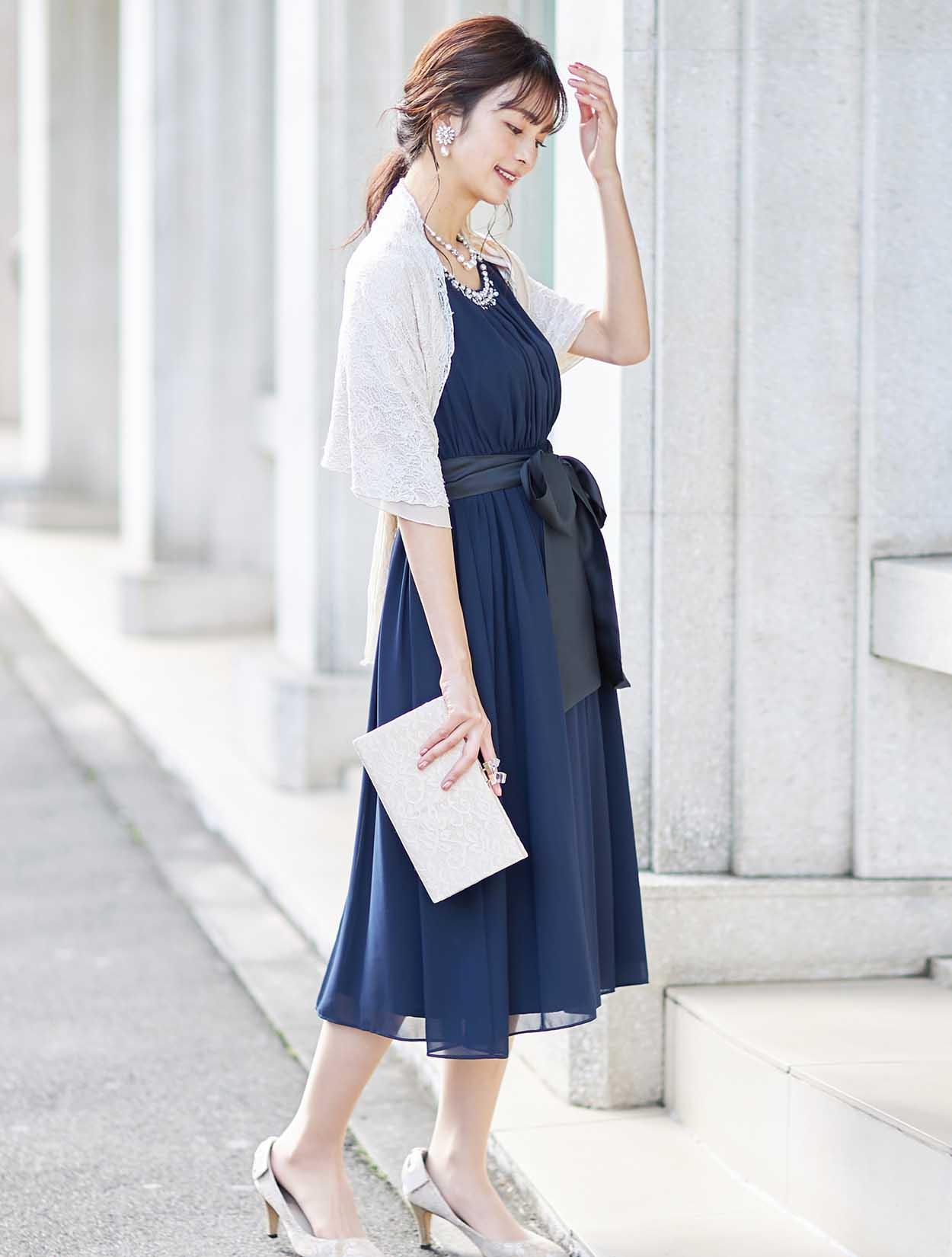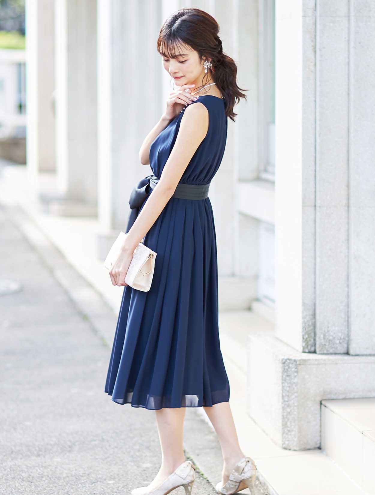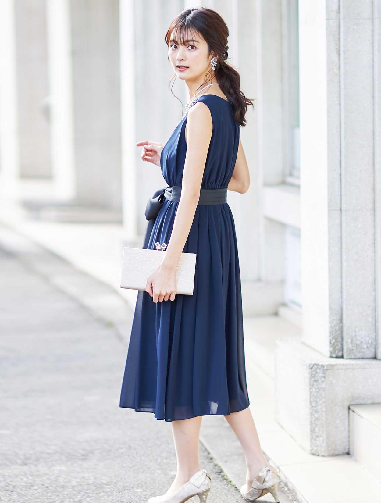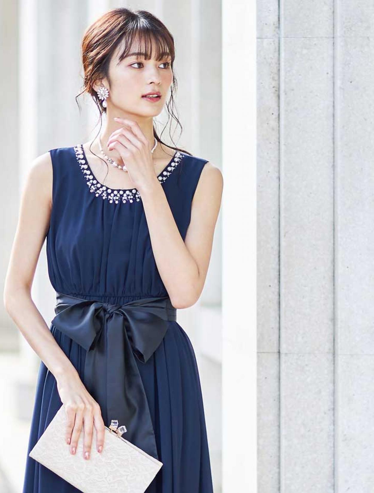 華やかな印象たっぷりのネイビードレスは、おめでたい席にもおすすめの万能ドレスです。