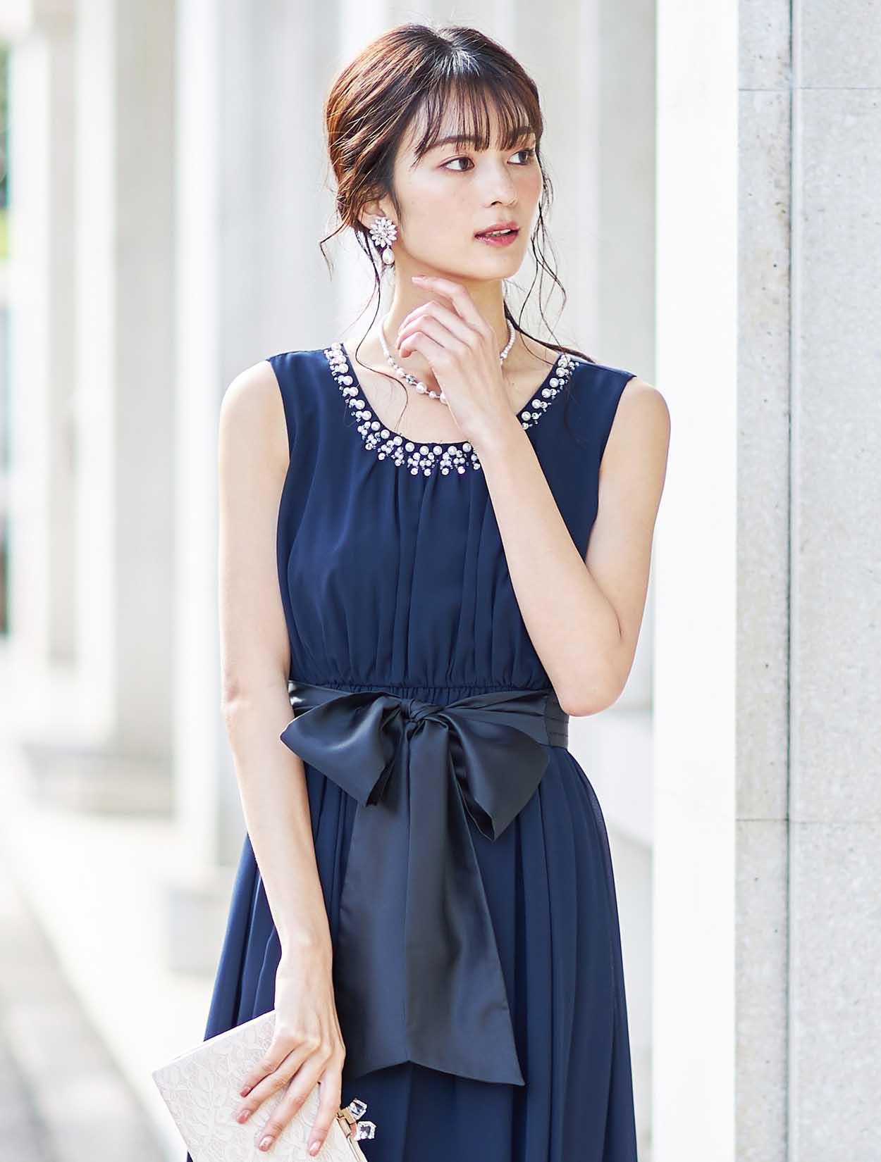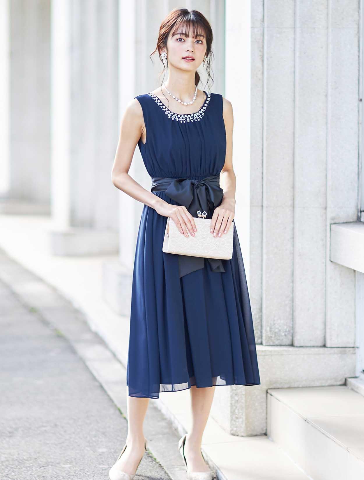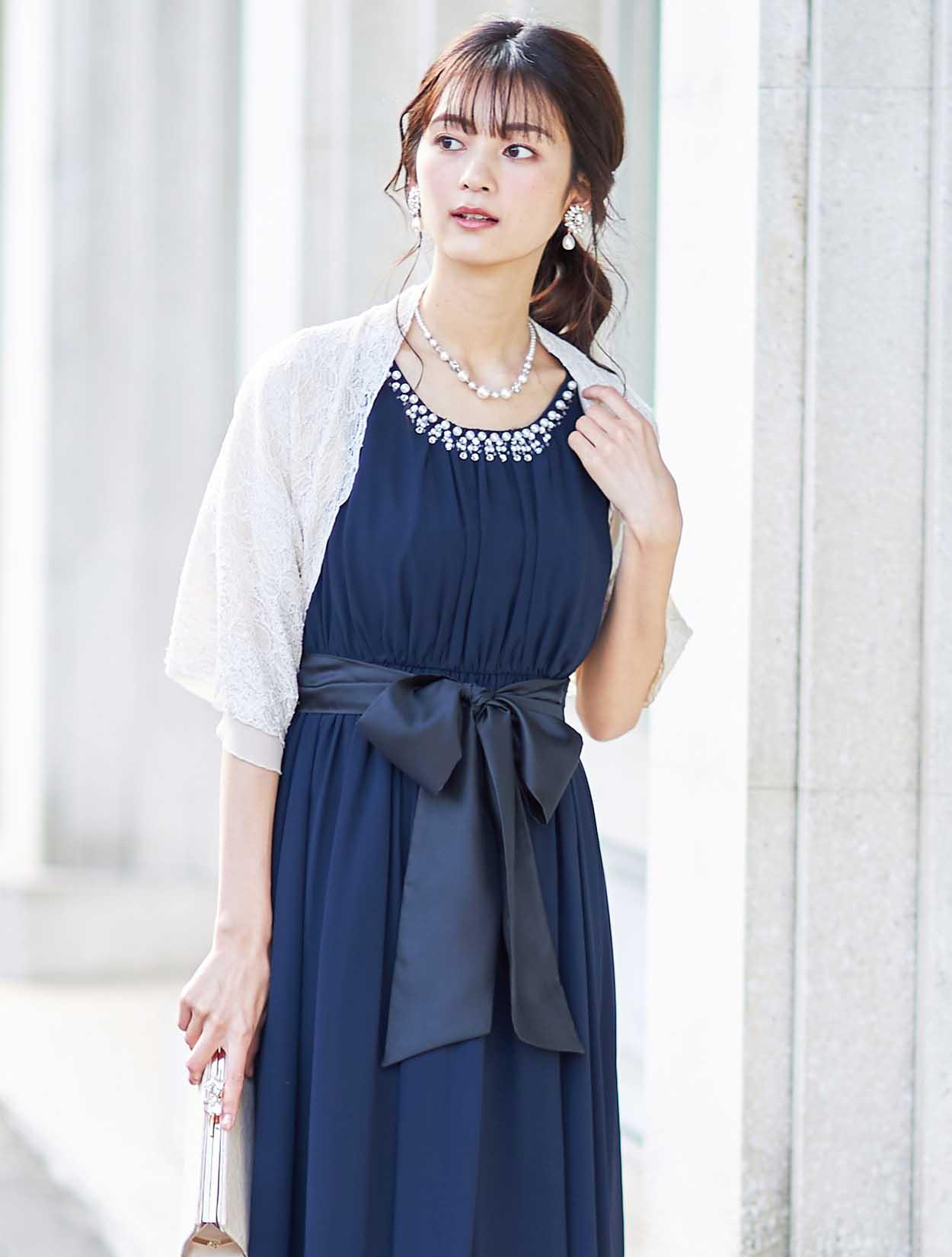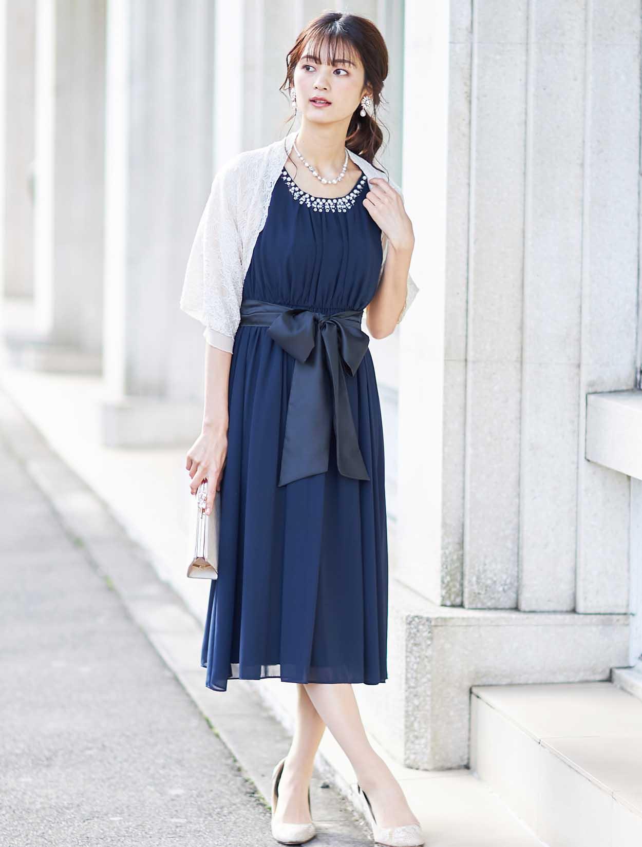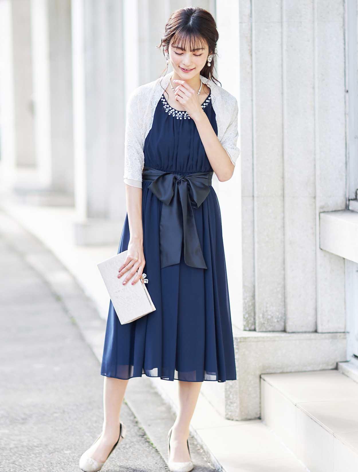 華やかな印象たっぷりのネイビードレスは、おめでたい席にもおすすめの万能ドレスです。