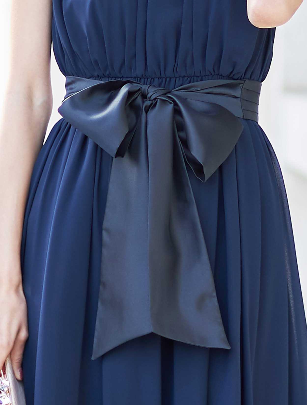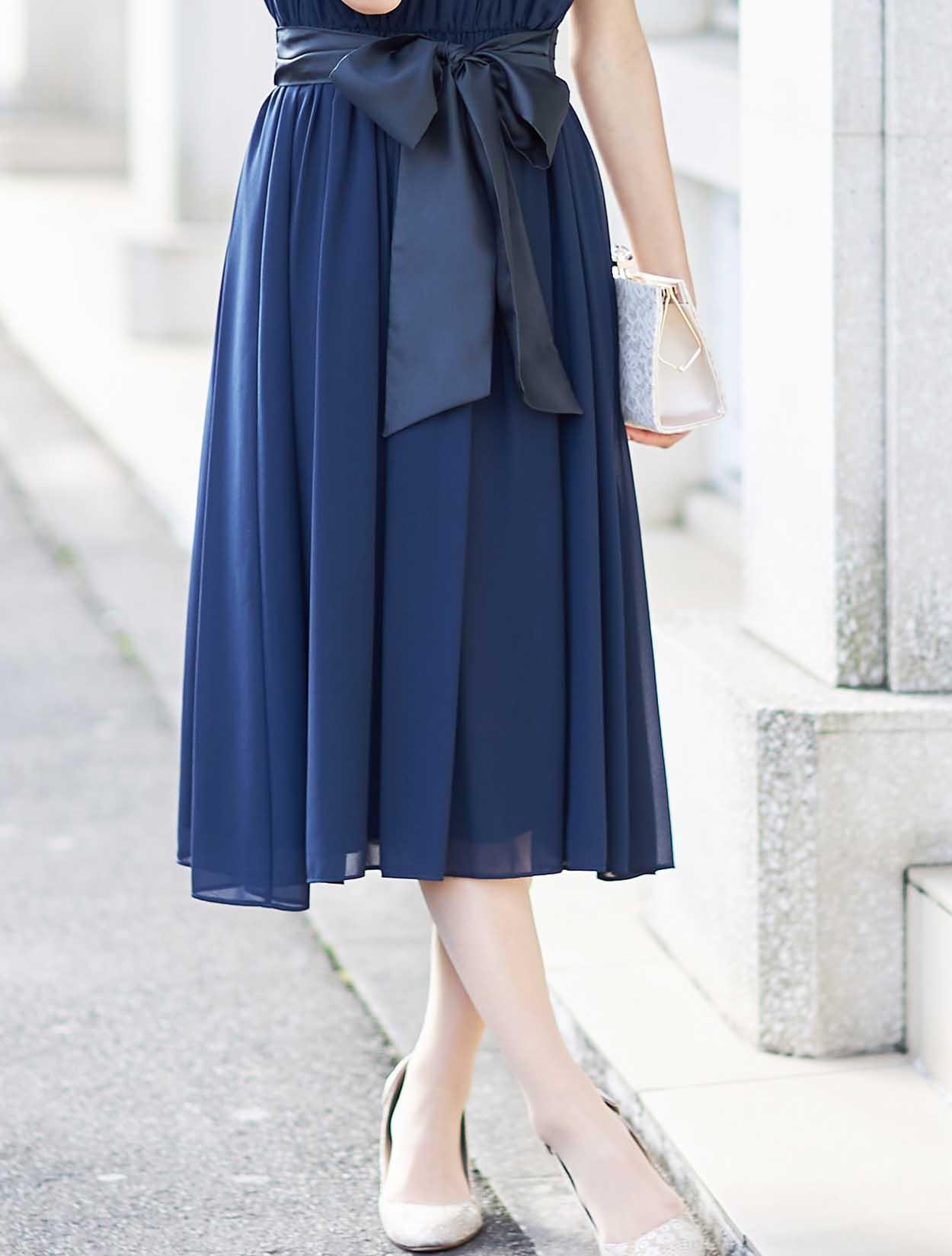 大きなウエストリボンで可愛いさup!ギャザーだっぷりミモレ丈ドレス