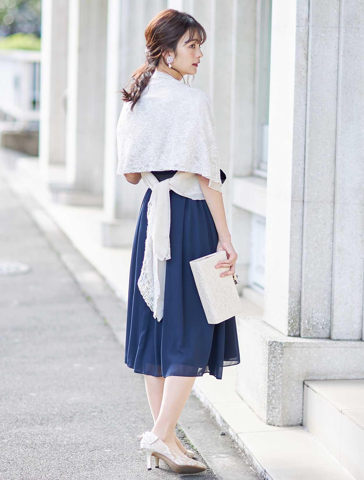 優し気なふんわりショールを合わせた、フォーマル感溢れるコーディネート。